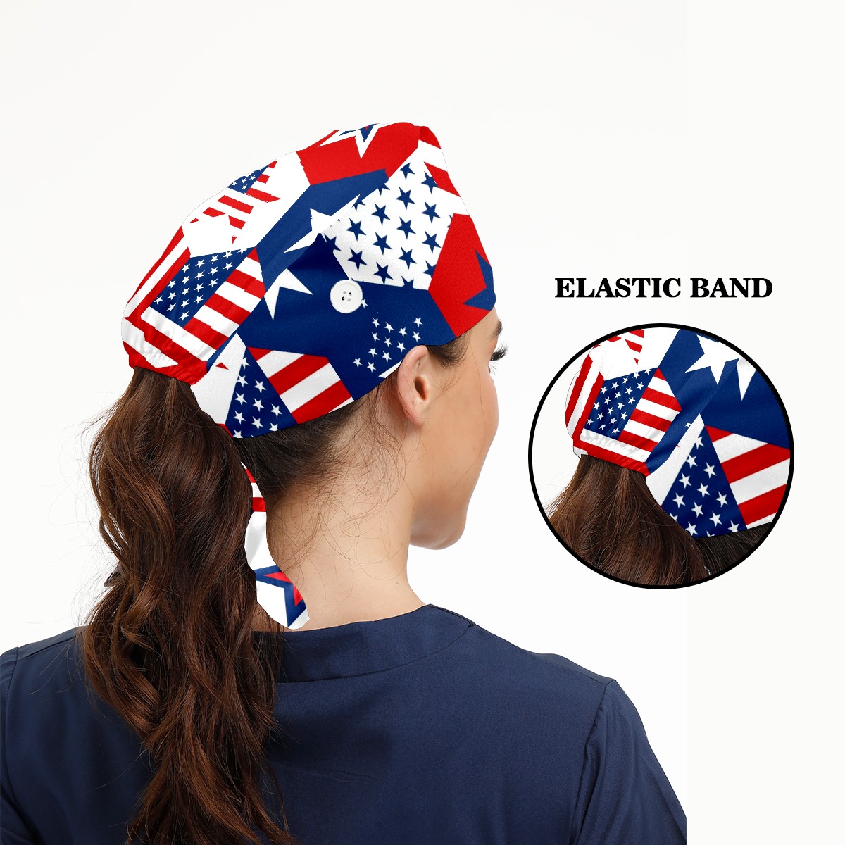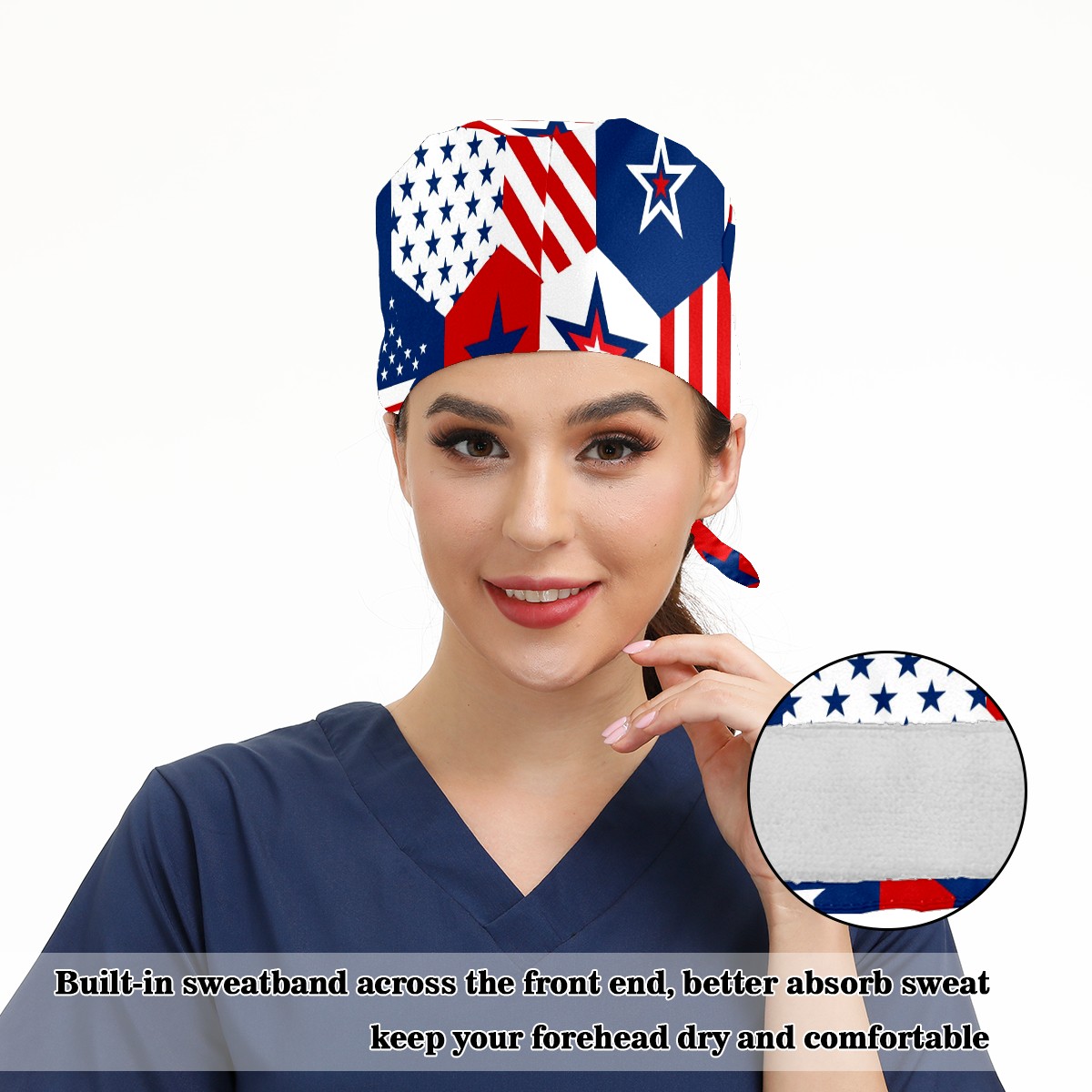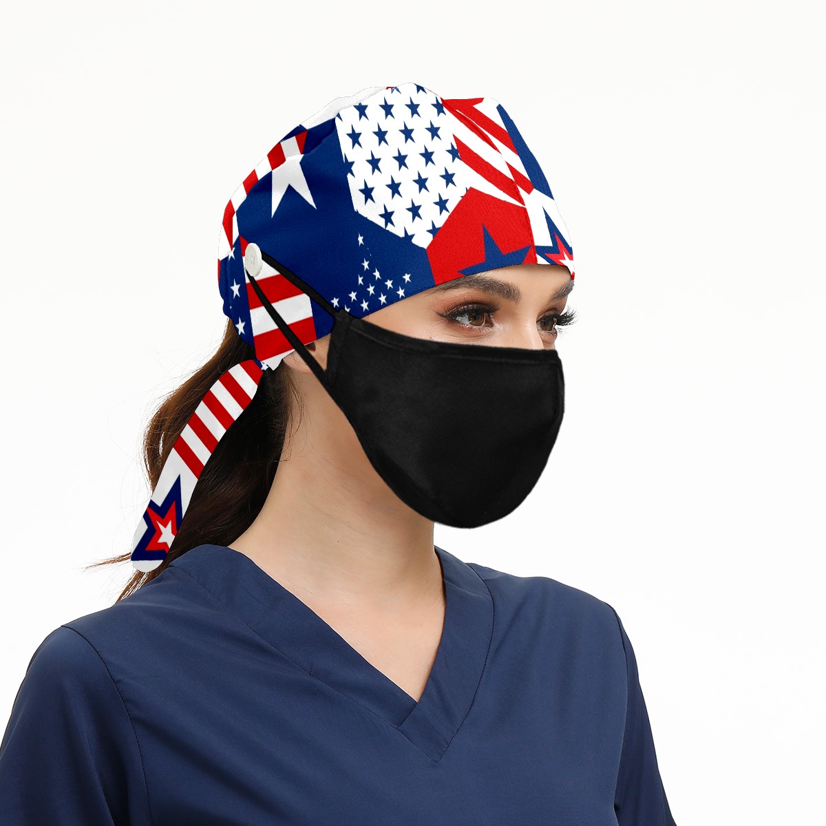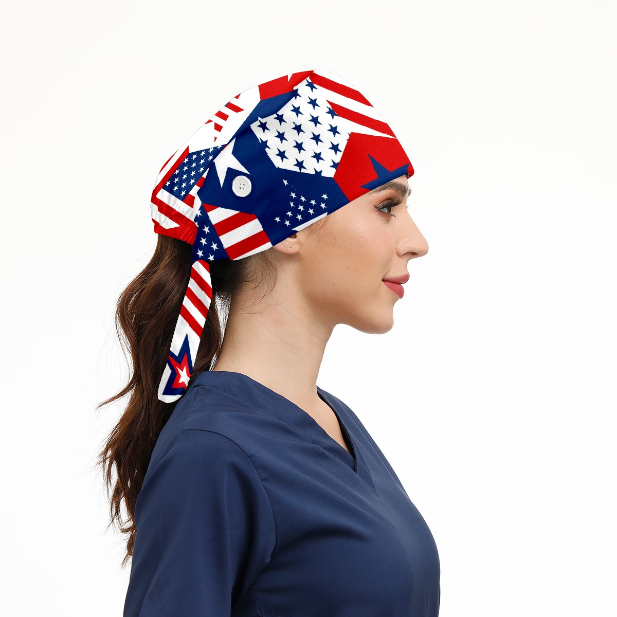 Working Caps with Button & Sweatband Satin Lined Cotton Adjustable Nurse Hats Elastic Band Scrub Cap Surgeon Hat American Stars USA Flag