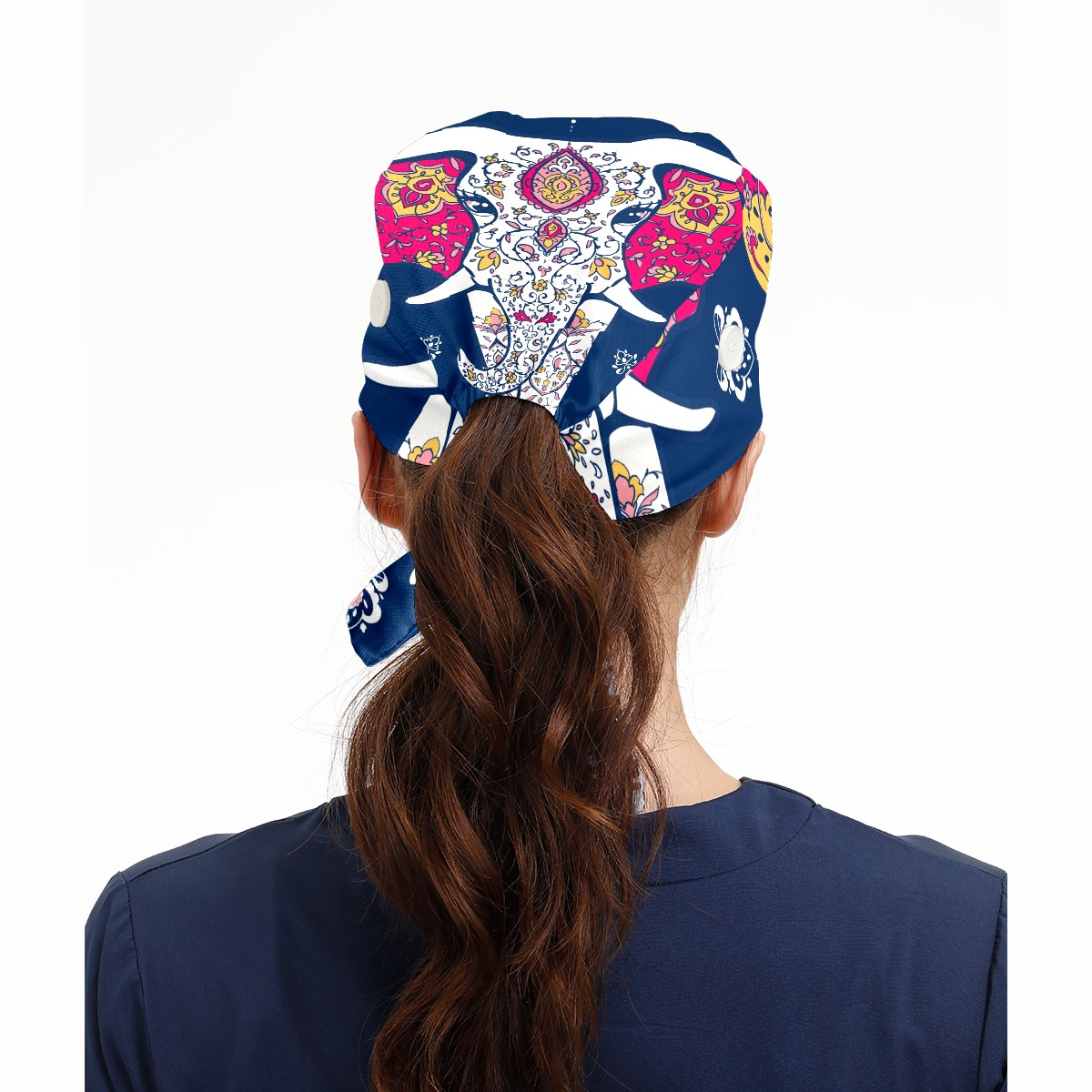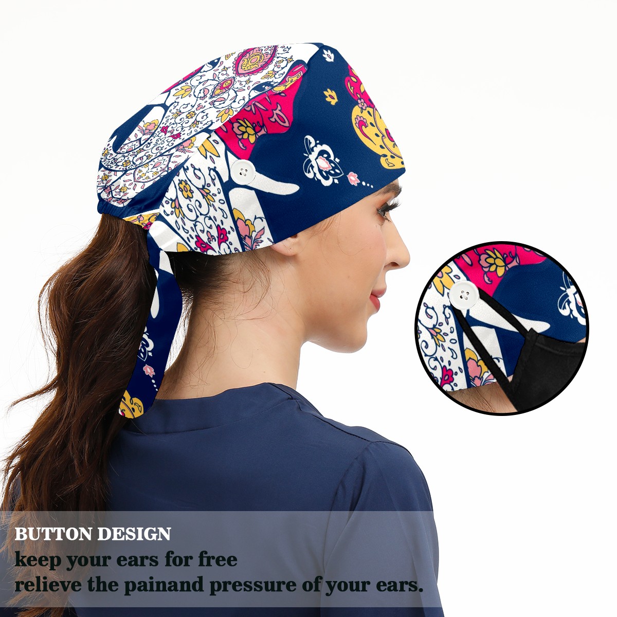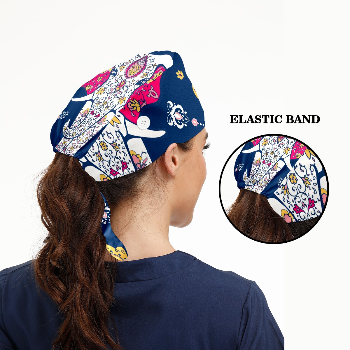 Working Caps with Button & Sweatband Satin Lined Cotton Adjustable Nurse Hats Elastic Band Scrub Cap Surgeon Hat Mandala And Elephant