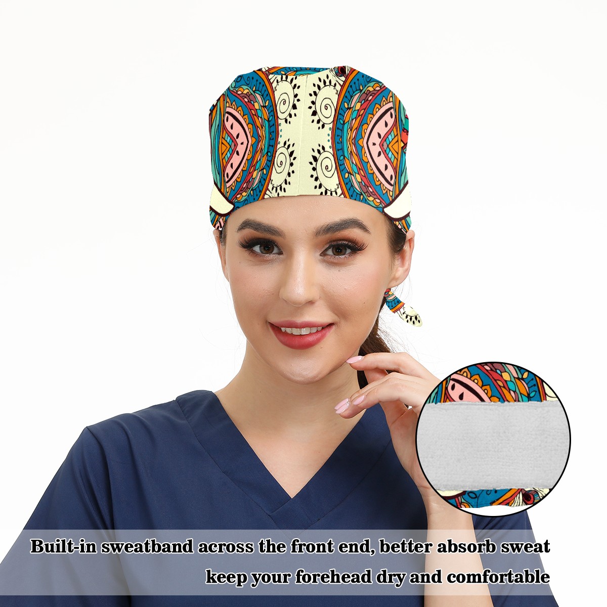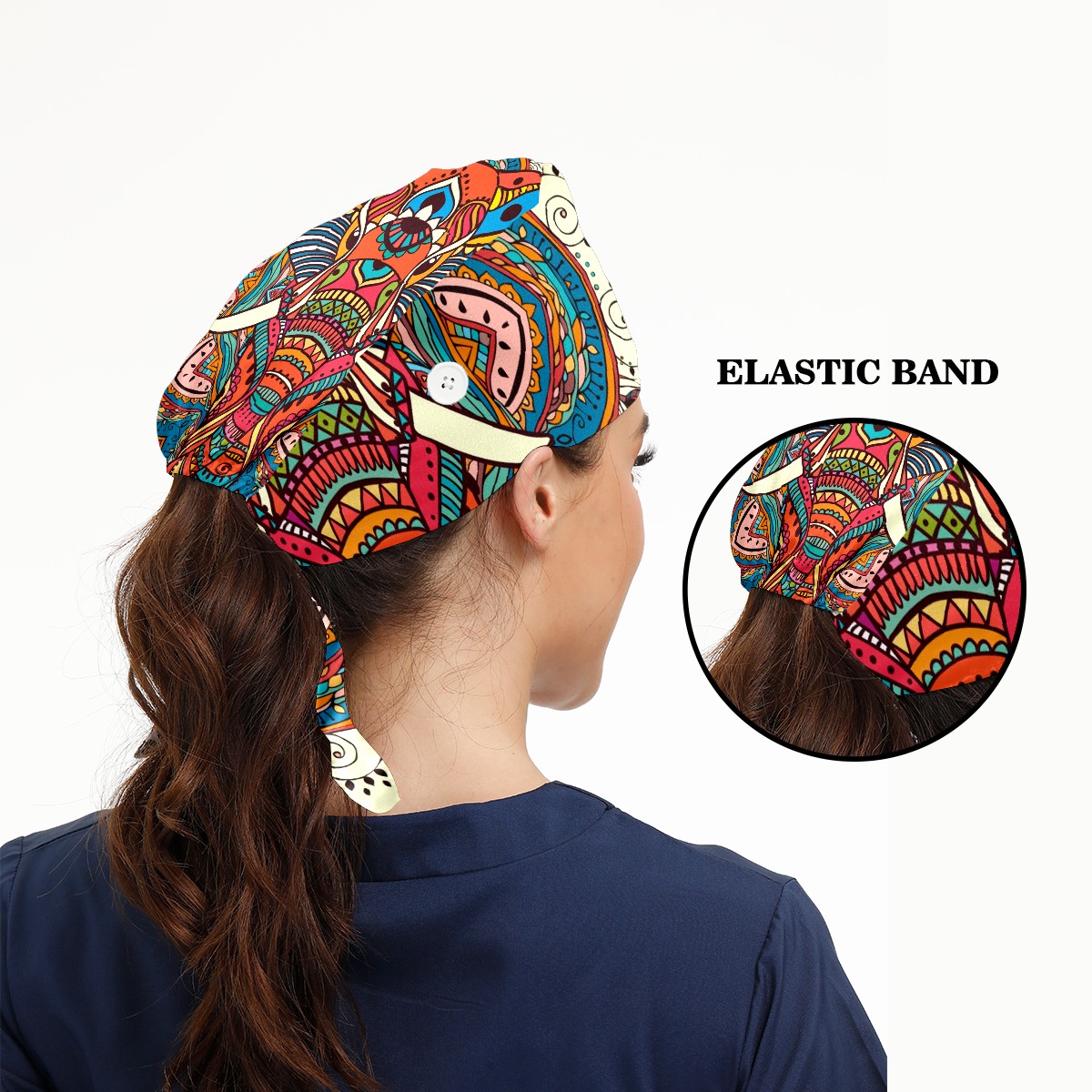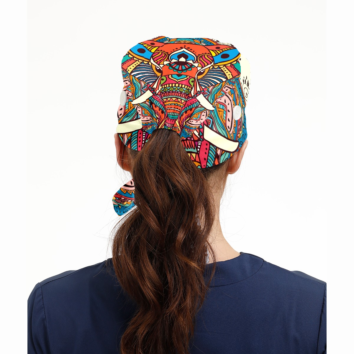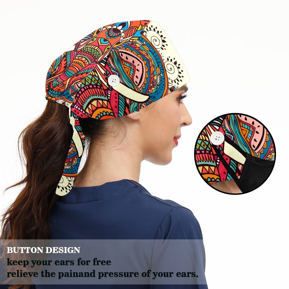 Working Caps with Button & Sweatband Satin Lined Cotton Adjustable Nurse Hats Elastic Band Scrub Cap Surgeon Hat Elephant Ethnic Pattern Decoration