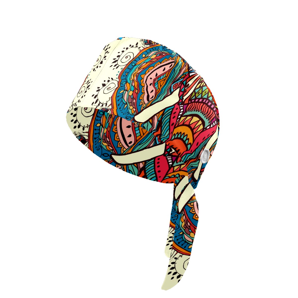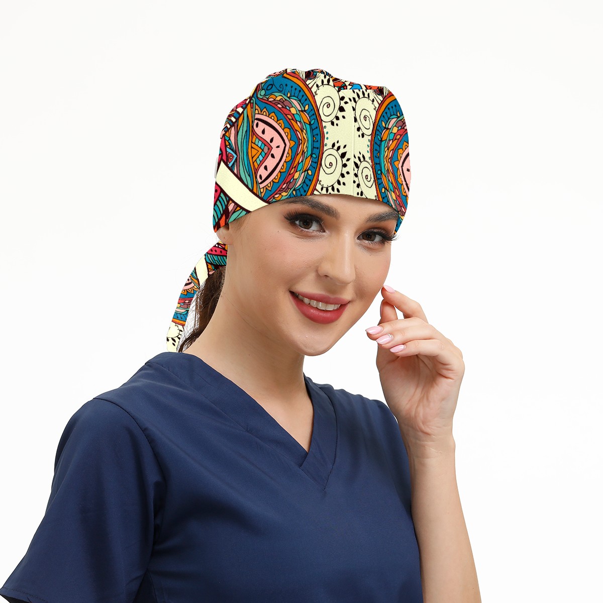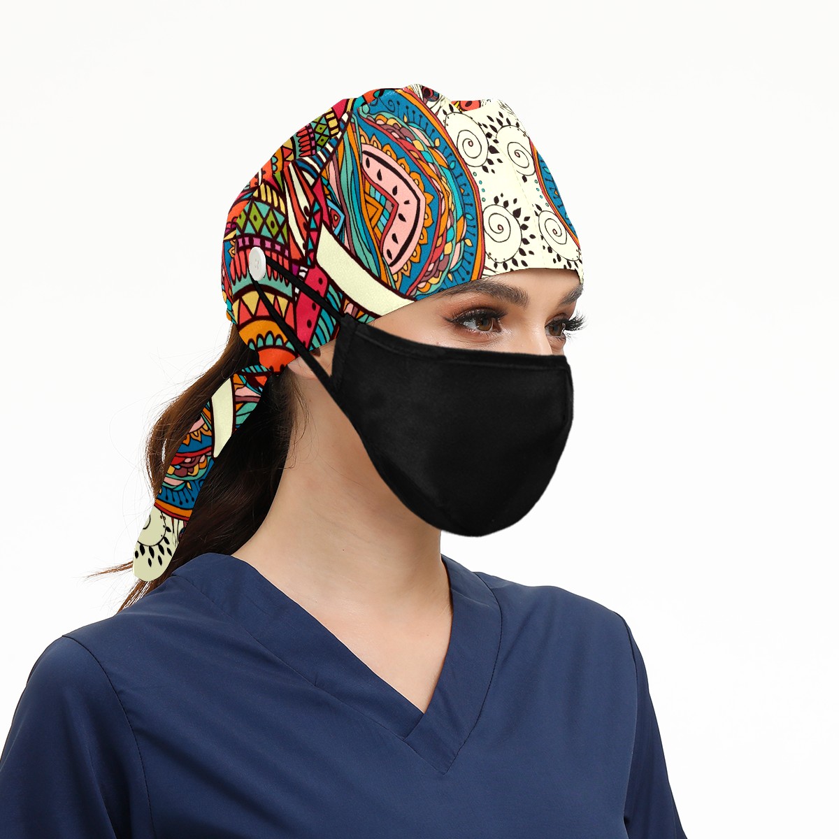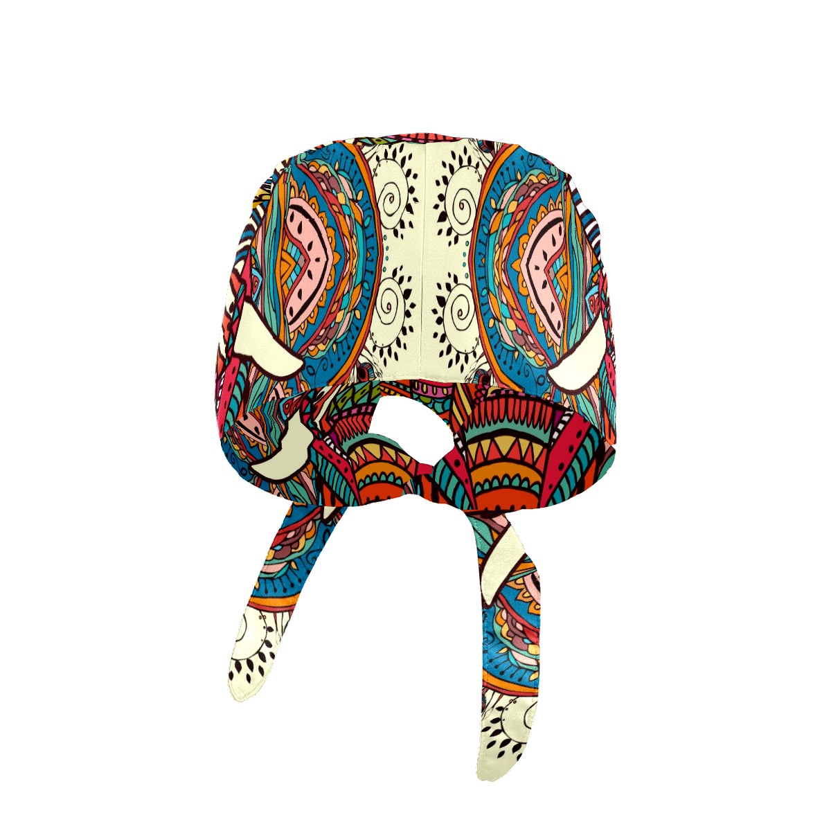 Working Caps with Button & Sweatband Satin Lined Cotton Adjustable Nurse Hats Elastic Band Scrub Cap Surgeon Hat Elephant Ethnic Pattern Decoration