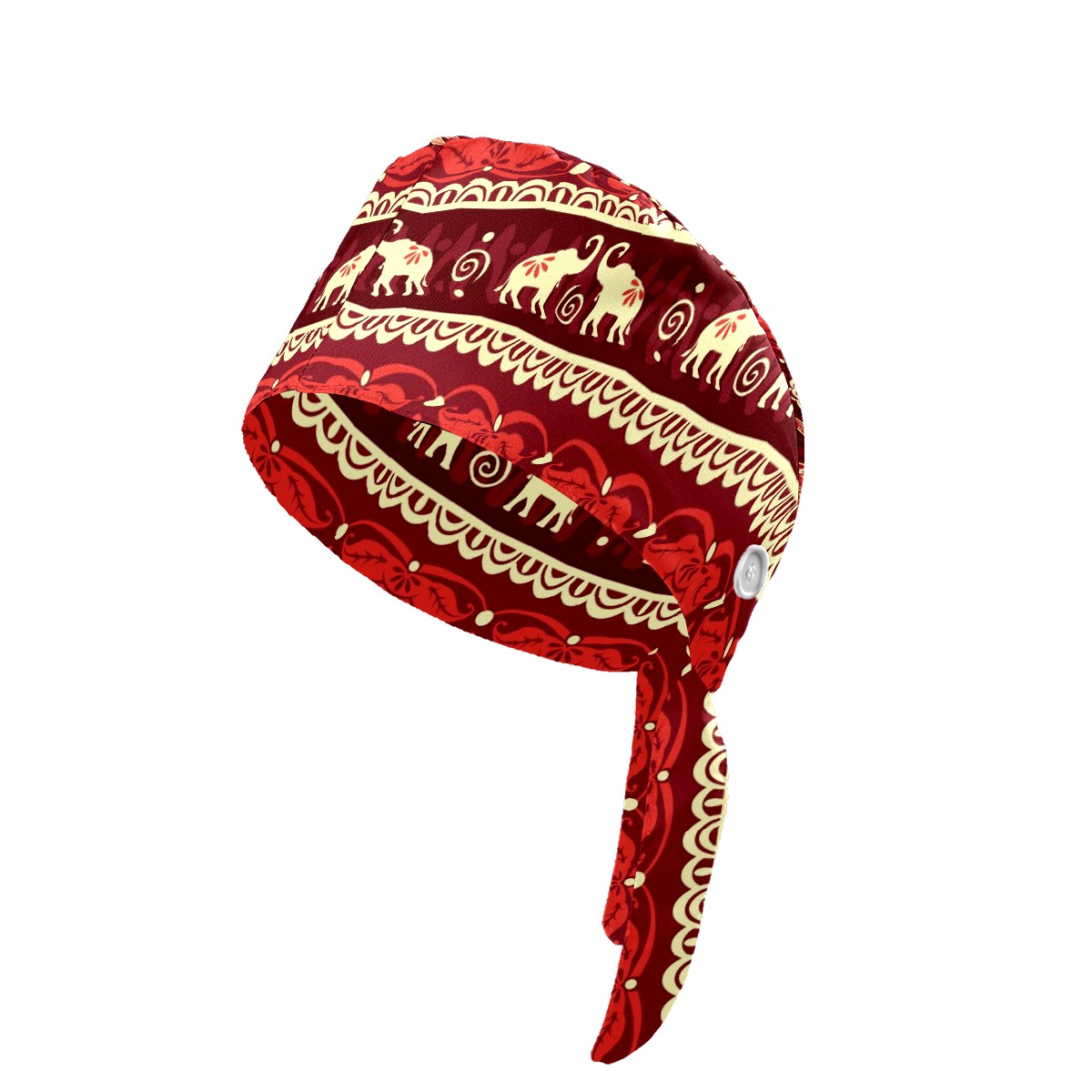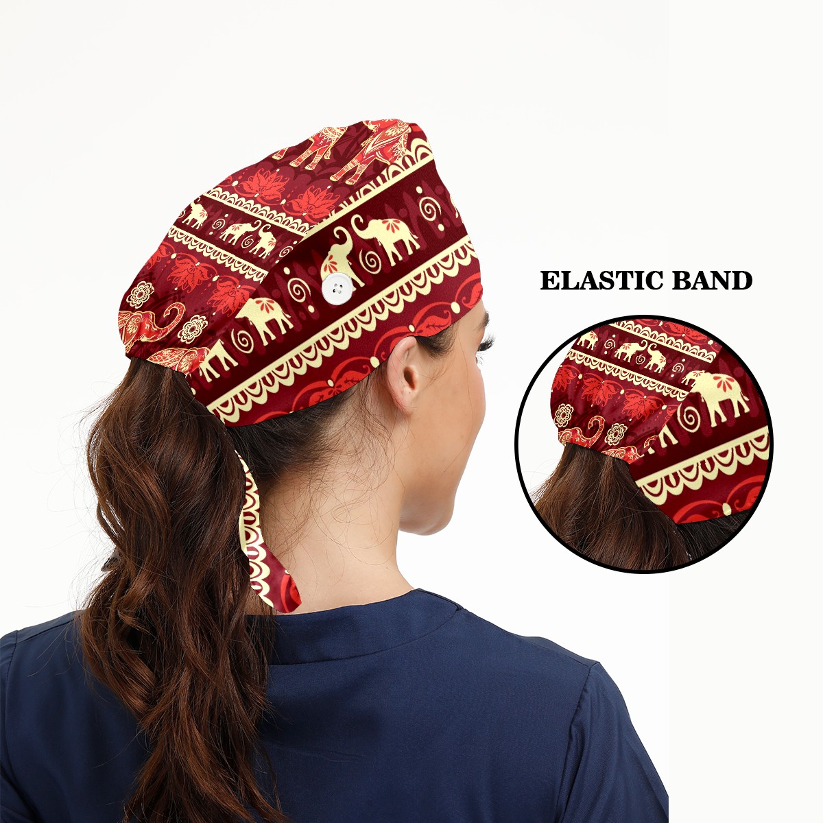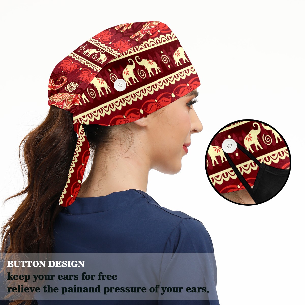 Working Caps with Button & Sweatband Satin Lined Cotton Adjustable Nurse Hats Elastic Band Scrub Cap Surgeon Hat Elephant Ethnic Flower