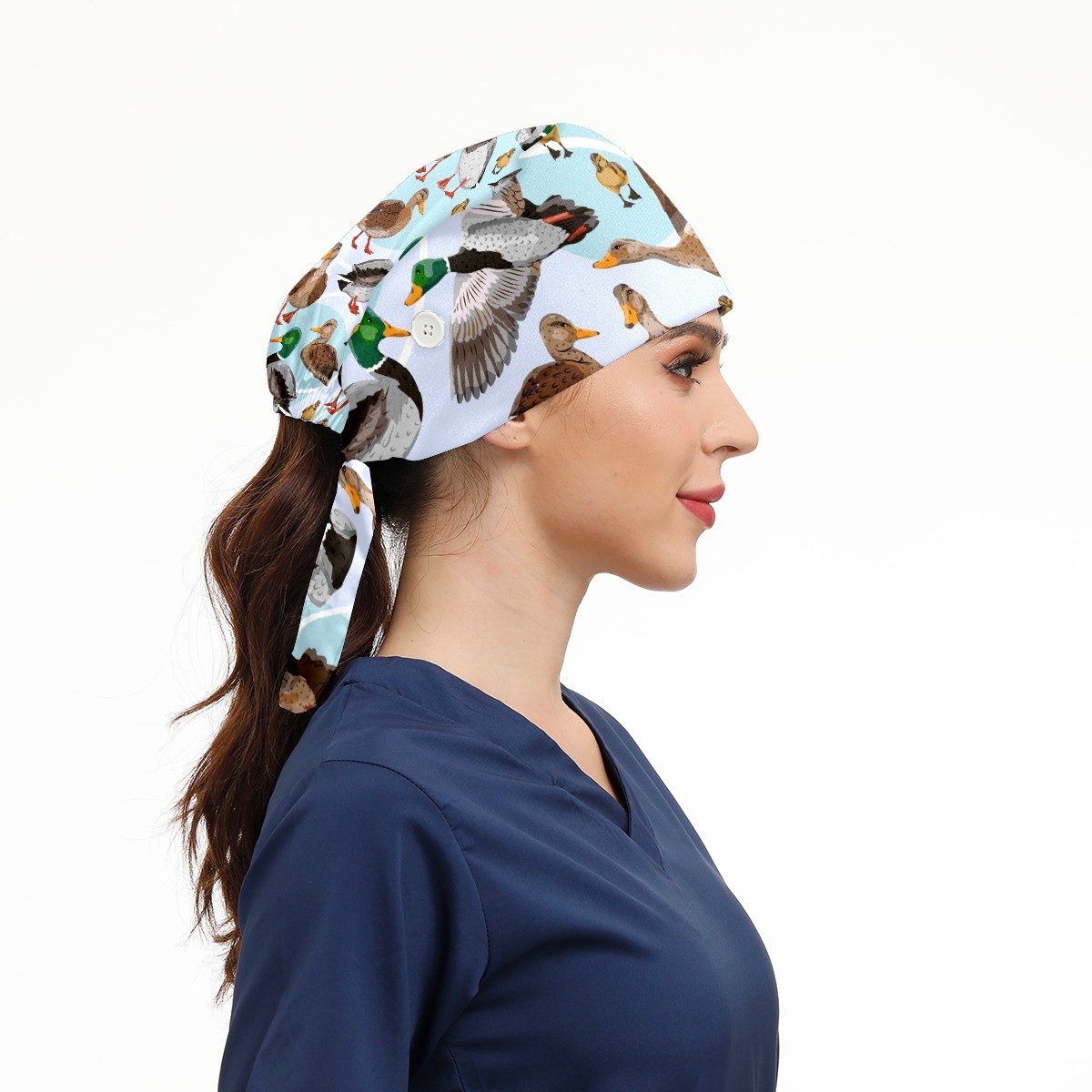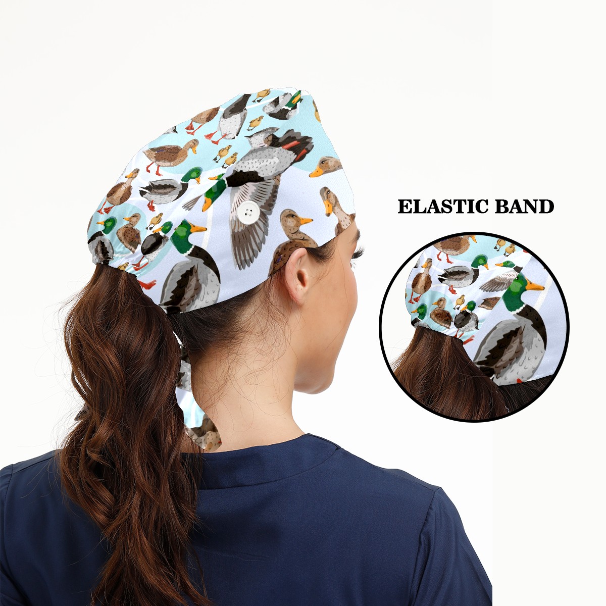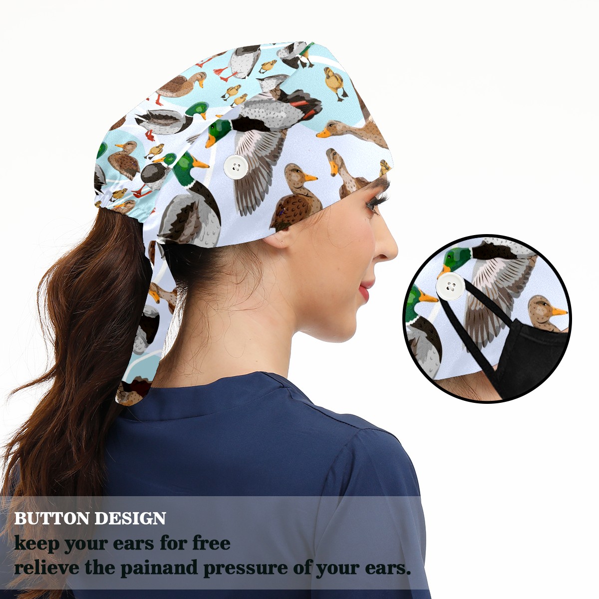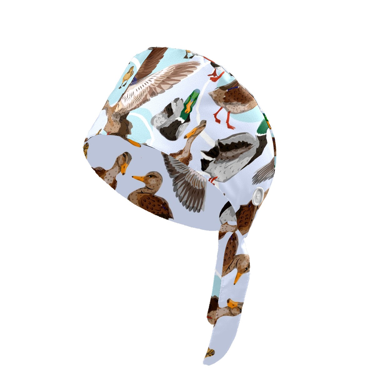 Working Caps with Button & Sweatband Satin Lined Cotton Adjustable Nurse Hats Elastic Band Scrub Cap Surgeon Hat Mallard Ducks Pattern