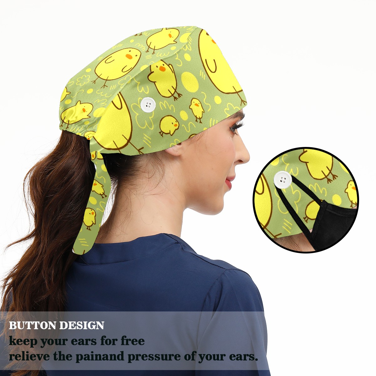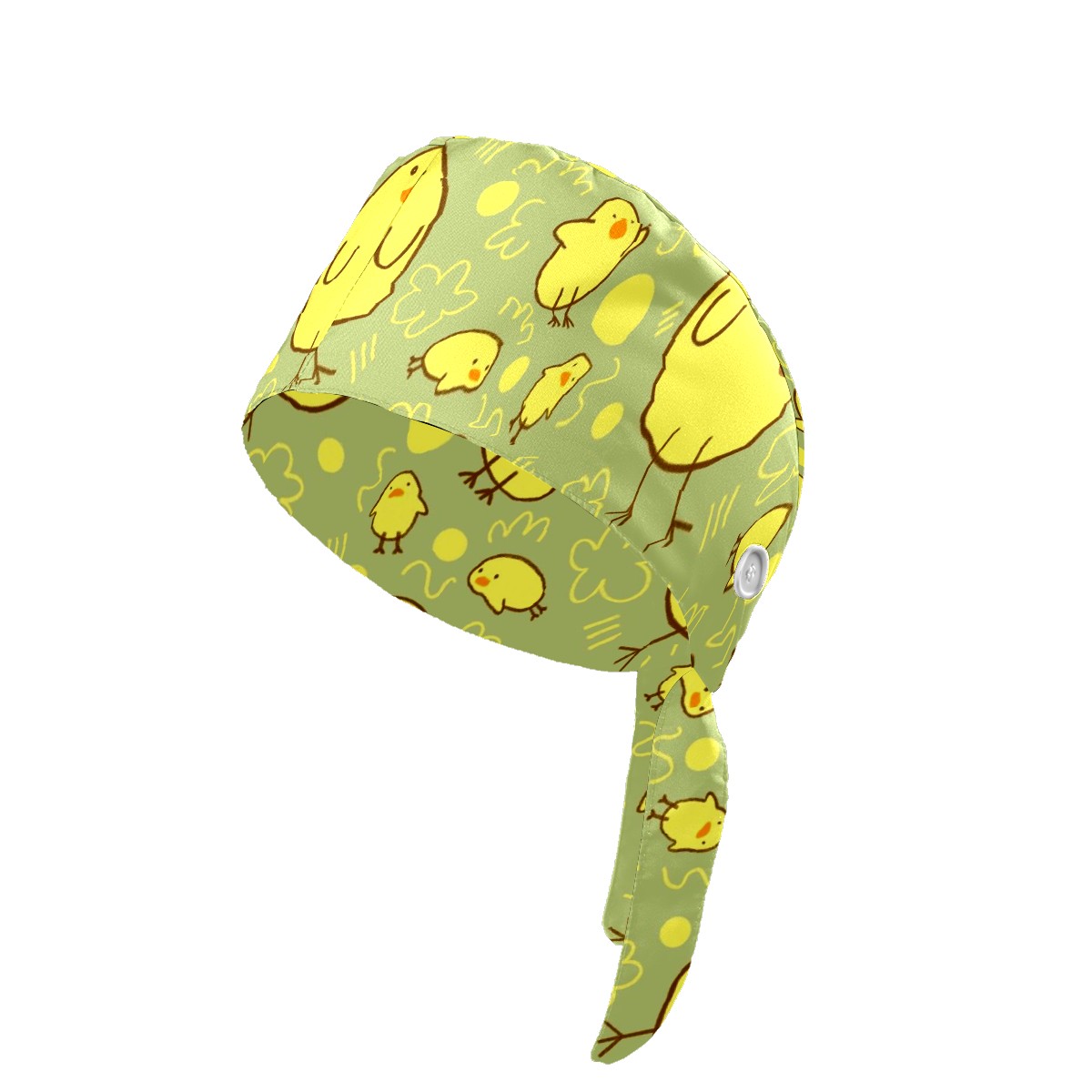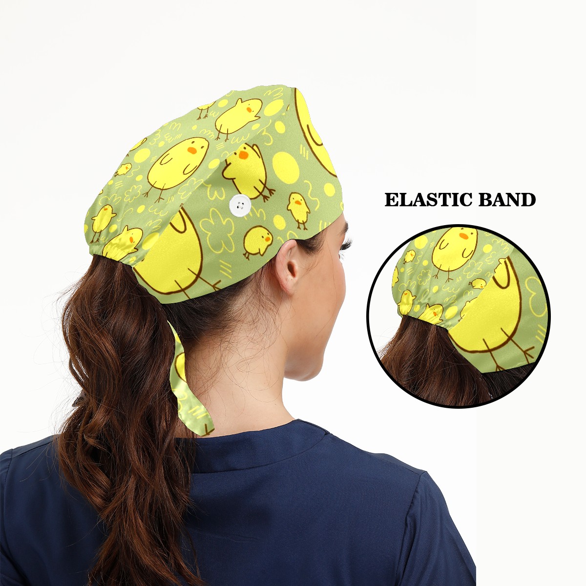 Working Caps with Button & Sweatband Satin Lined Cotton Adjustable Nurse Hats Elastic Band Scrub Cap Surgeon Hat Cute Yellow Duck On Green Background