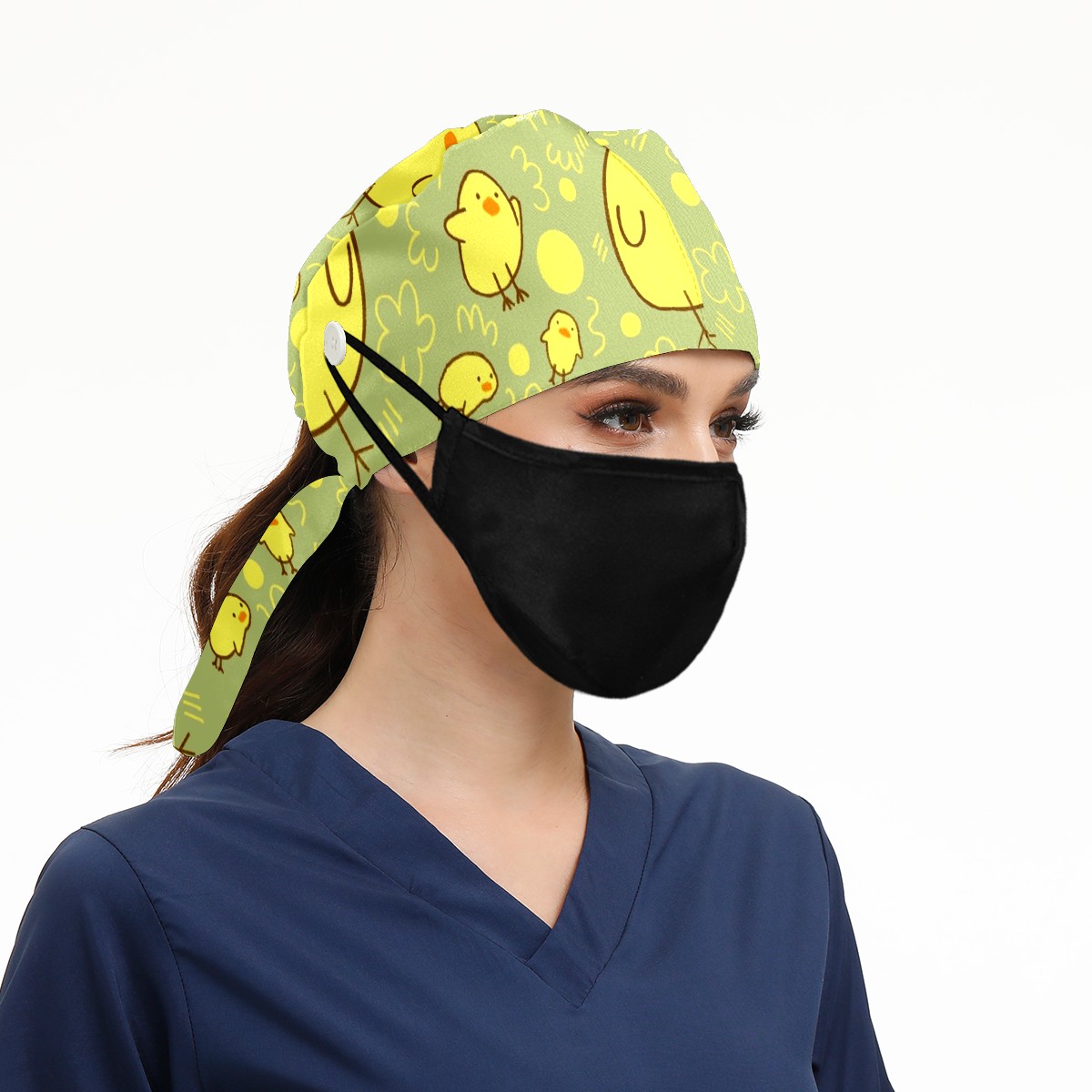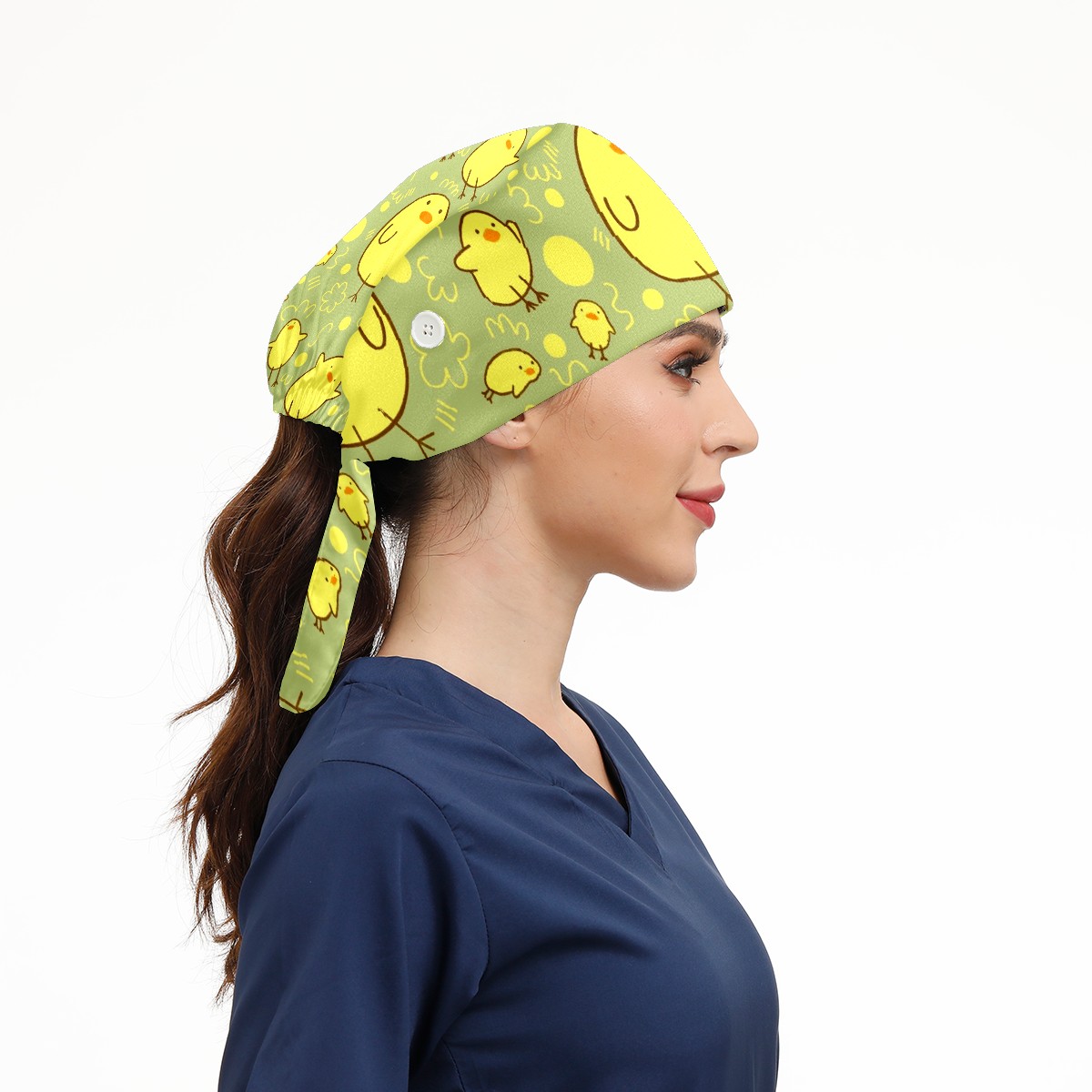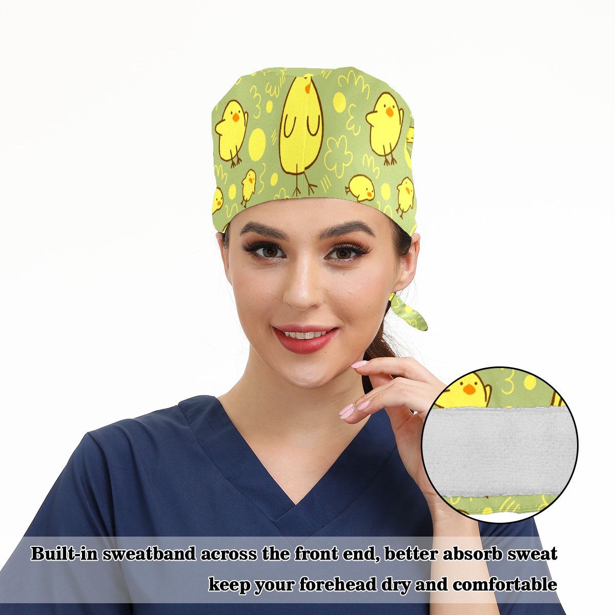 Working Caps with Button & Sweatband Satin Lined Cotton Adjustable Nurse Hats Elastic Band Scrub Cap Surgeon Hat Cute Yellow Duck On Green Background