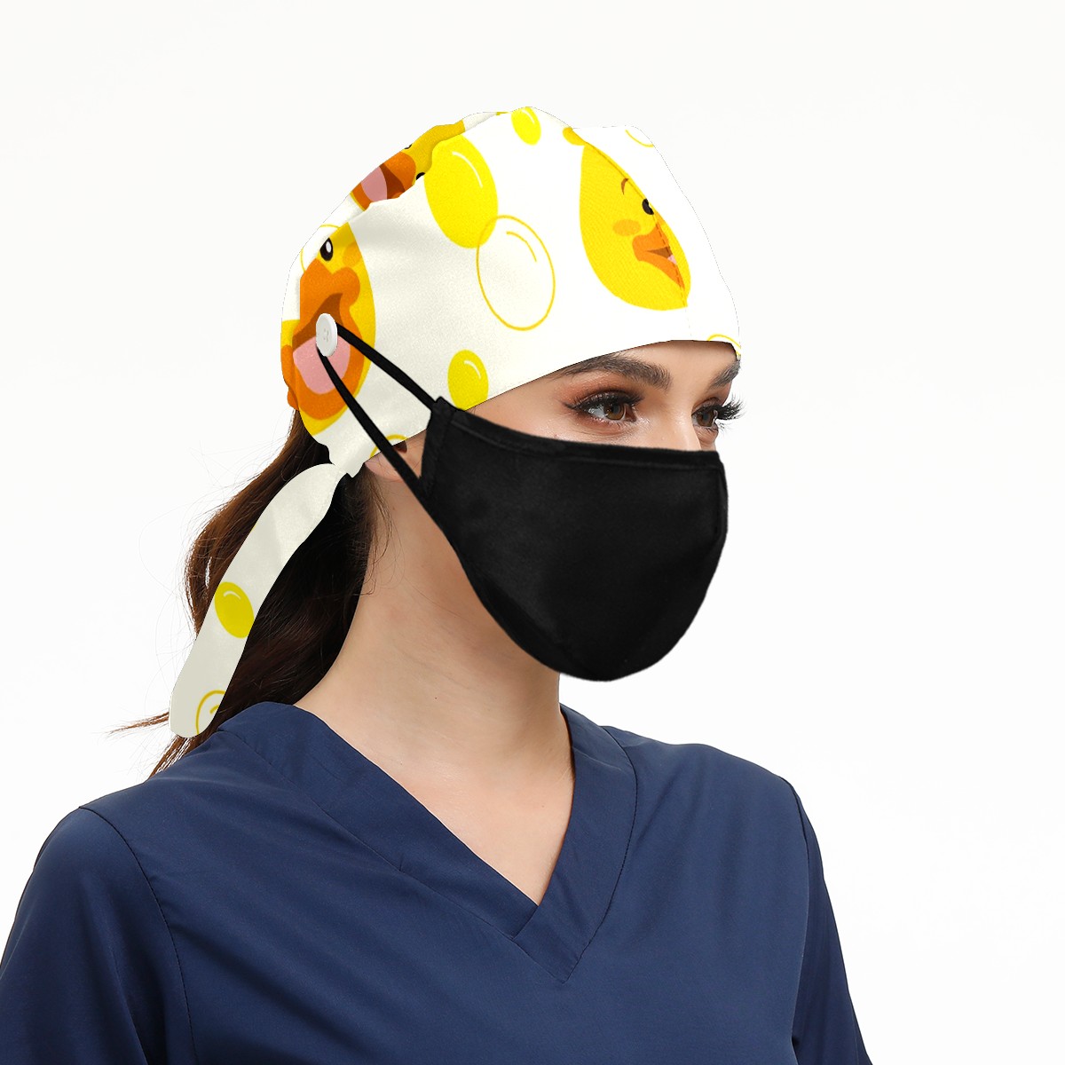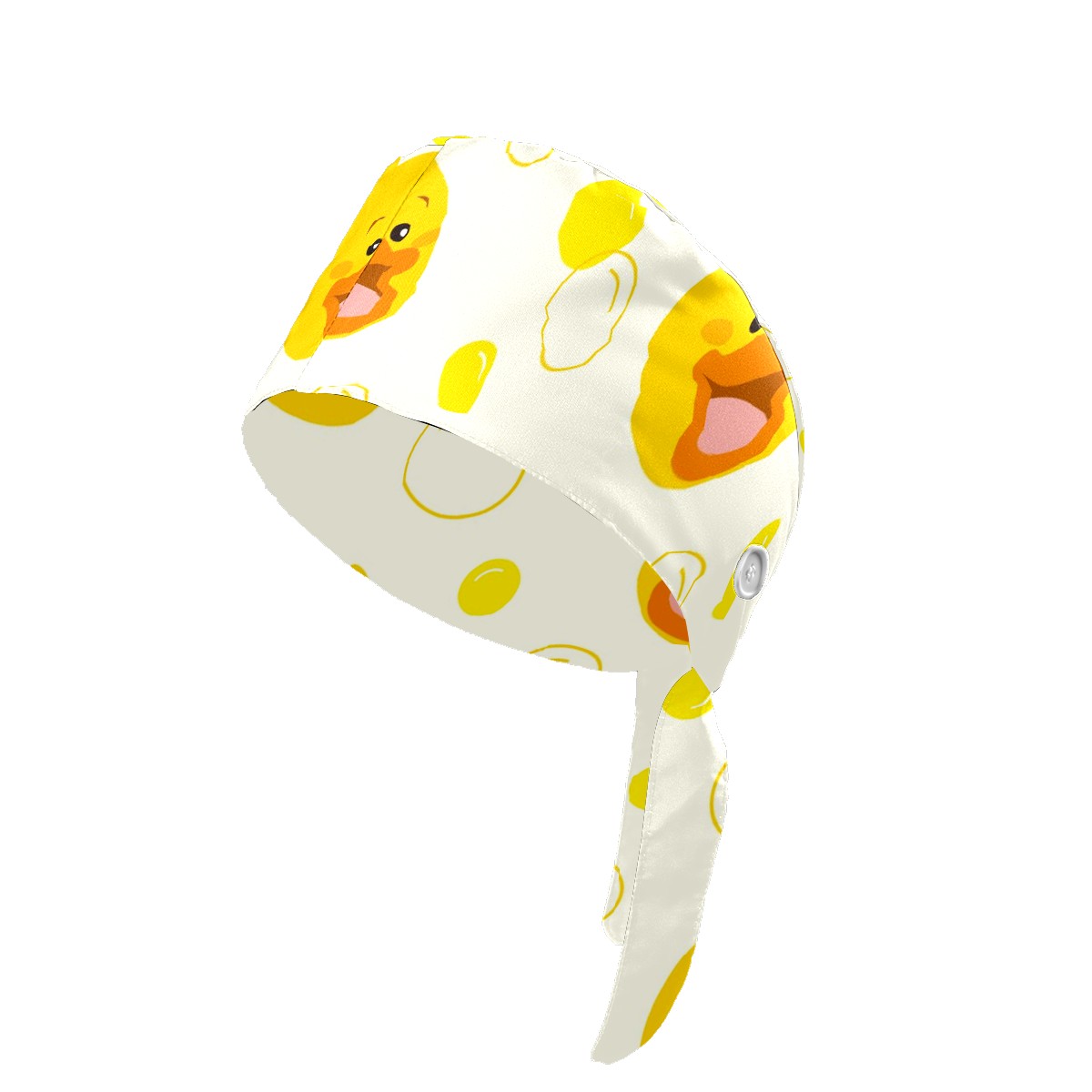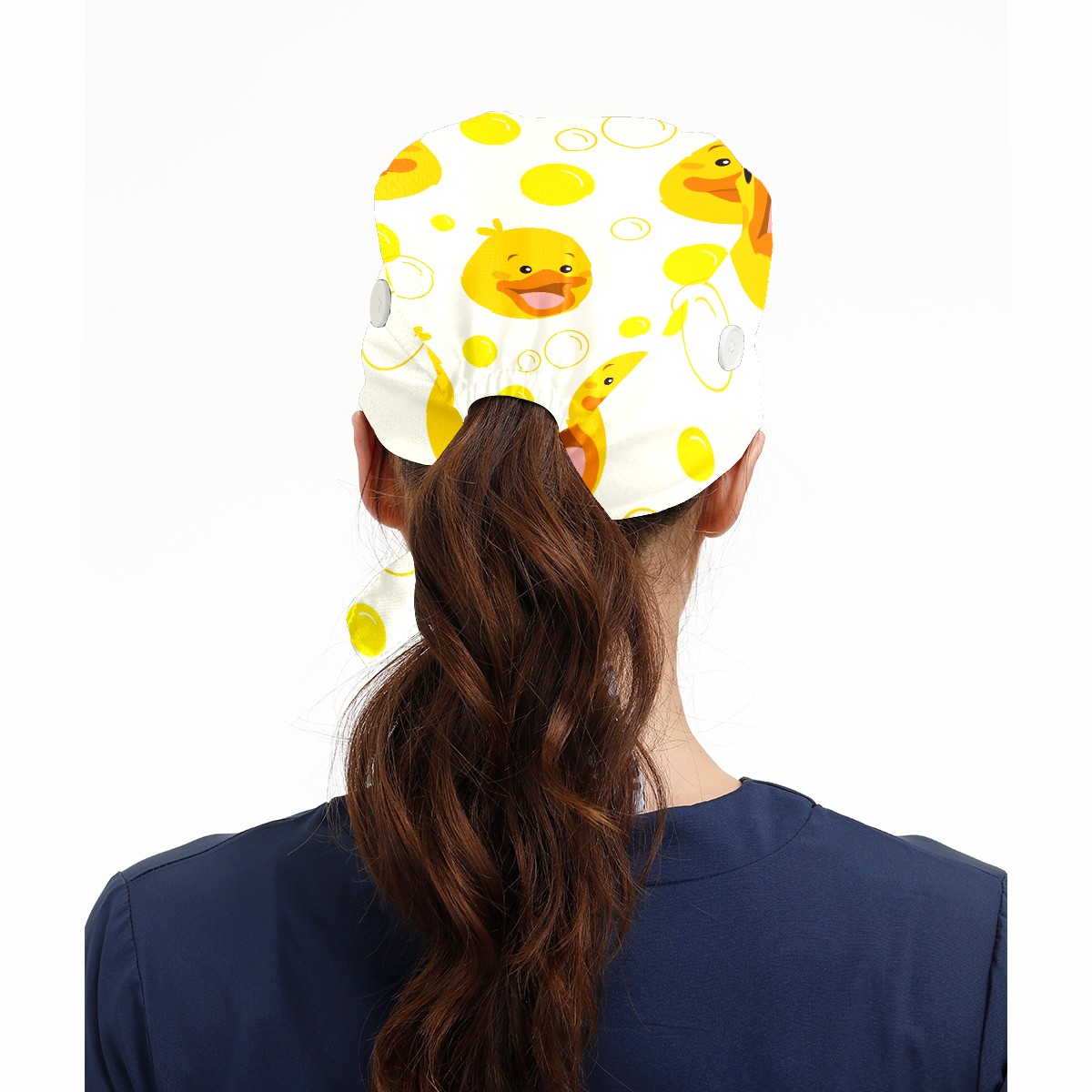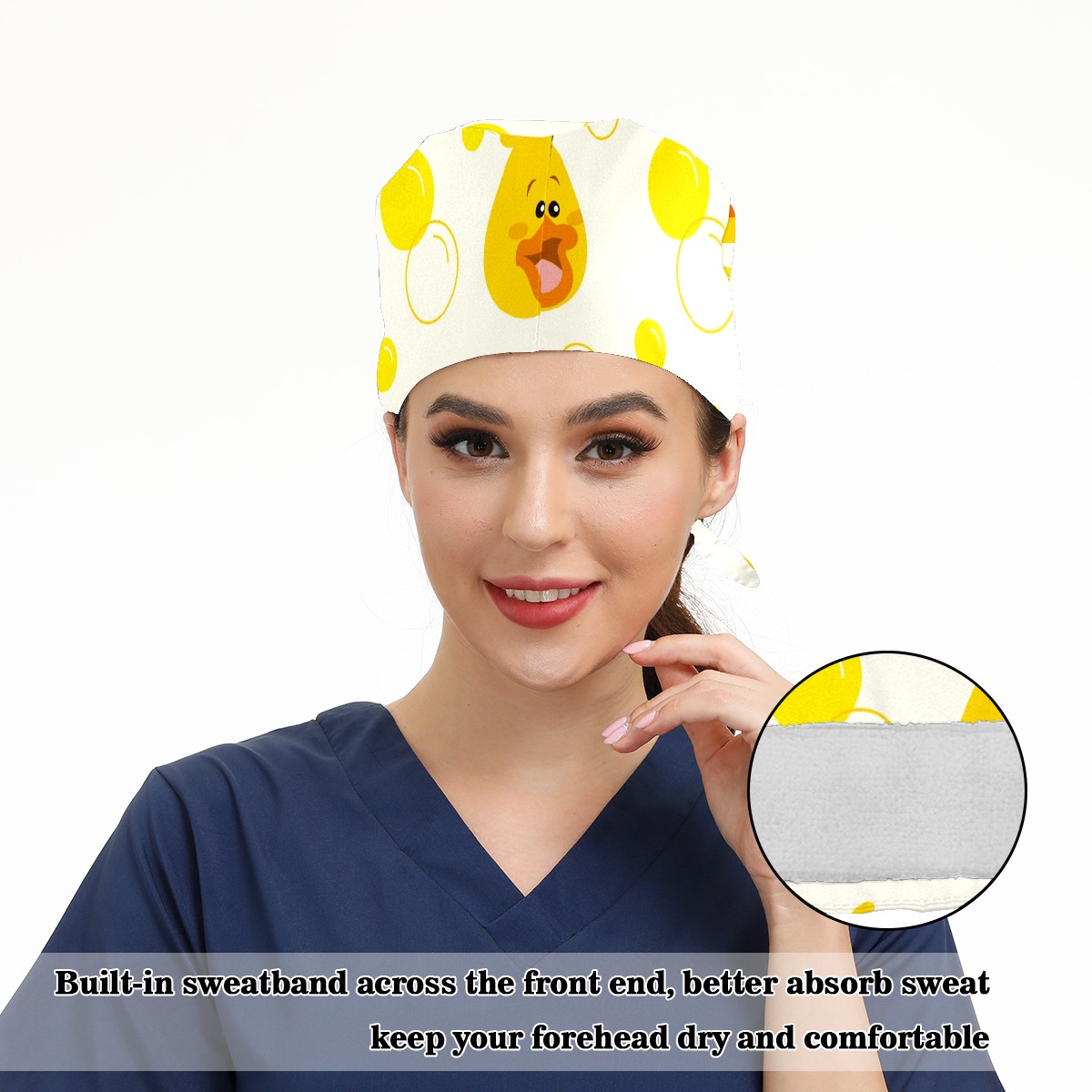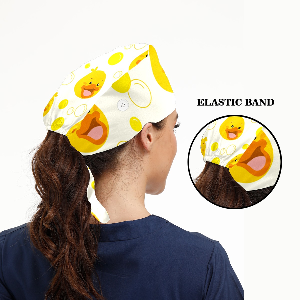 Working Caps with Button & Sweatband Satin Lined Cotton Adjustable Nurse Hats Elastic Band Scrub Cap Surgeon Hat Cute Yellow Duck Bubble