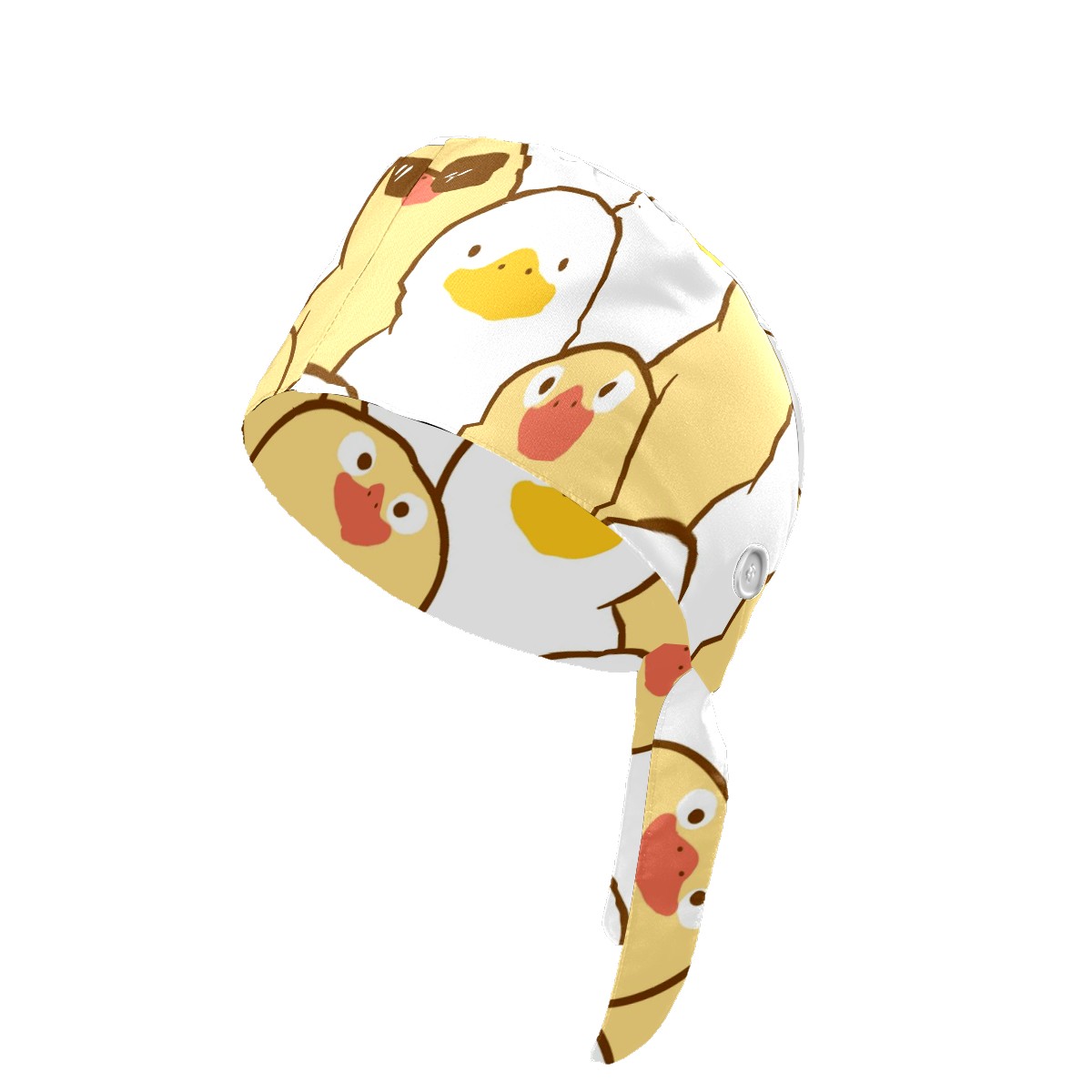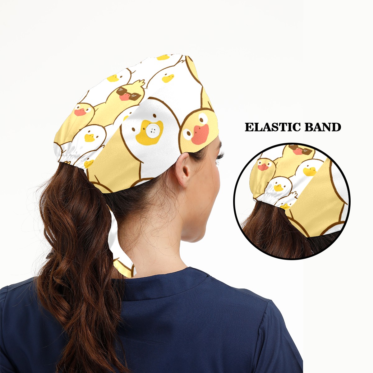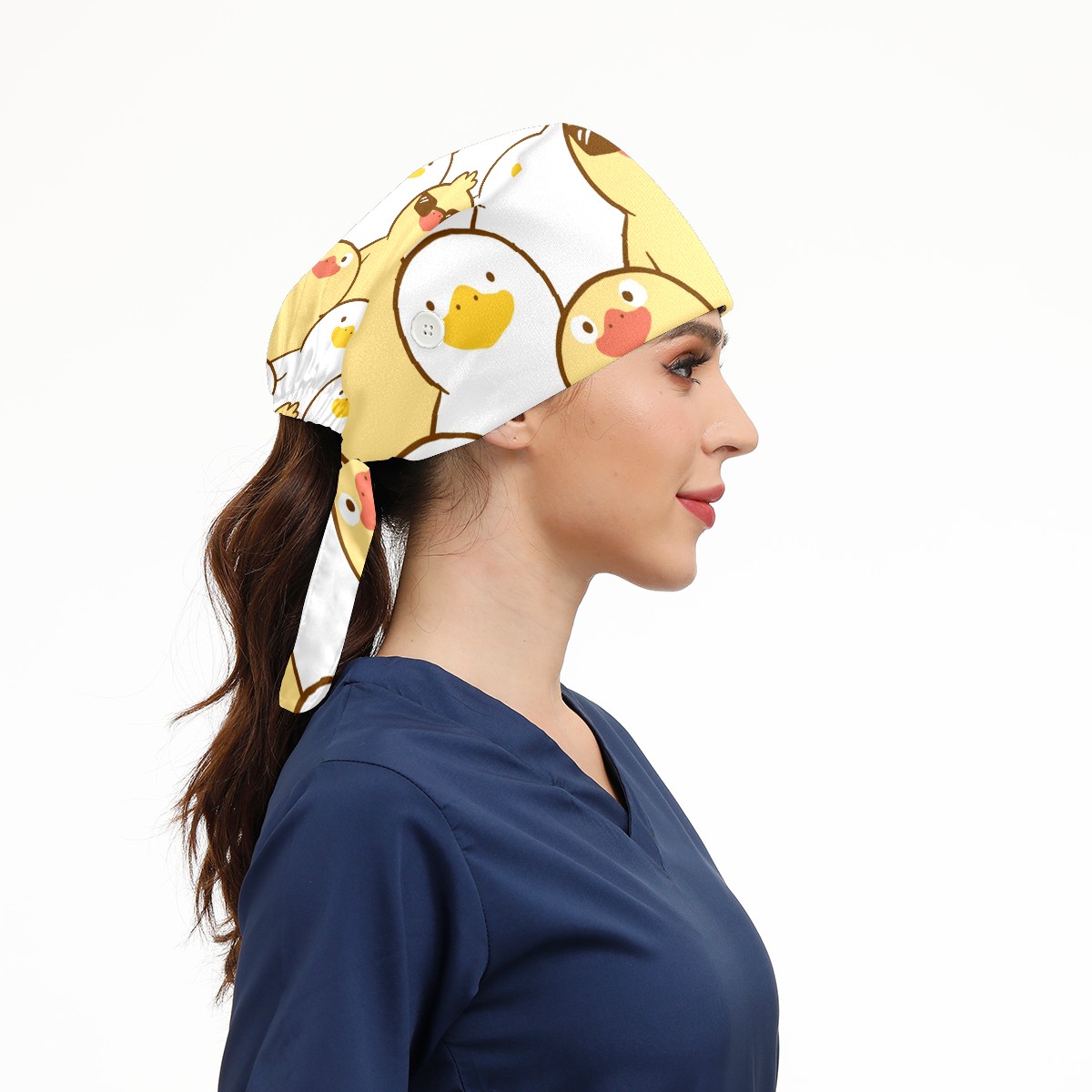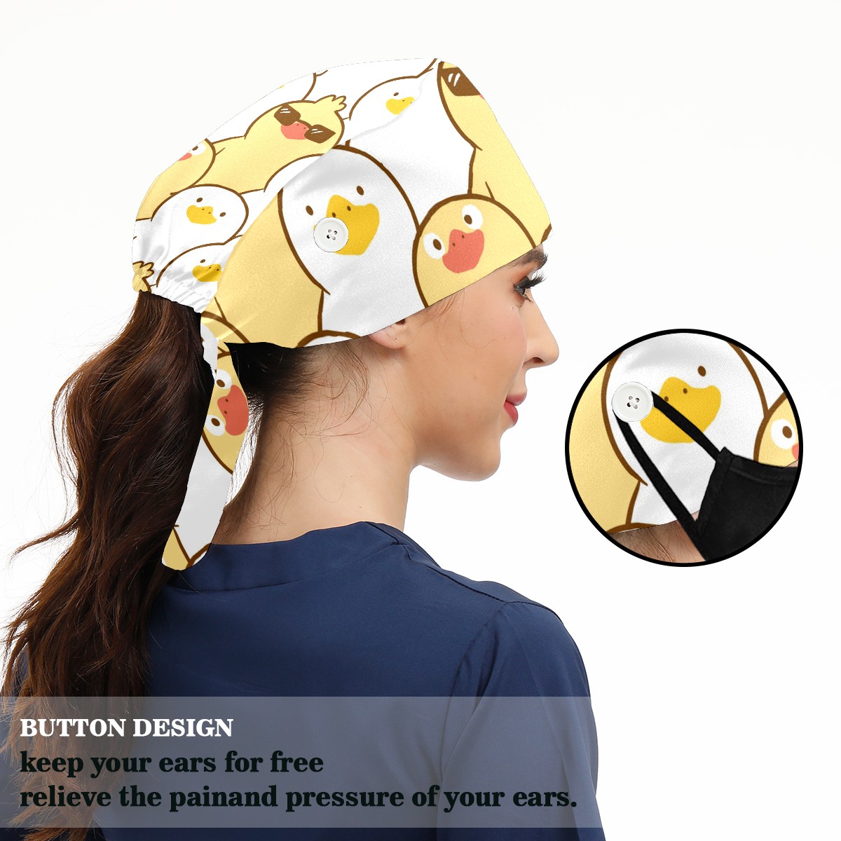 Working Caps with Button & Sweatband Satin Lined Cotton Adjustable Nurse Hats Elastic Band Scrub Cap Surgeon Hat Cute Funny Duck Face