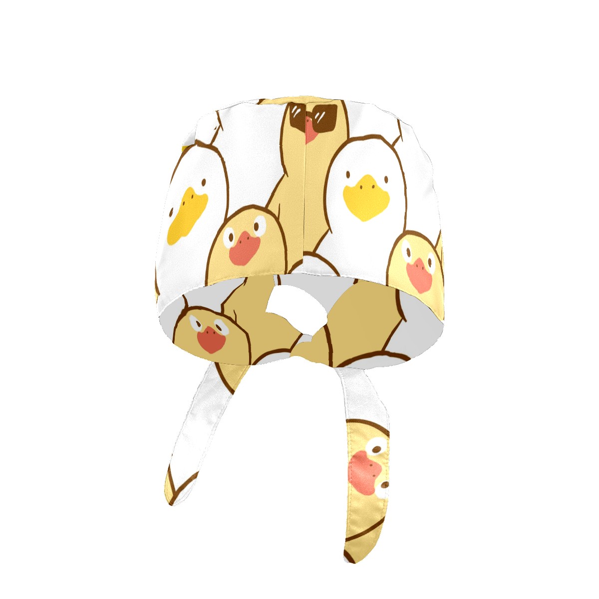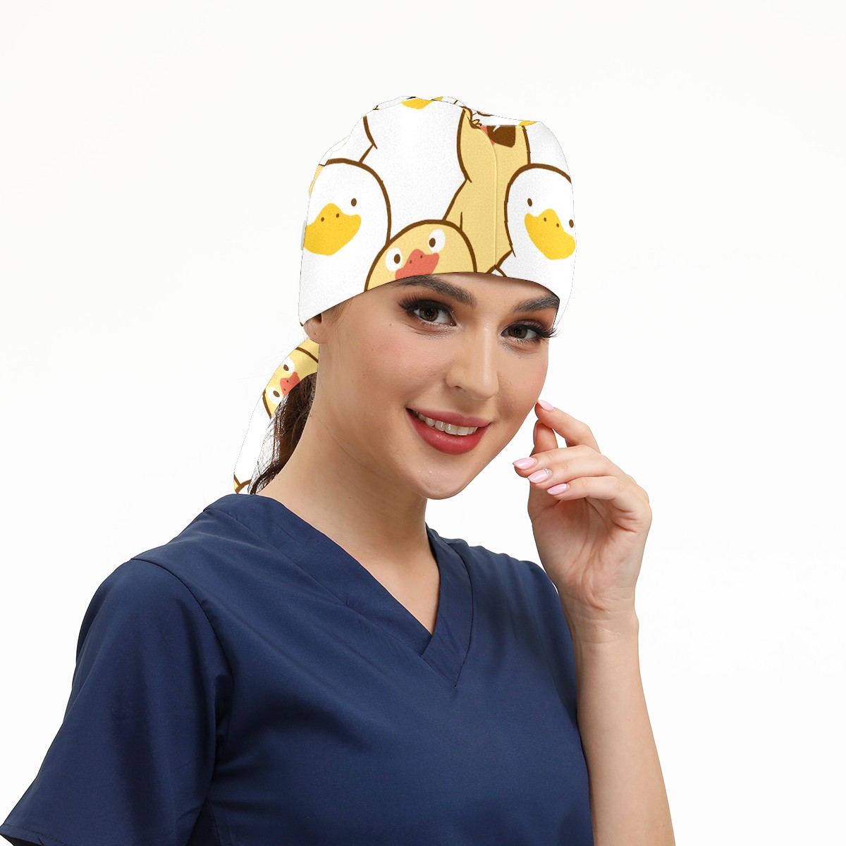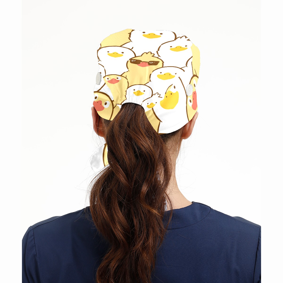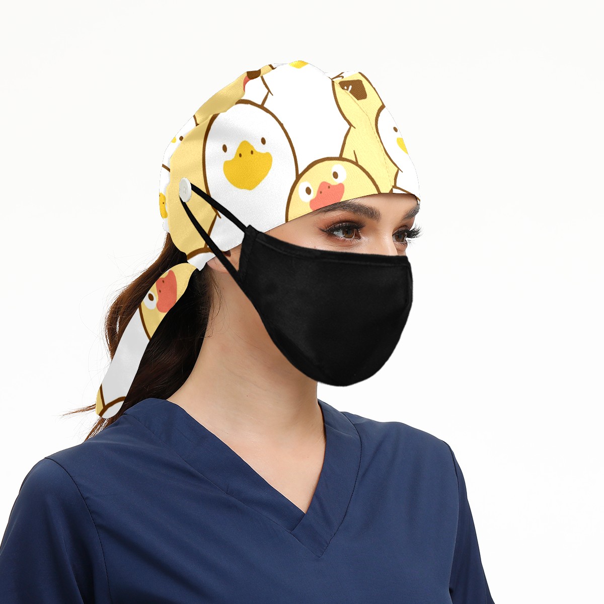 Working Caps with Button & Sweatband Satin Lined Cotton Adjustable Nurse Hats Elastic Band Scrub Cap Surgeon Hat Cute Funny Duck Face