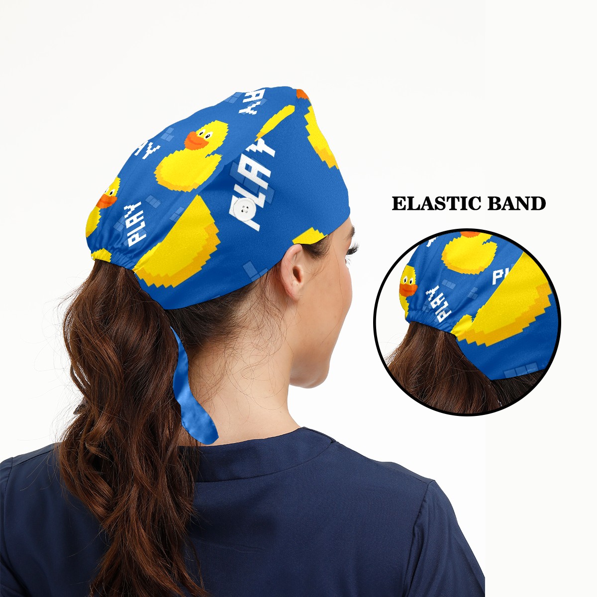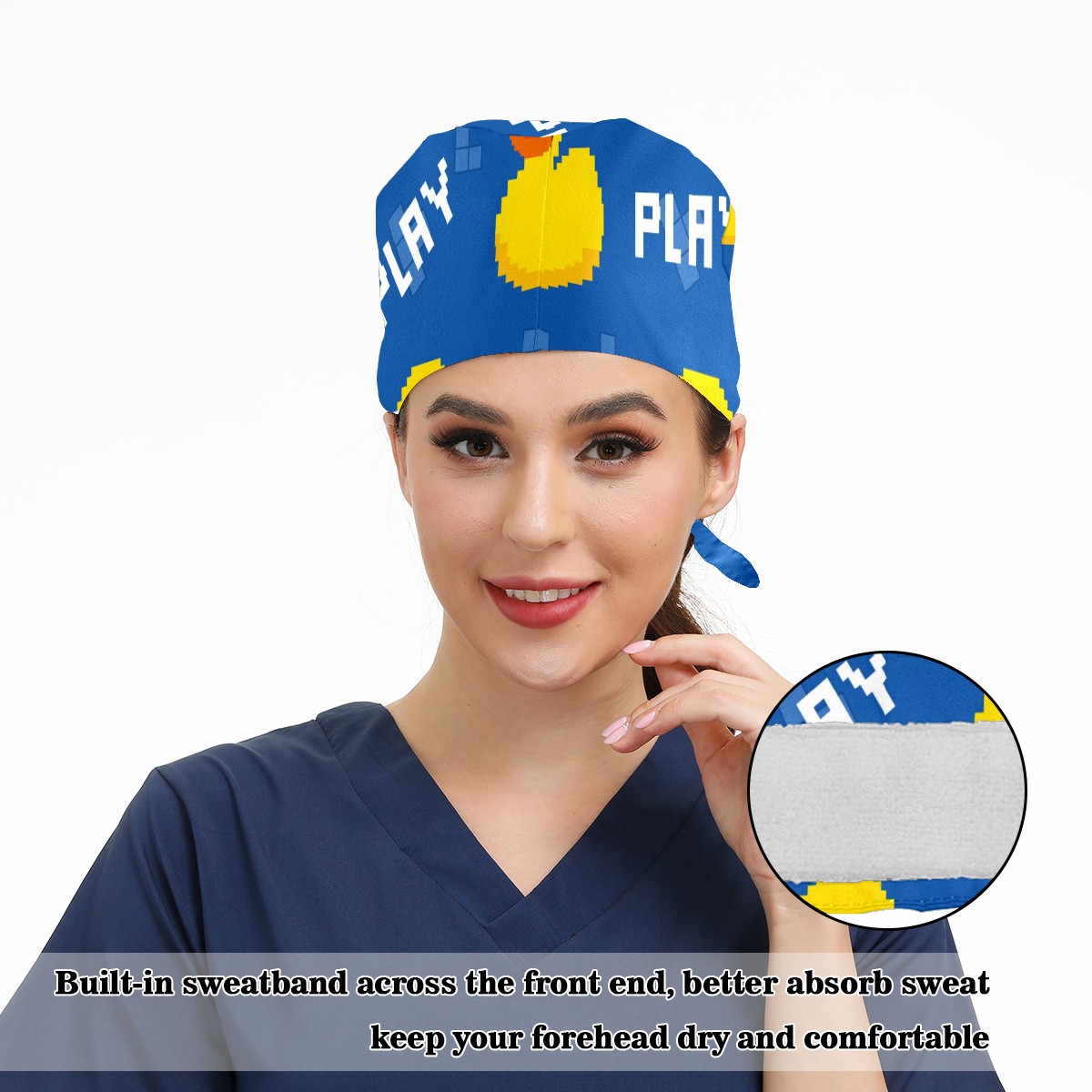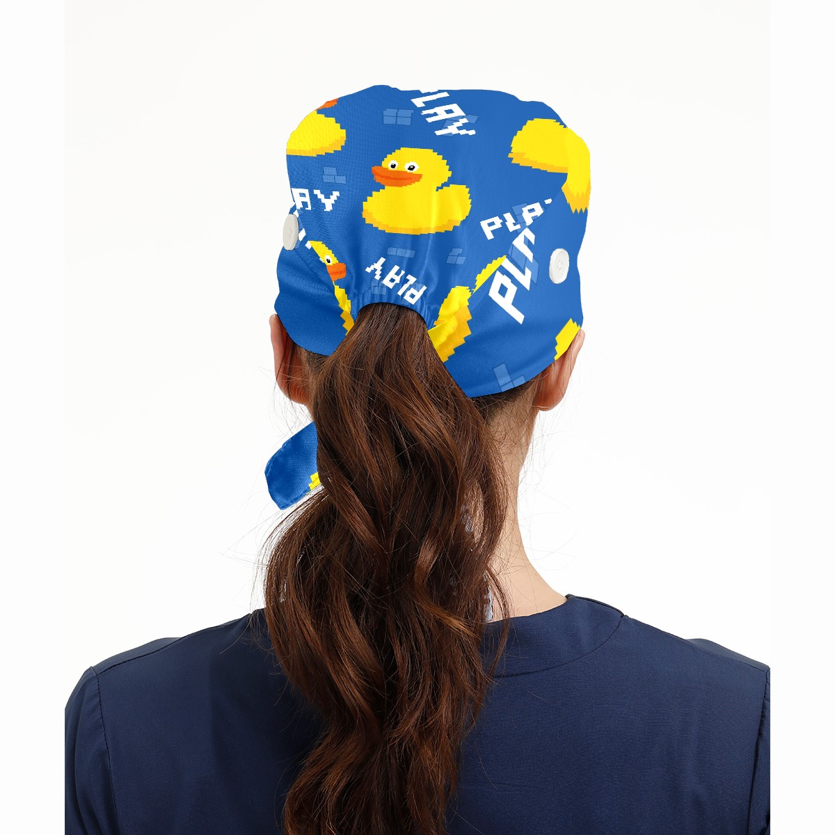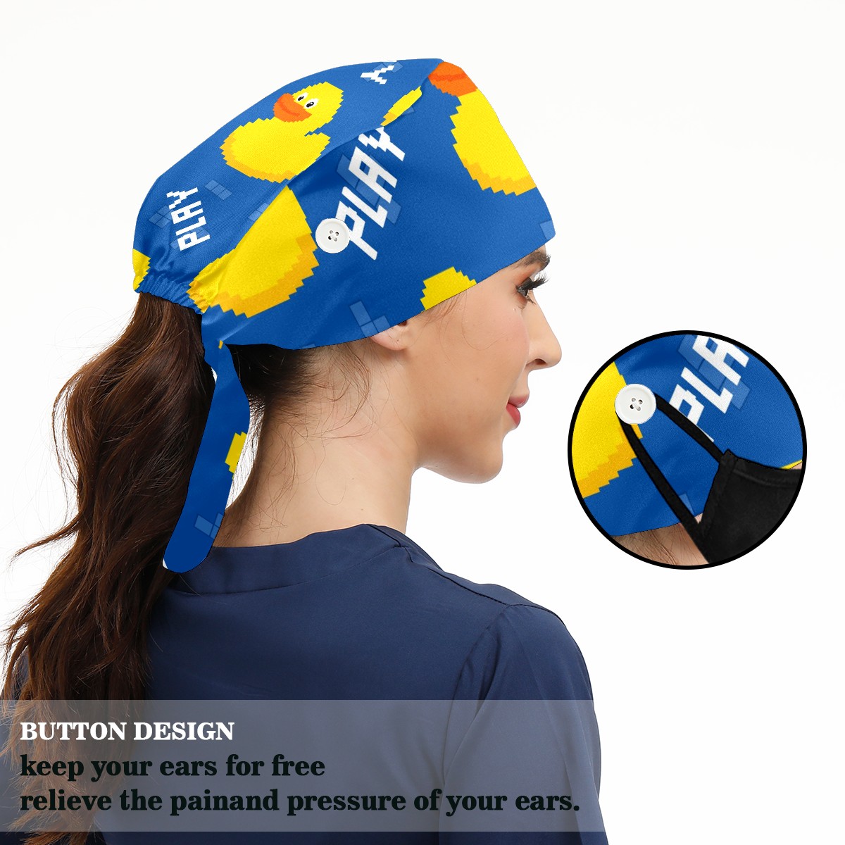 Working Caps with Button & Sweatband Satin Lined Cotton Adjustable Nurse Hats Elastic Band Scrub Cap Surgeon Hat Cute Pixel Duck On Blue Background