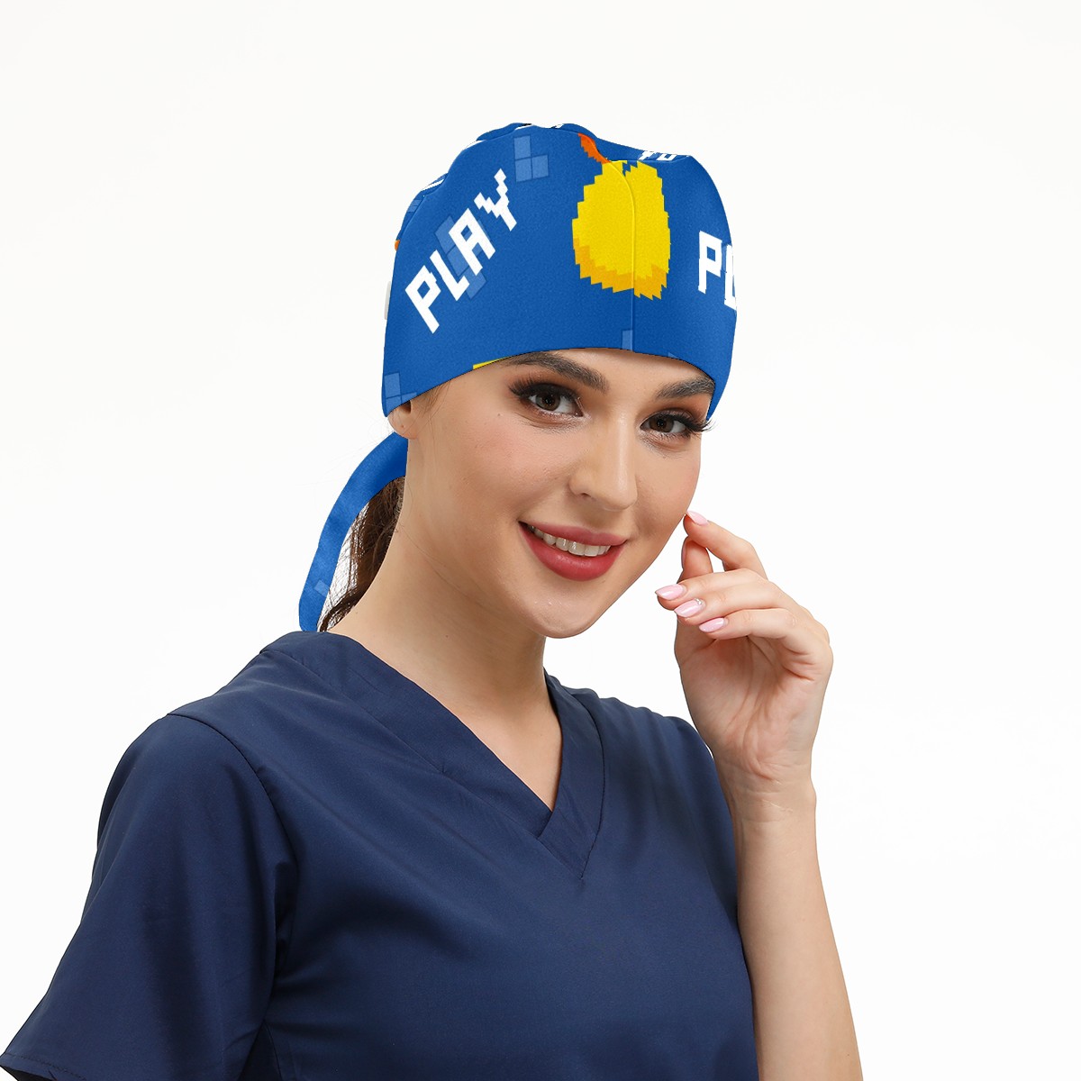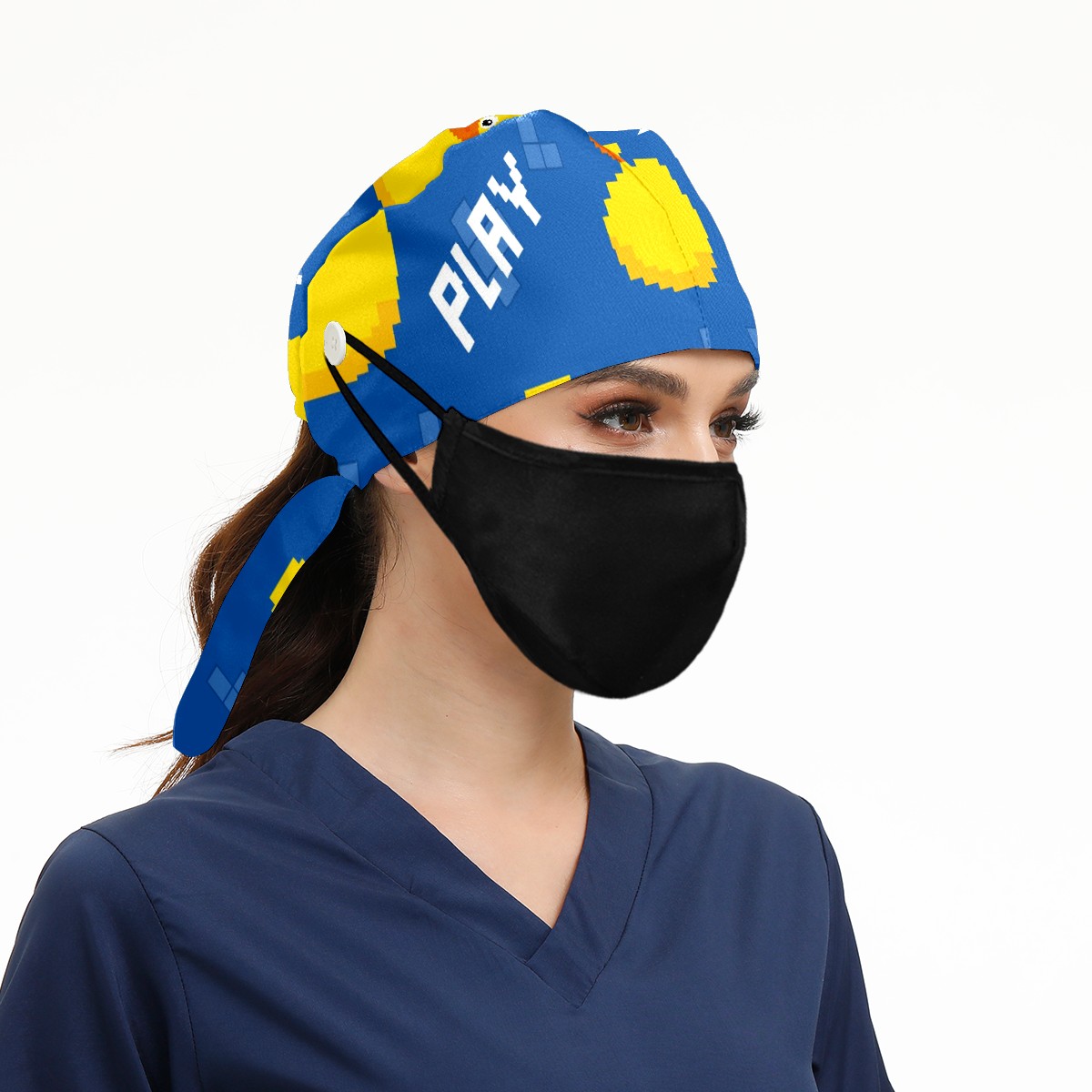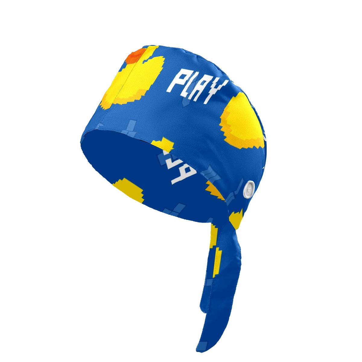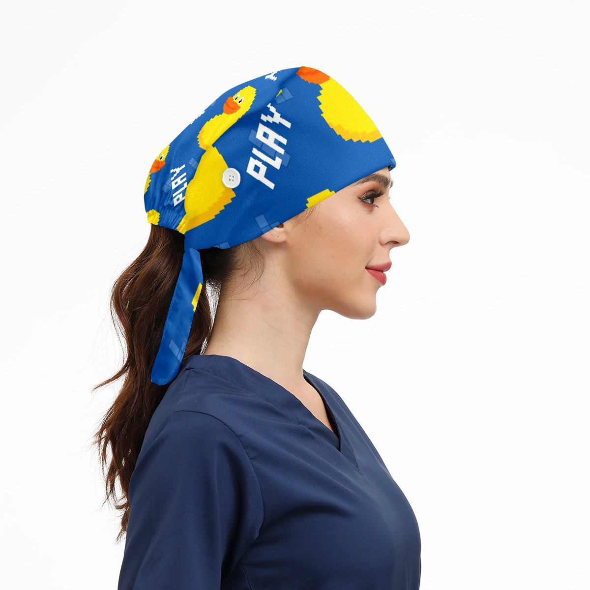 Working Caps with Button & Sweatband Satin Lined Cotton Adjustable Nurse Hats Elastic Band Scrub Cap Surgeon Hat Cute Pixel Duck On Blue Background