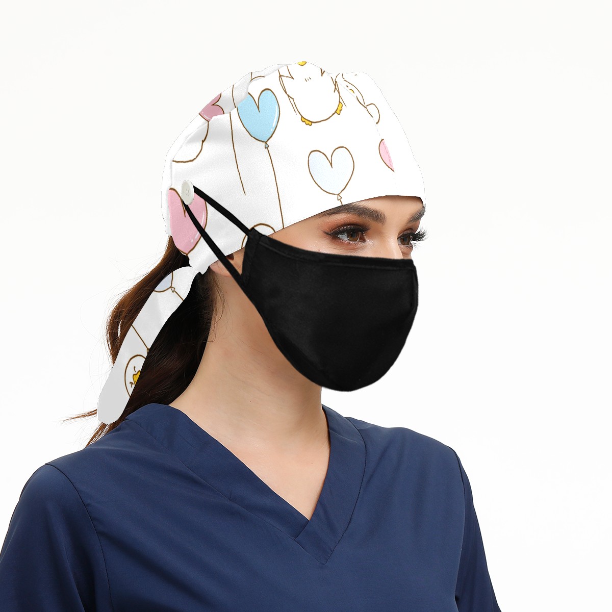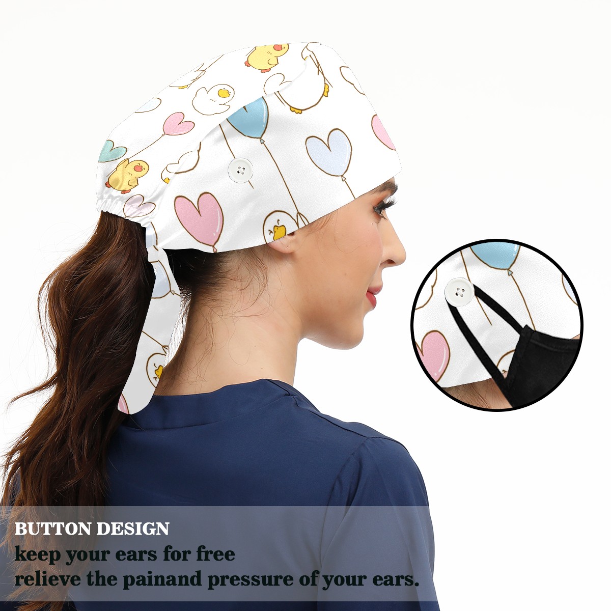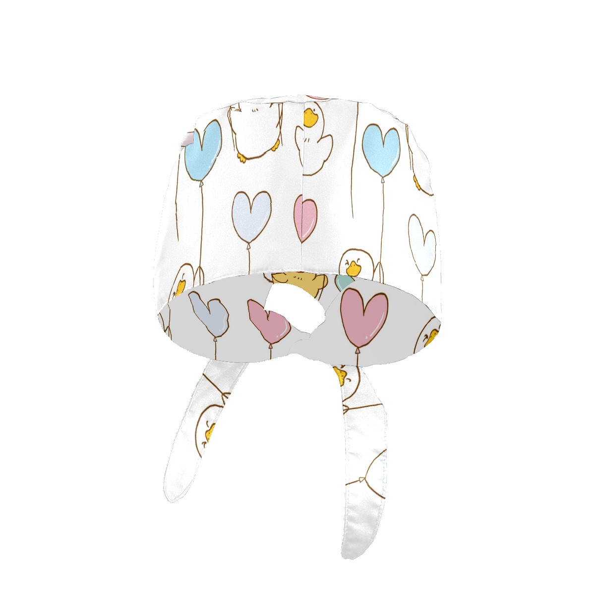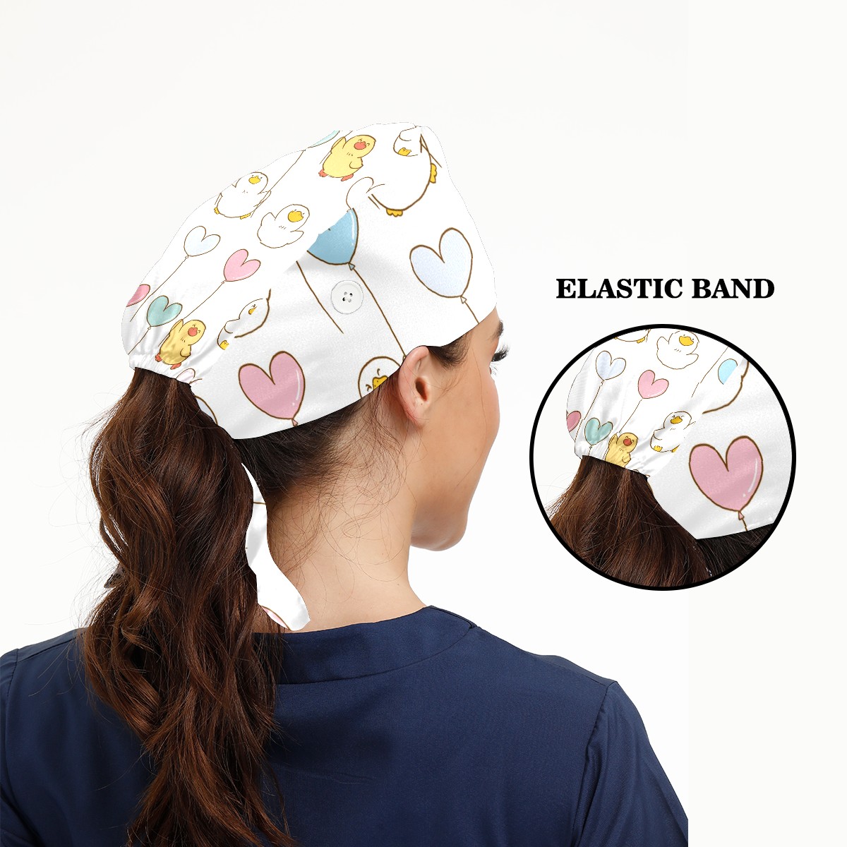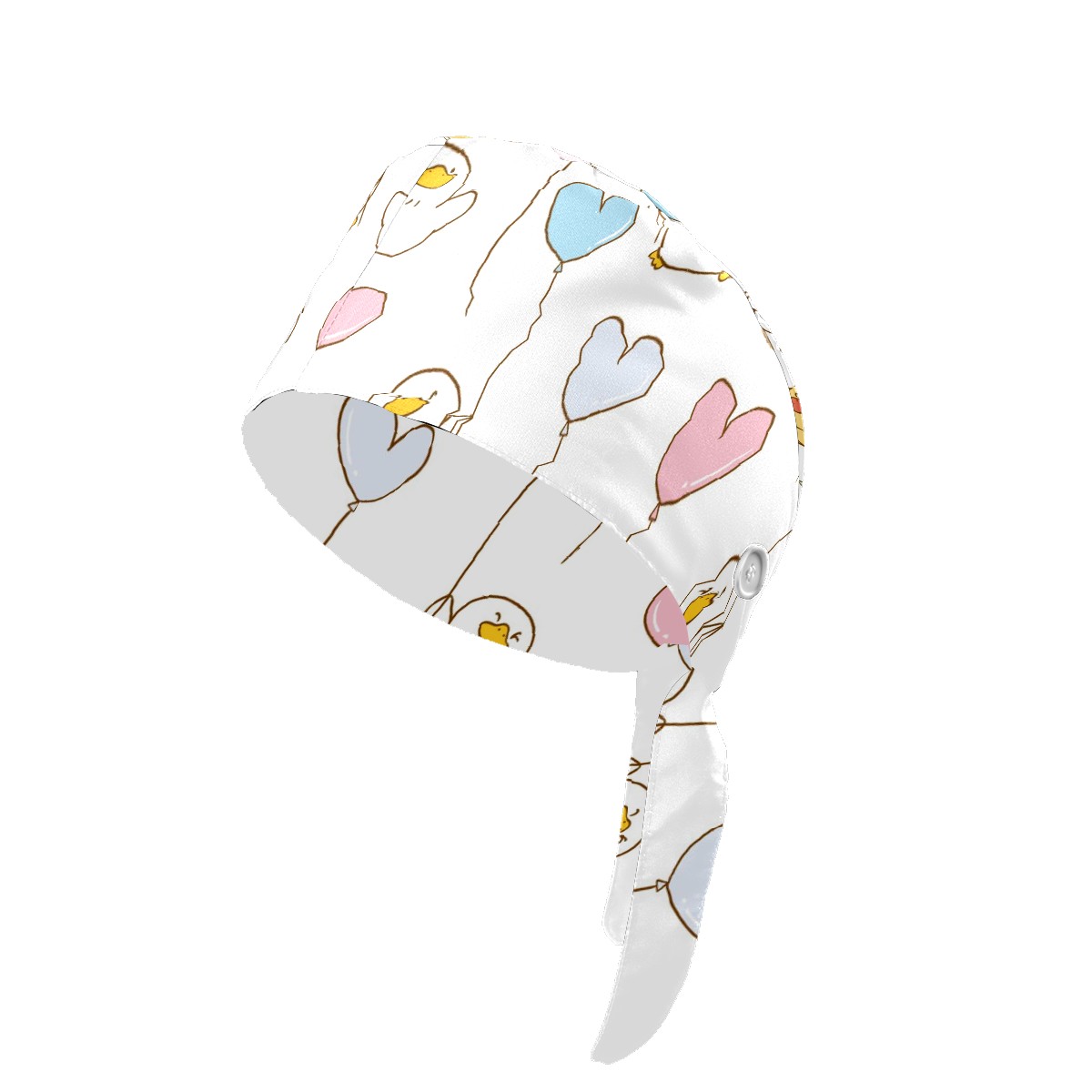 Working Caps with Button & Sweatband Satin Lined Cotton Adjustable Nurse Hats Elastic Band Scrub Cap Surgeon Hat Cute Duck And Balloon On White Background