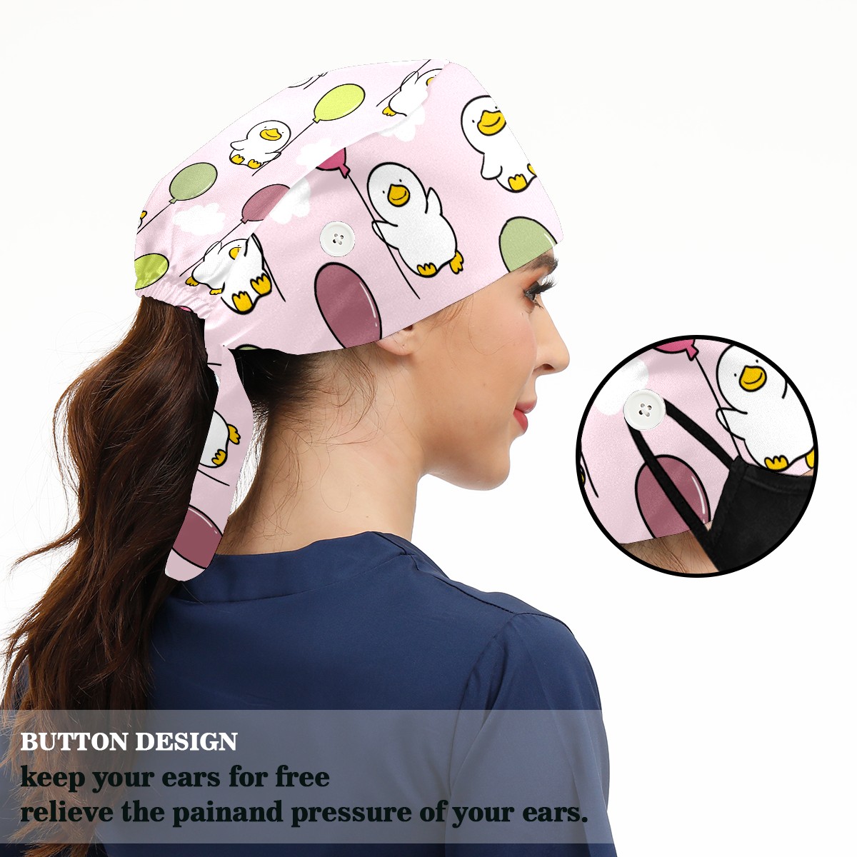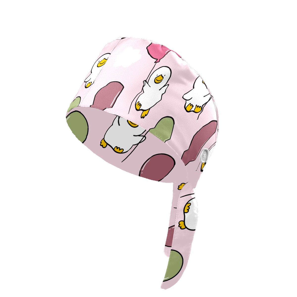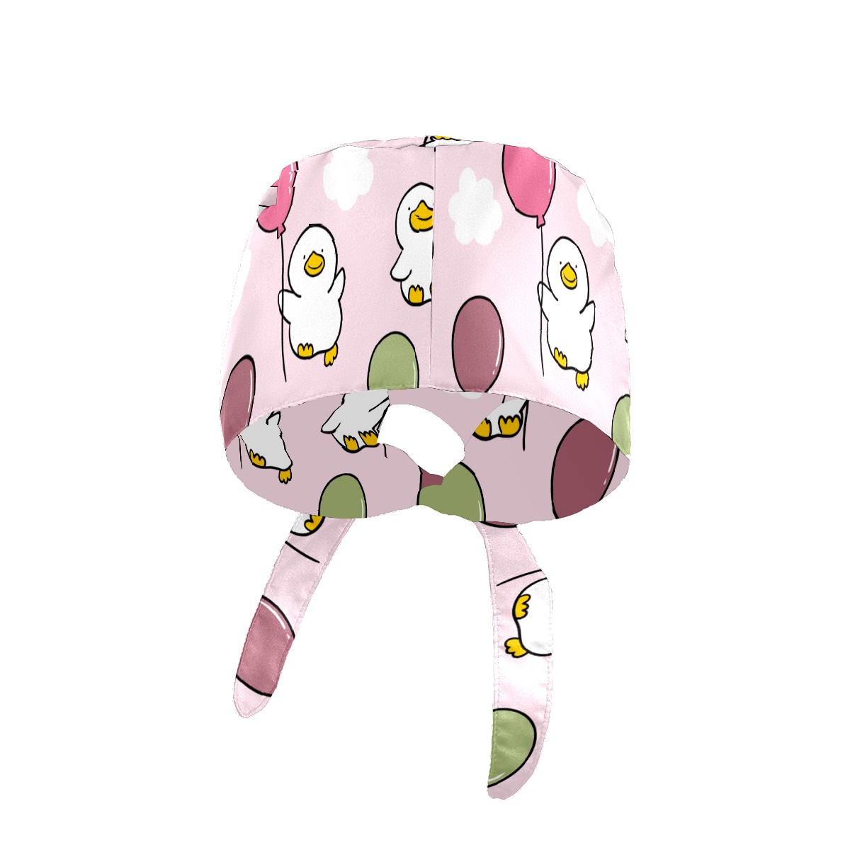 Working Caps with Button & Sweatband Satin Lined Cotton Adjustable Nurse Hats Elastic Band Scrub Cap Surgeon Hat Cute Duck And Balloon On Pink Background