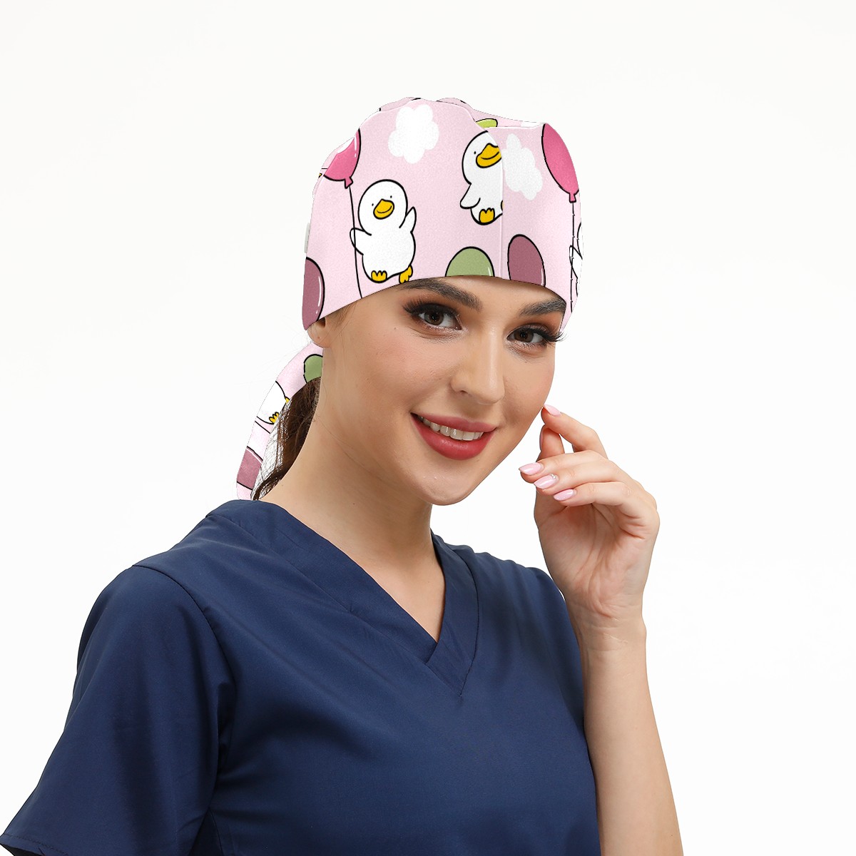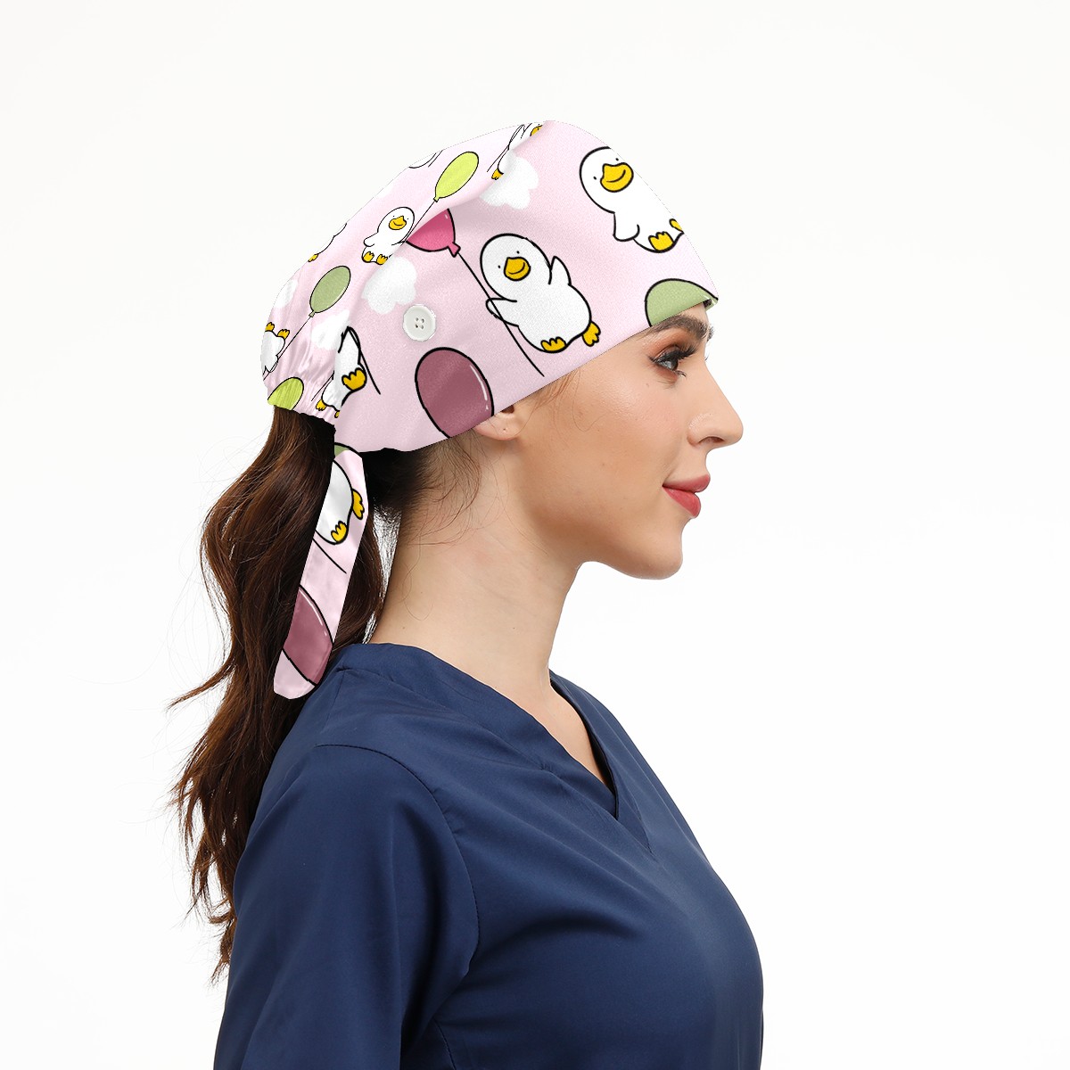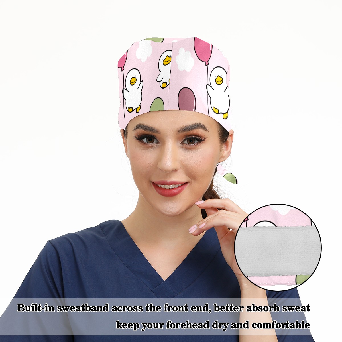 Working Caps with Button & Sweatband Satin Lined Cotton Adjustable Nurse Hats Elastic Band Scrub Cap Surgeon Hat Cute Duck And Balloon On Pink Background