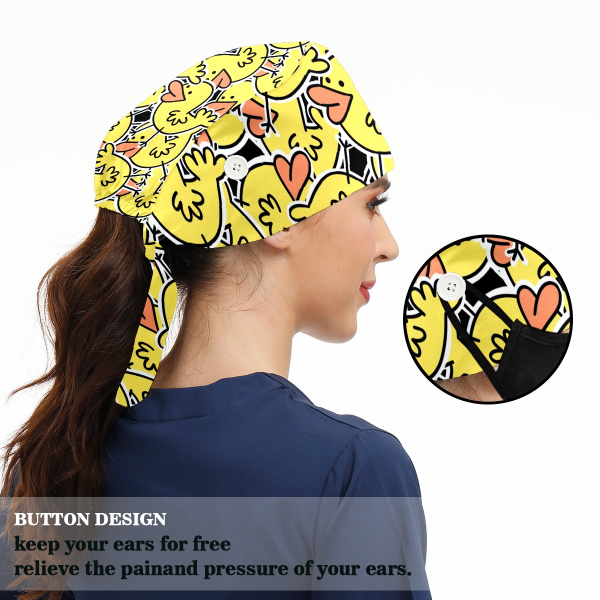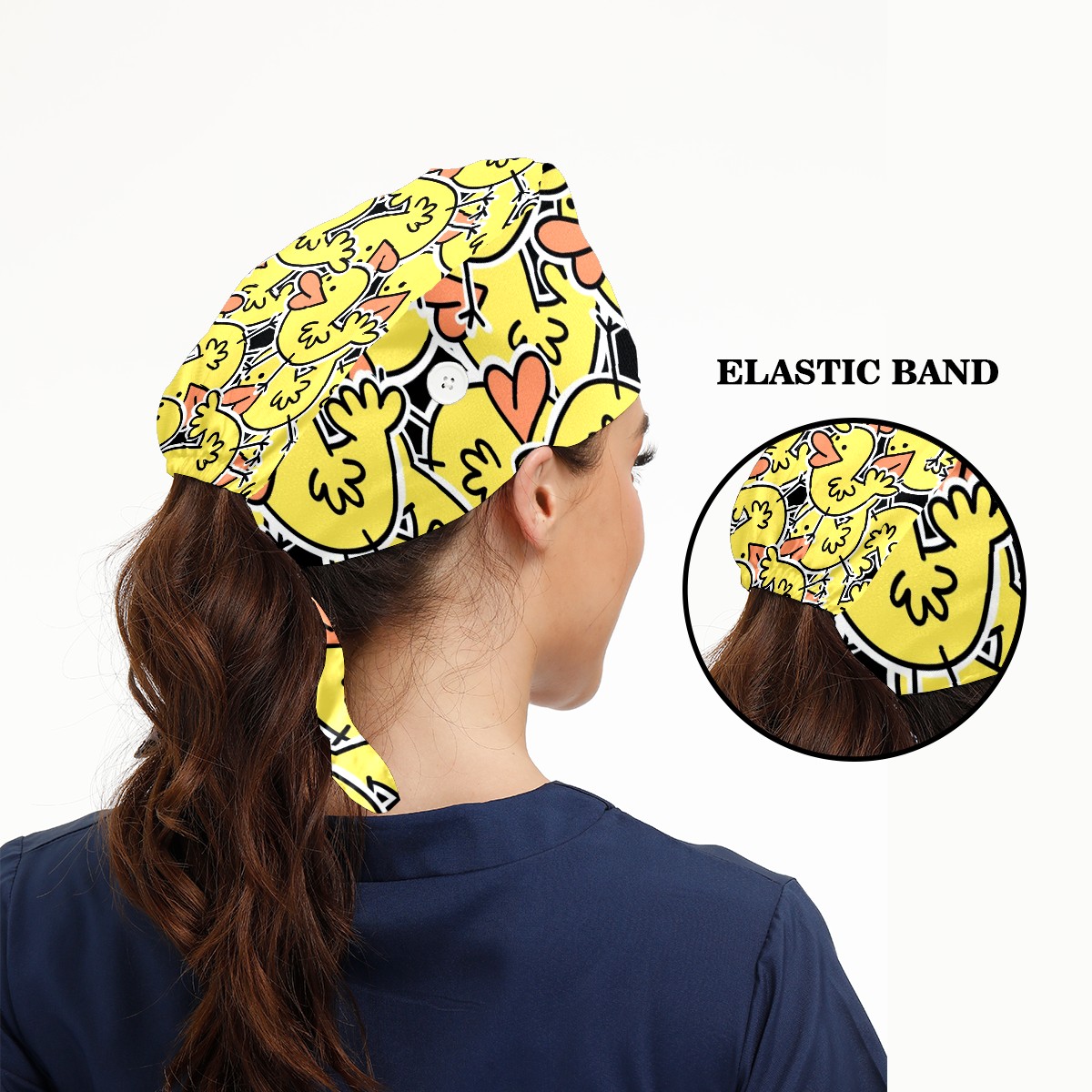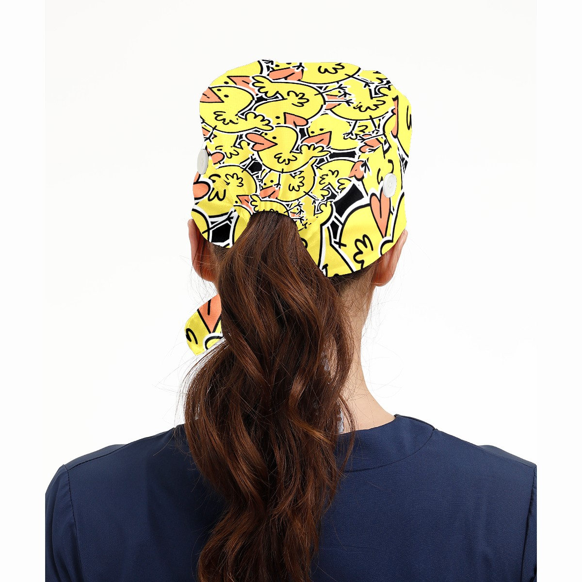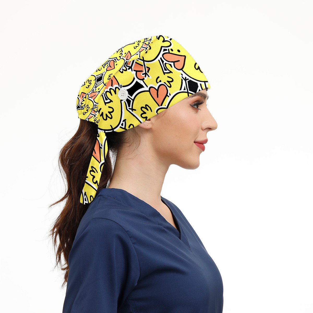 Working Caps with Button & Sweatband Satin Lined Cotton Adjustable Nurse Hats Elastic Band Scrub Cap Surgeon Hat Cute Cartoon Duck Seamless