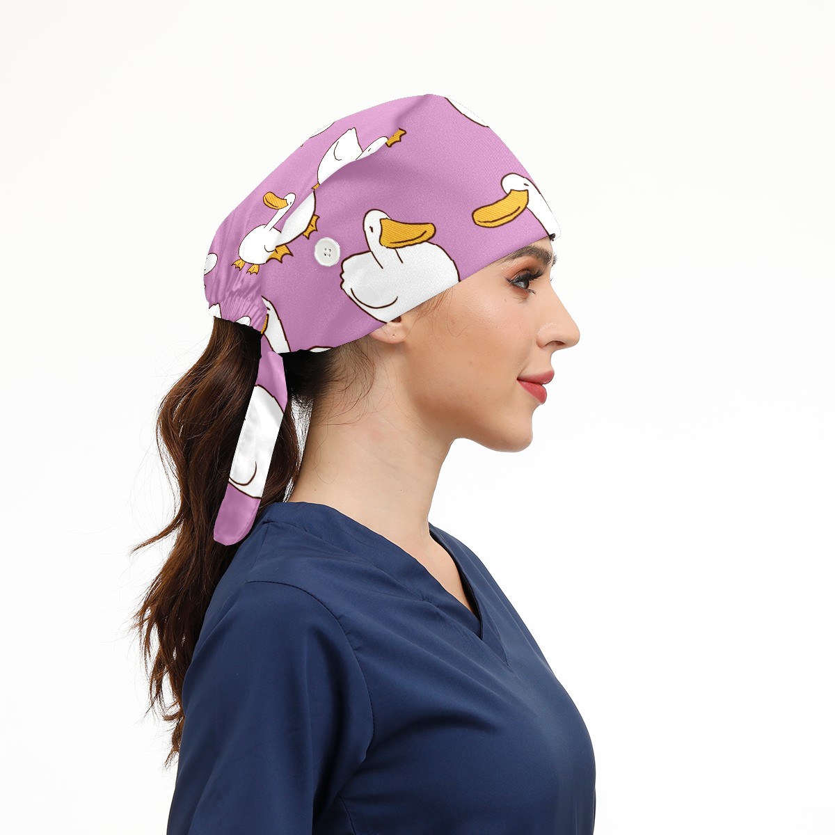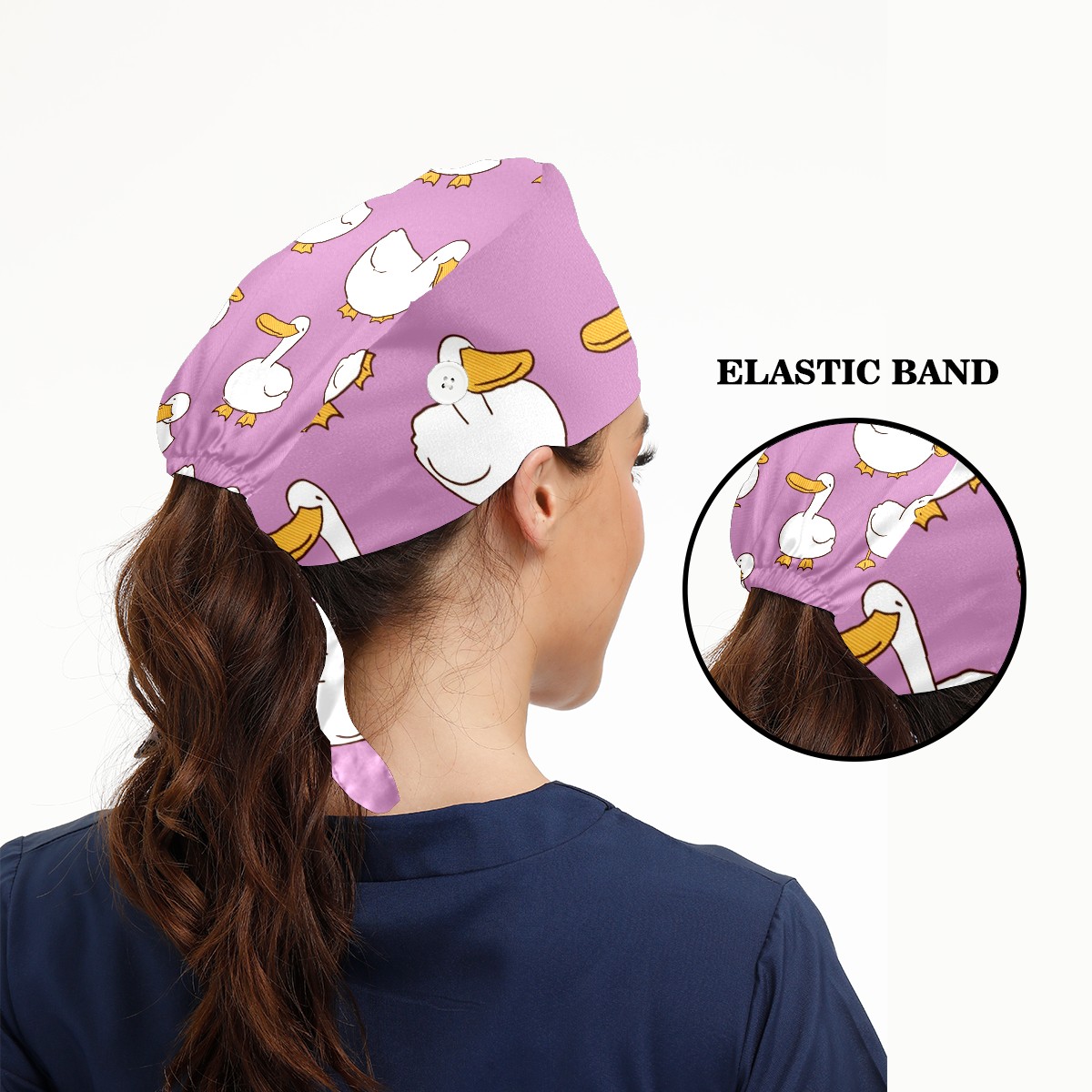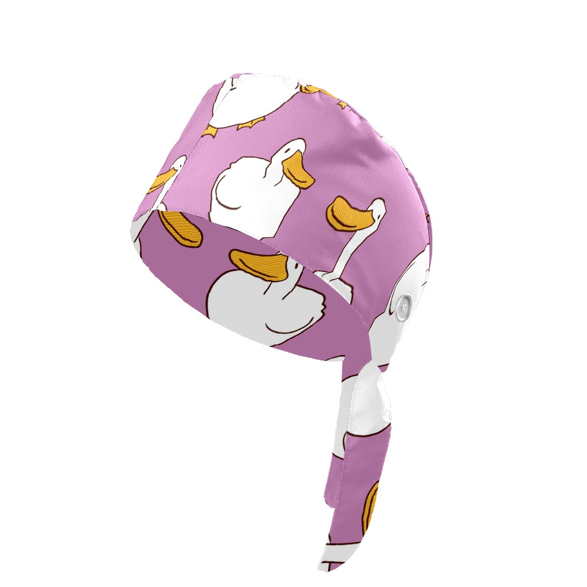 Working Caps with Button & Sweatband Satin Lined Cotton Adjustable Nurse Hats Elastic Band Scrub Cap Surgeon Hat Cartoon Duck On Purple Background