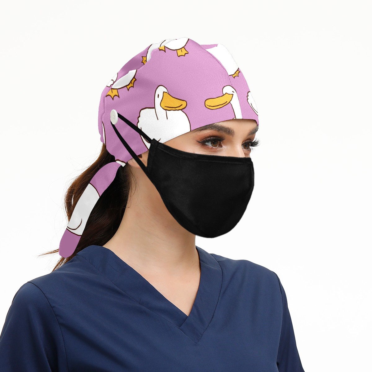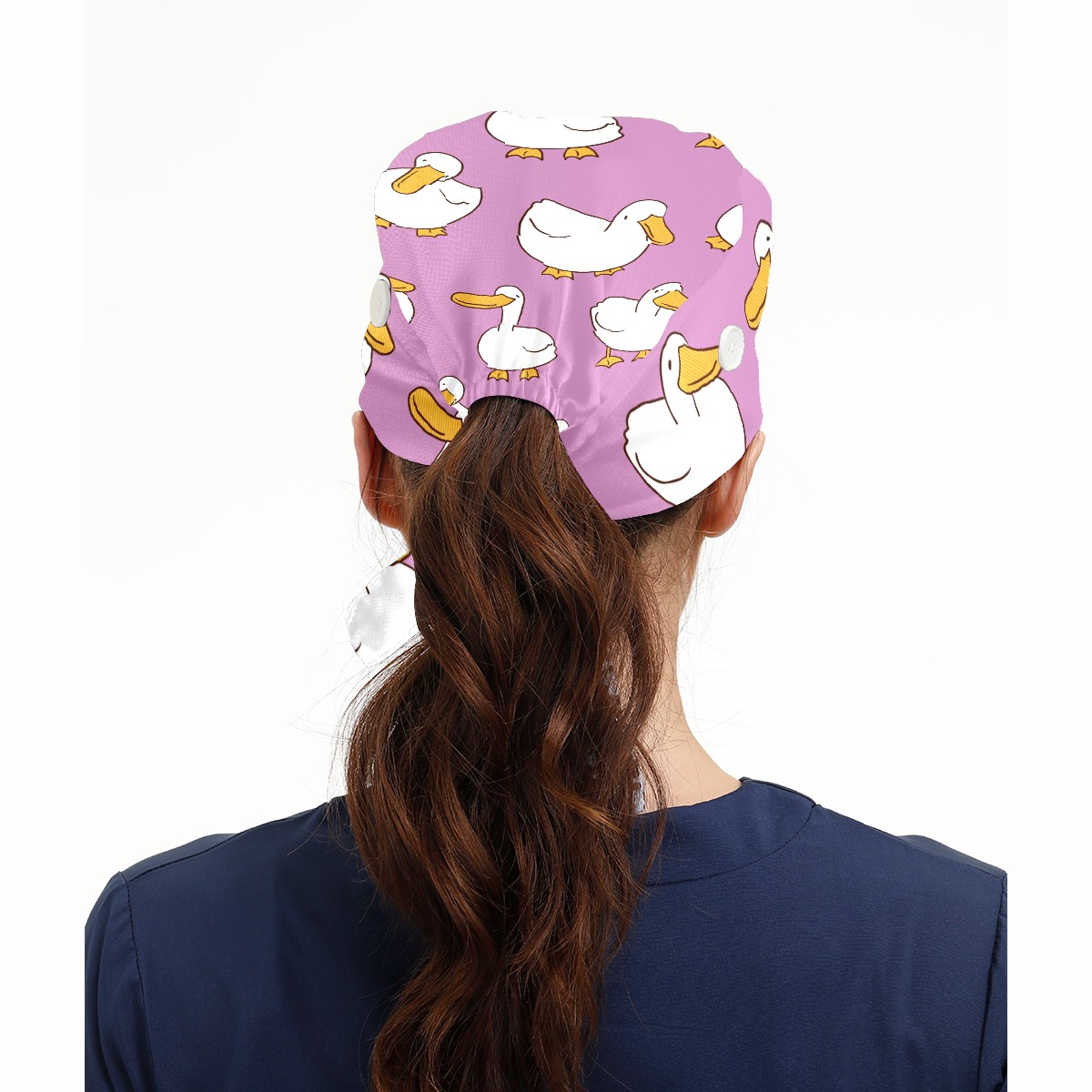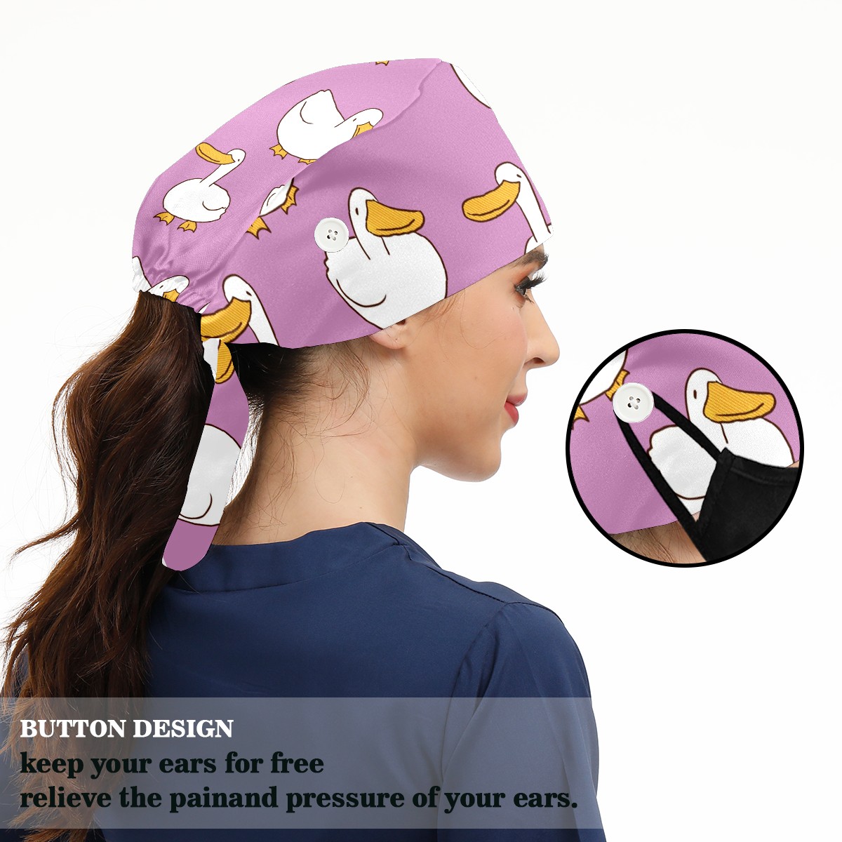Working Caps with Button & Sweatband Satin Lined Cotton Adjustable Nurse Hats Elastic Band Scrub Cap Surgeon Hat Cartoon Duck On Purple Background