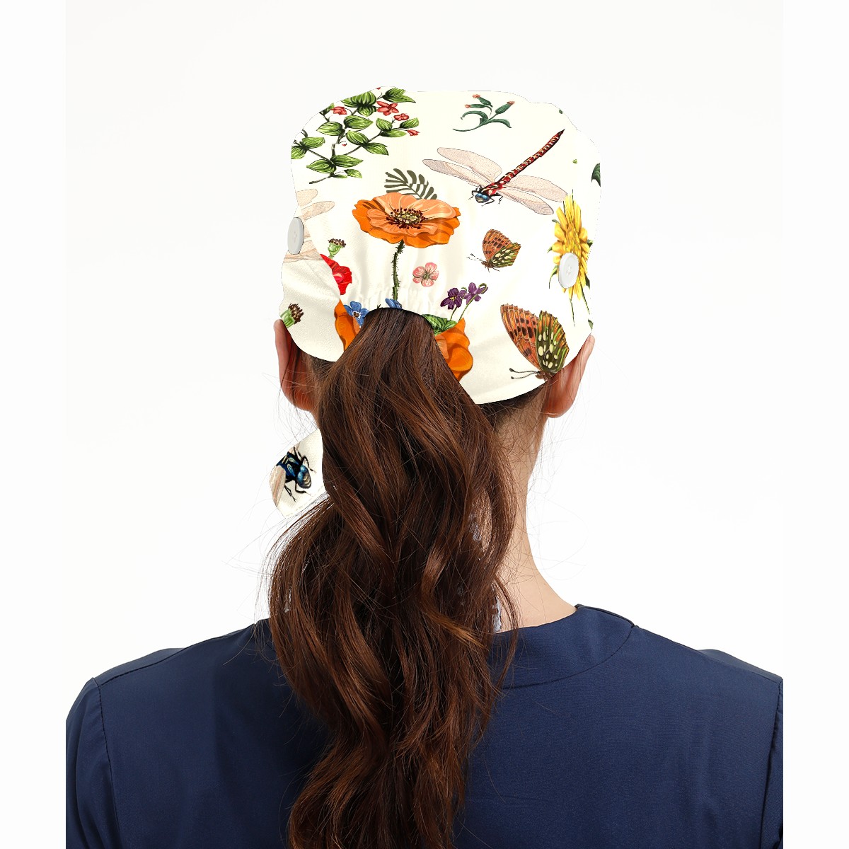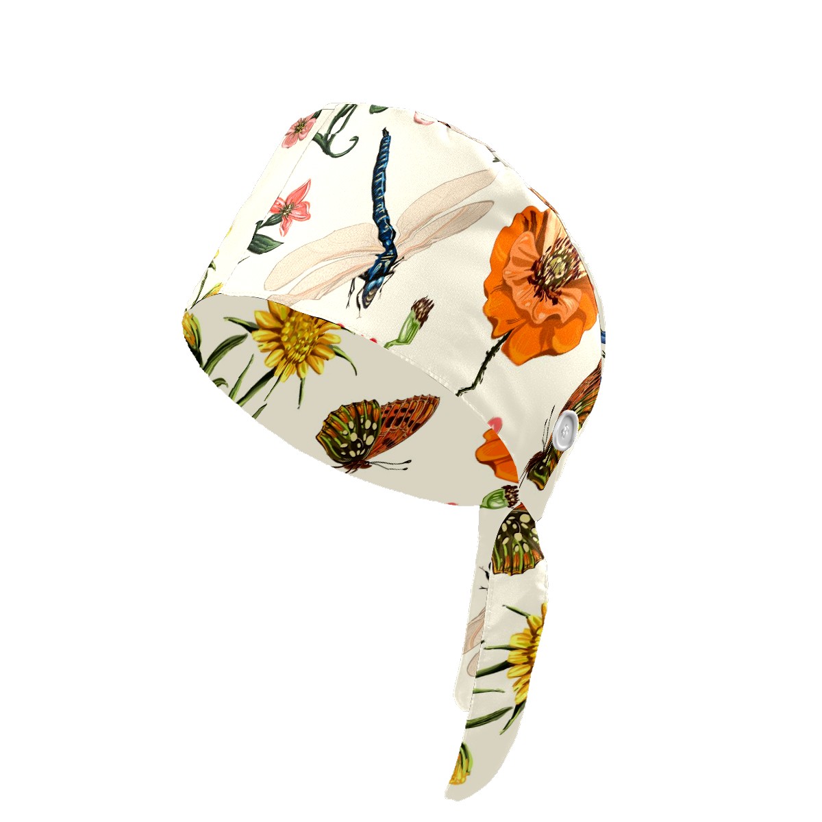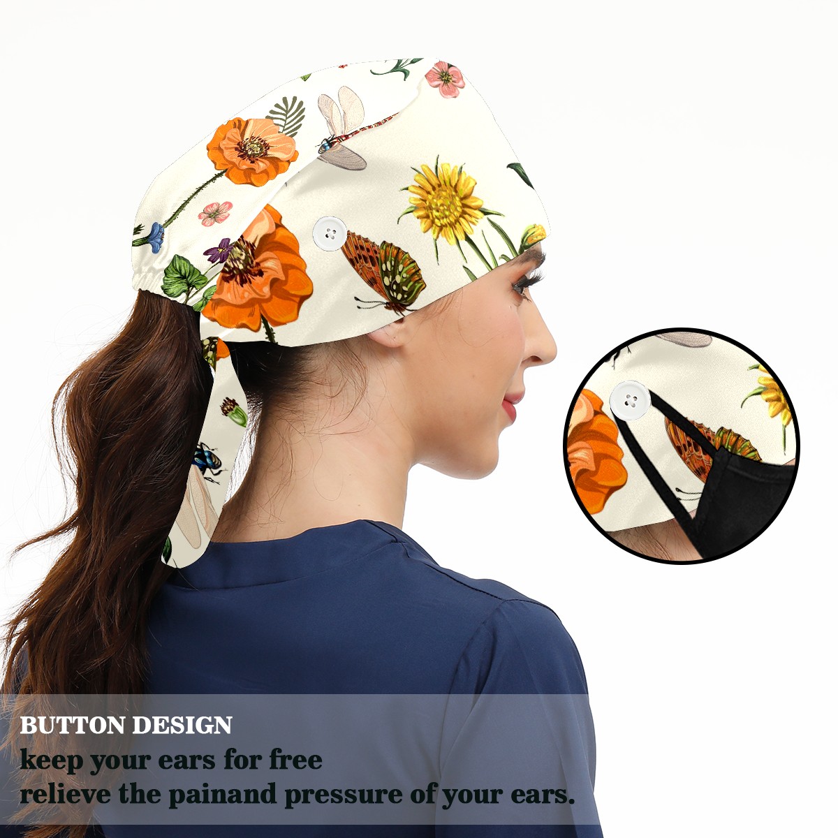 Working Caps with Button & Sweatband Satin Lined Cotton Adjustable Nurse Hats Elastic Band Scrub Cap Surgeon Hat Summer Dragonflies Butterflies Poppies Flowers