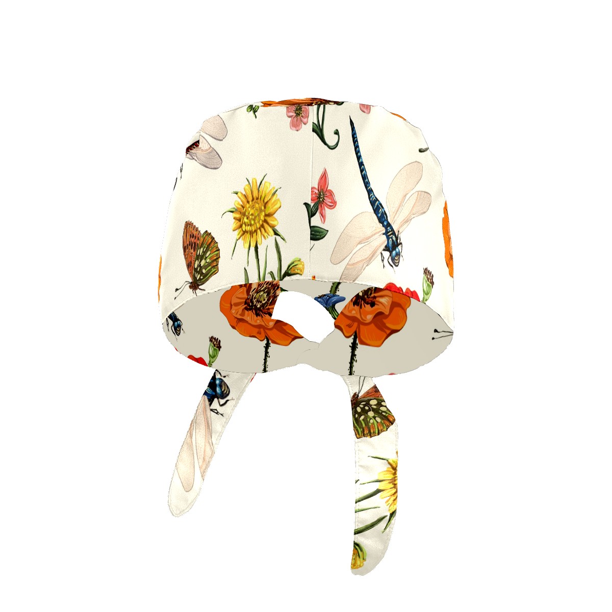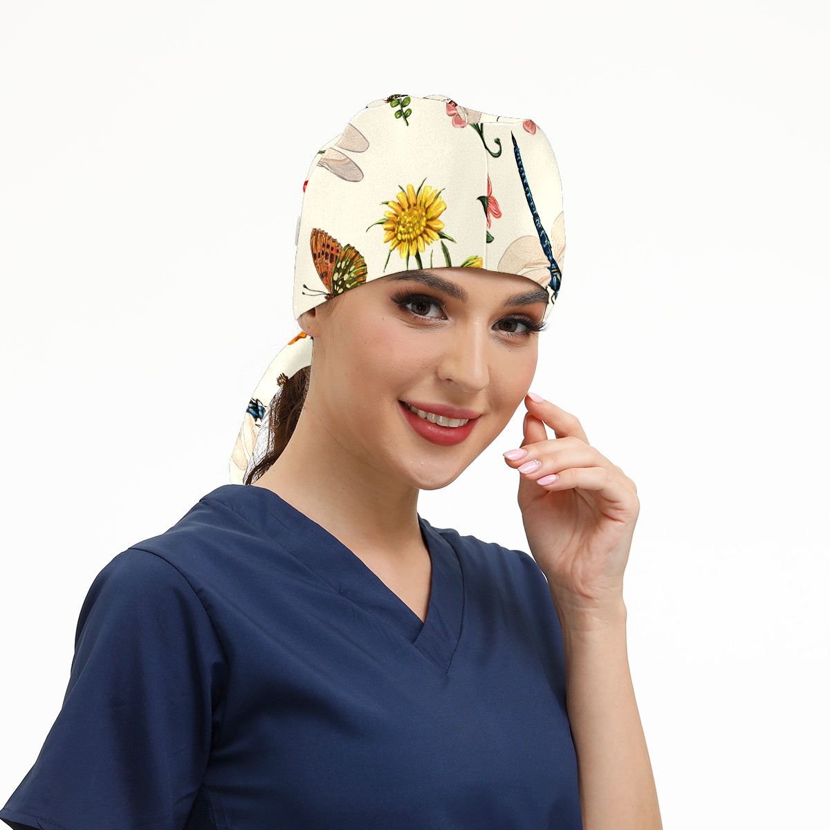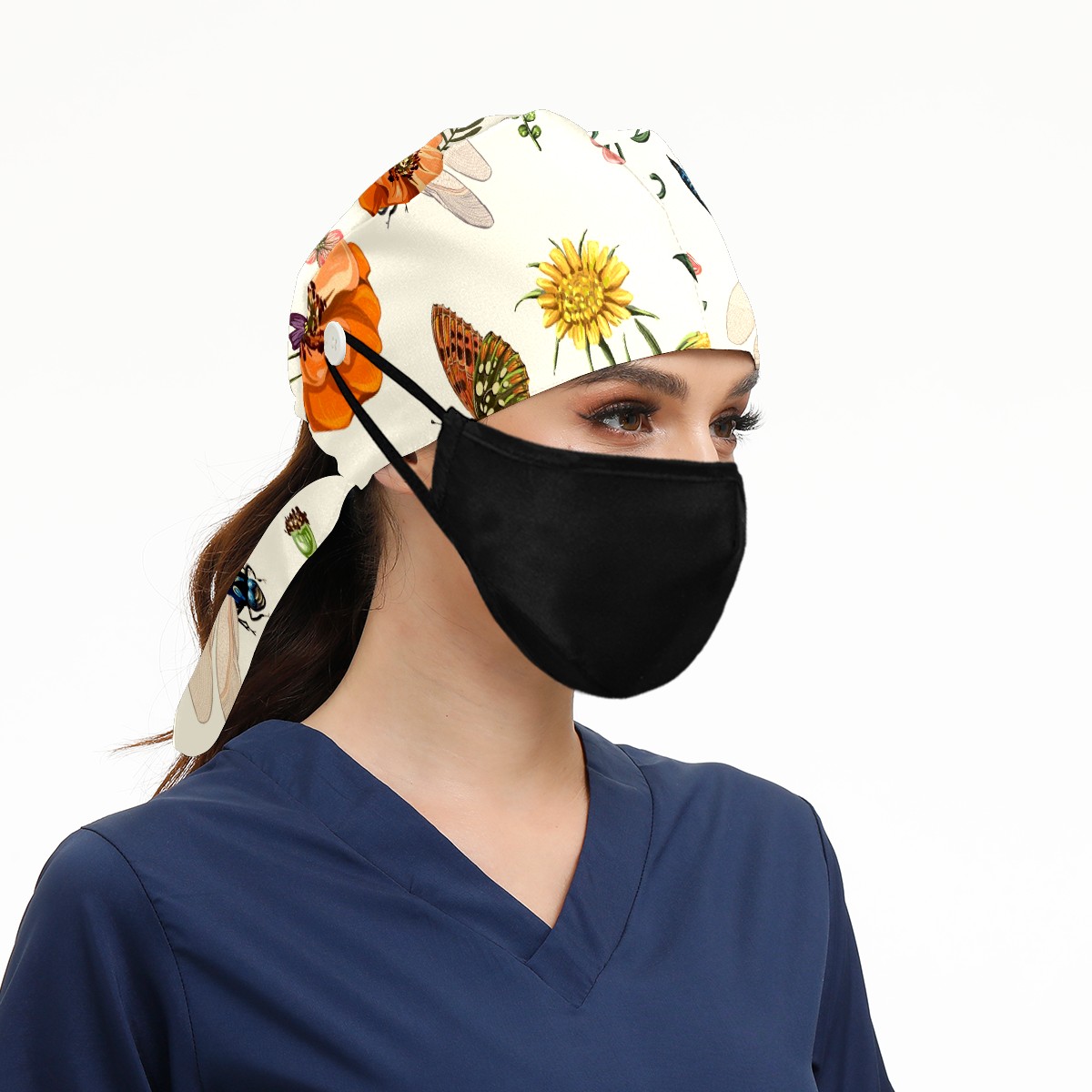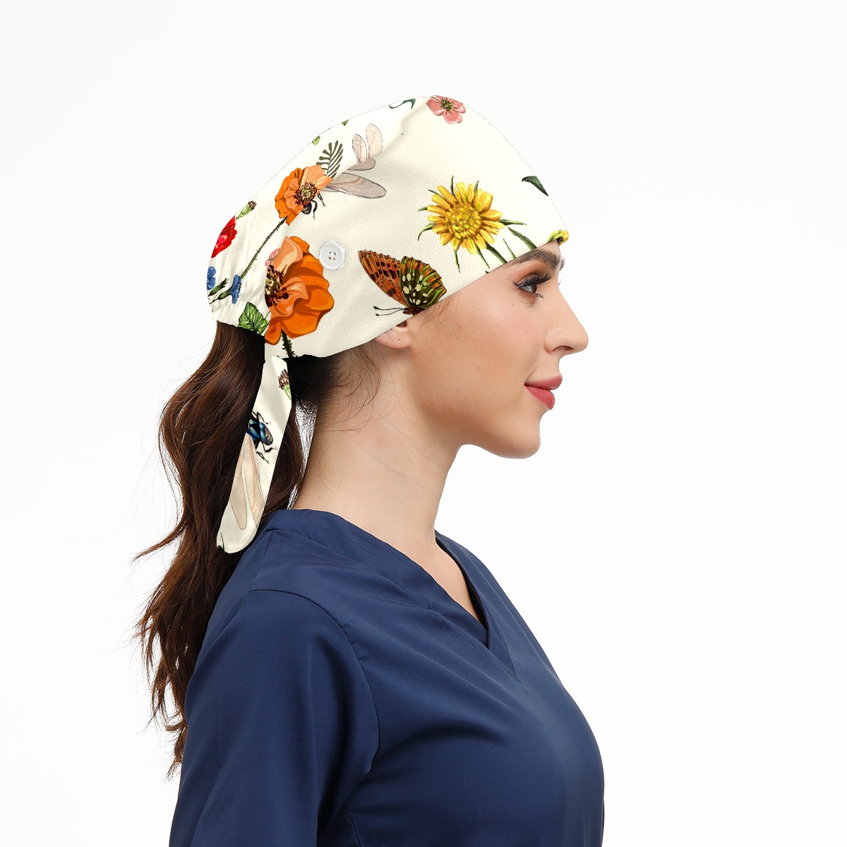 Working Caps with Button & Sweatband Satin Lined Cotton Adjustable Nurse Hats Elastic Band Scrub Cap Surgeon Hat Summer Dragonflies Butterflies Poppies Flowers