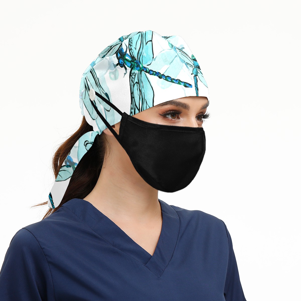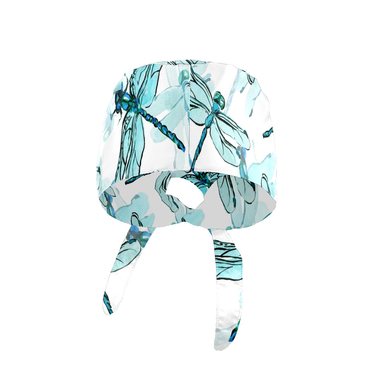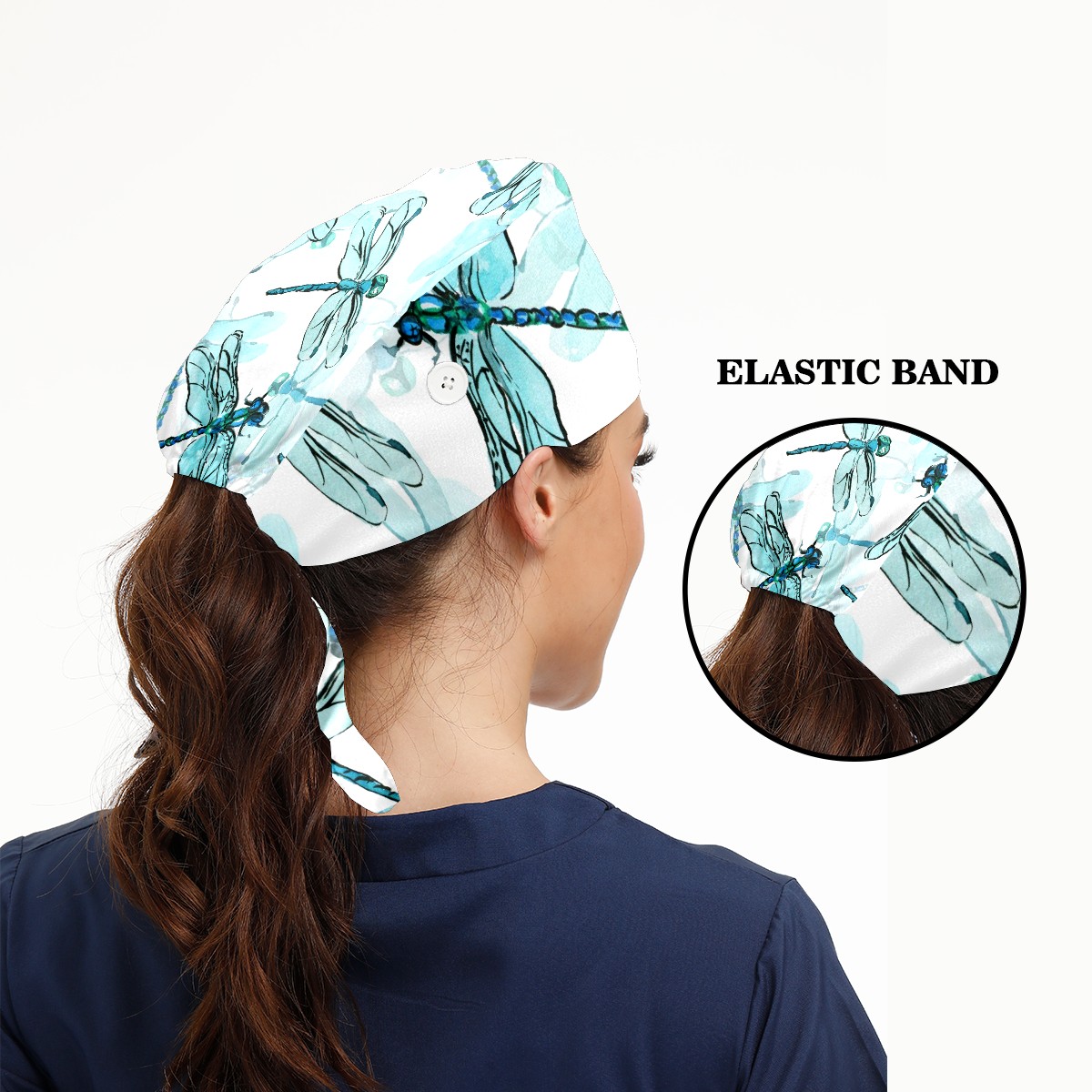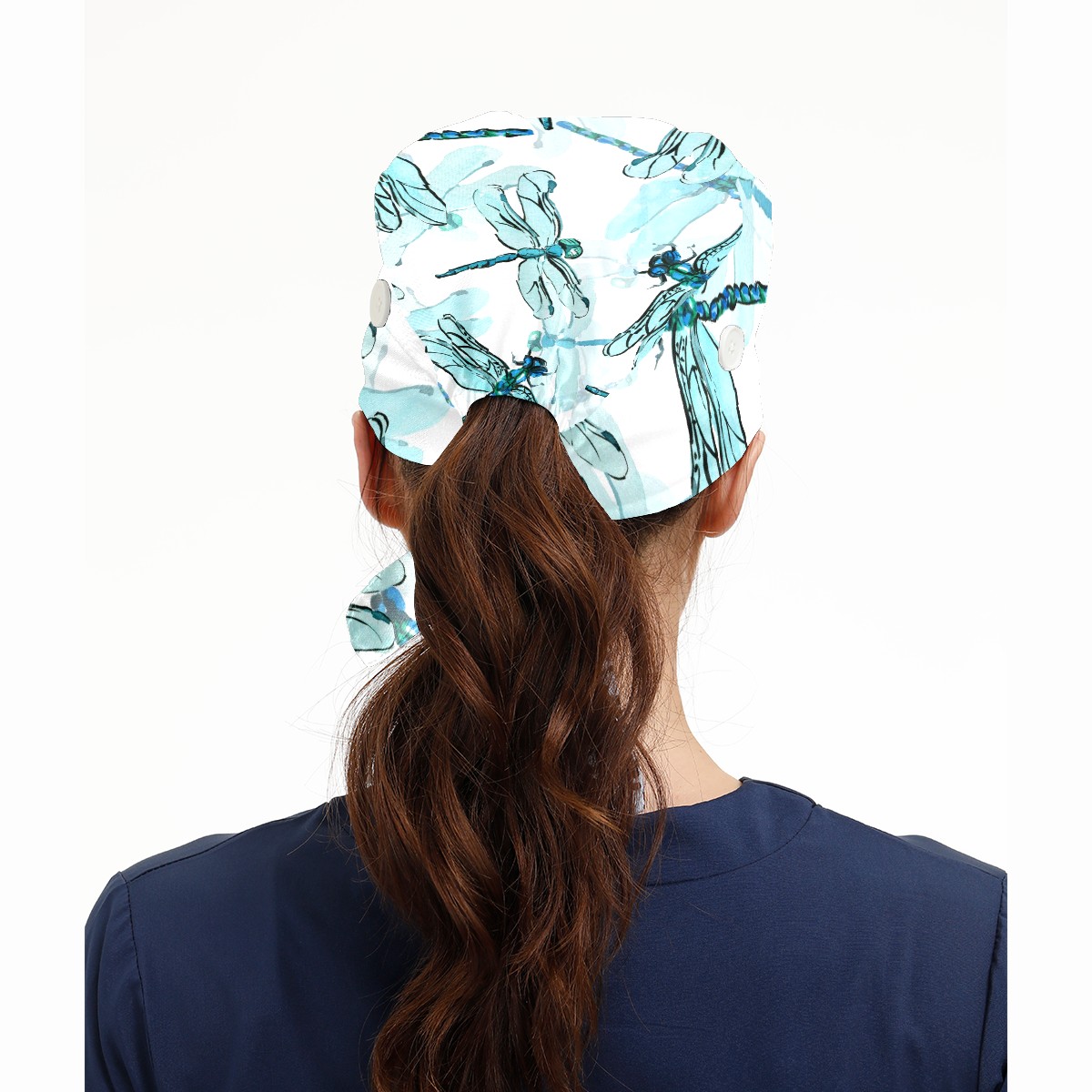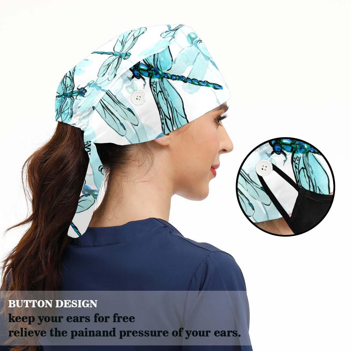 Working Caps with Button & Sweatband Satin Lined Cotton Adjustable Nurse Hats Elastic Band Scrub Cap Surgeon Hat Elegant Dragonfly Watercolor