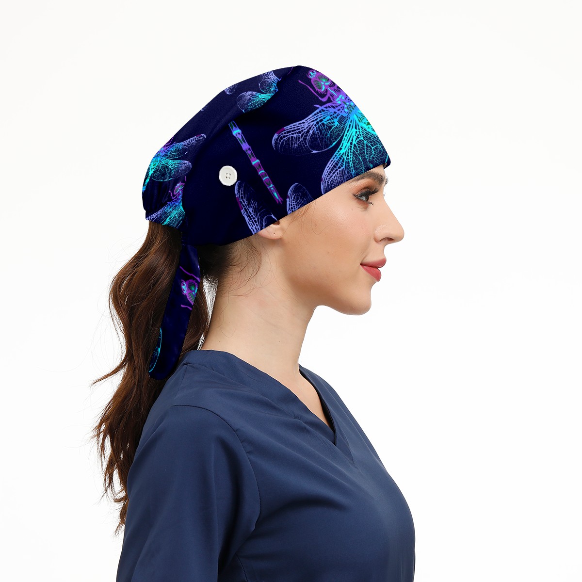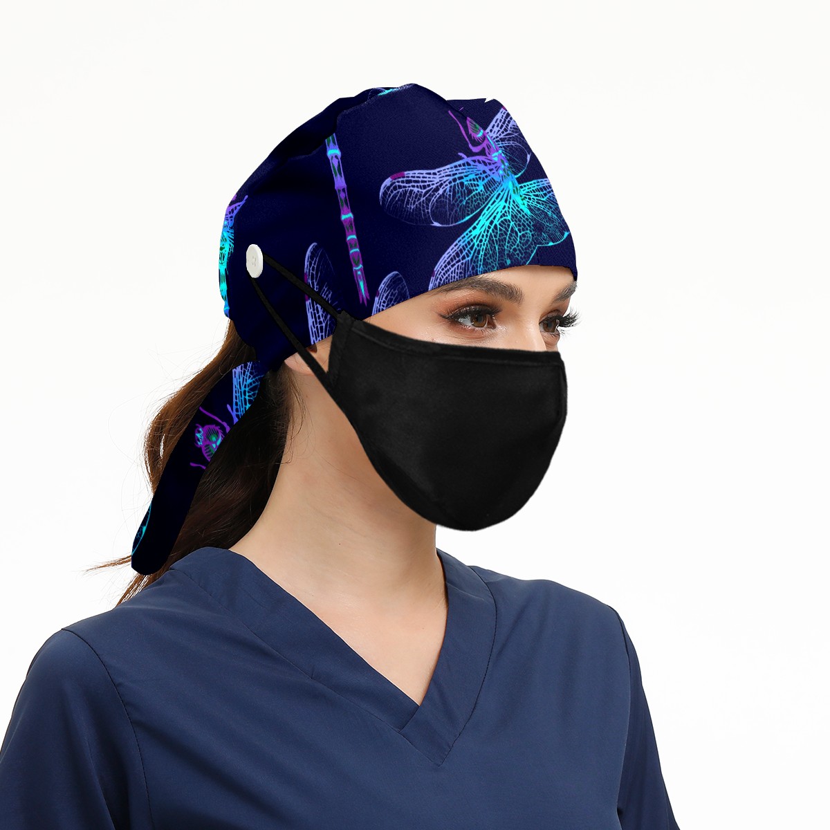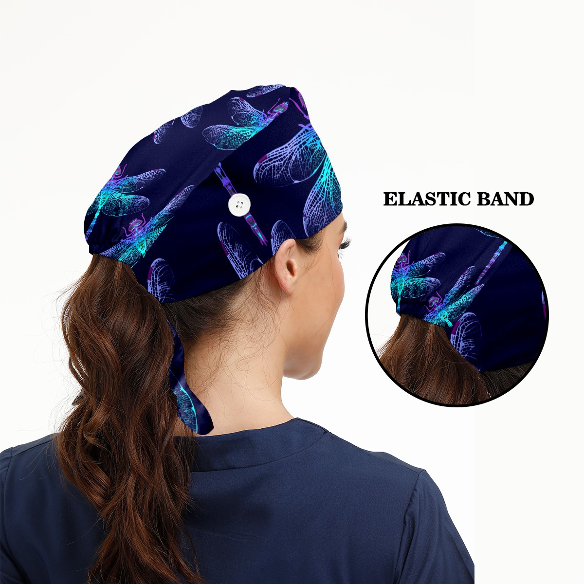 Working Caps with Button & Sweatband Satin Lined Cotton Adjustable Nurse Hats Elastic Band Scrub Cap Surgeon Hat Dragonfly On Dark Blue Background