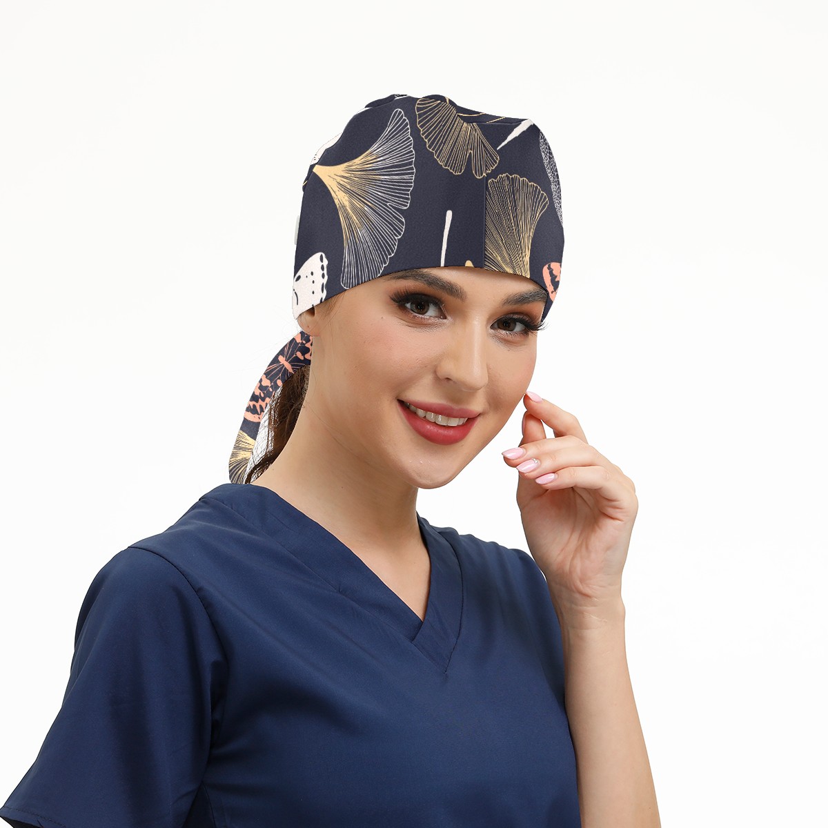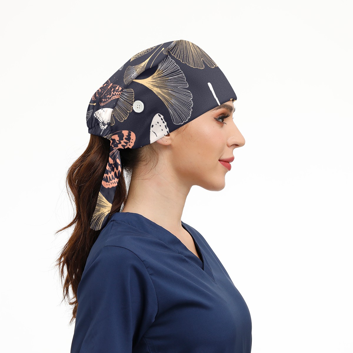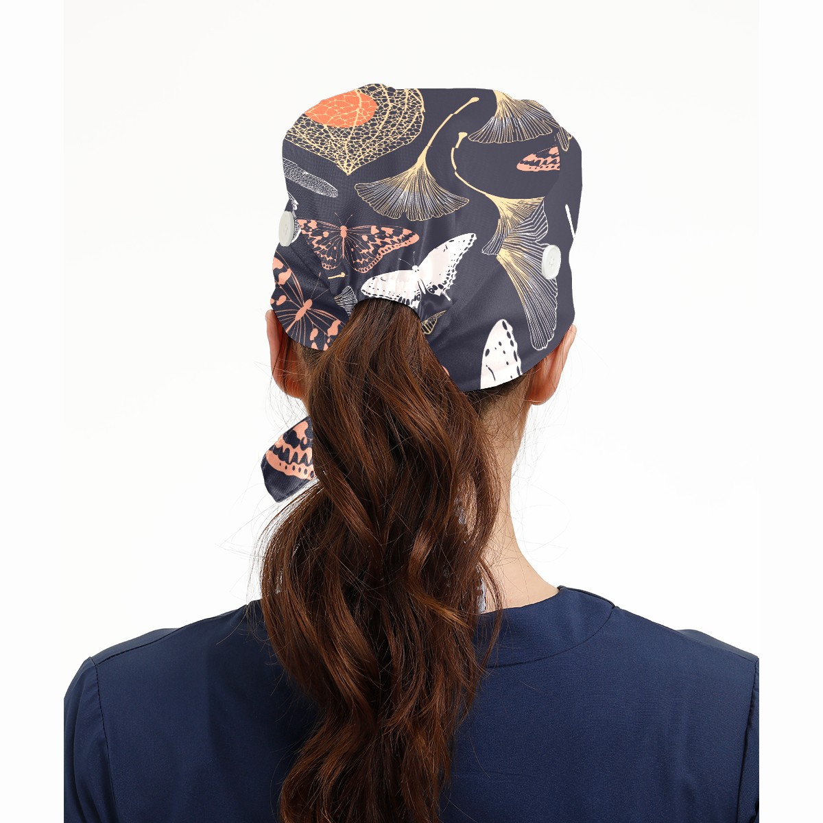 Working Caps with Button & Sweatband Satin Lined Cotton Adjustable Nurse Hats Elastic Band Scrub Cap Surgeon Hat Dragonfly Butterfly Ginkgo Leaves