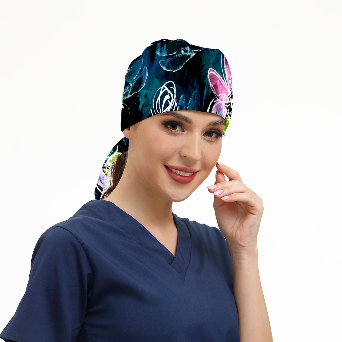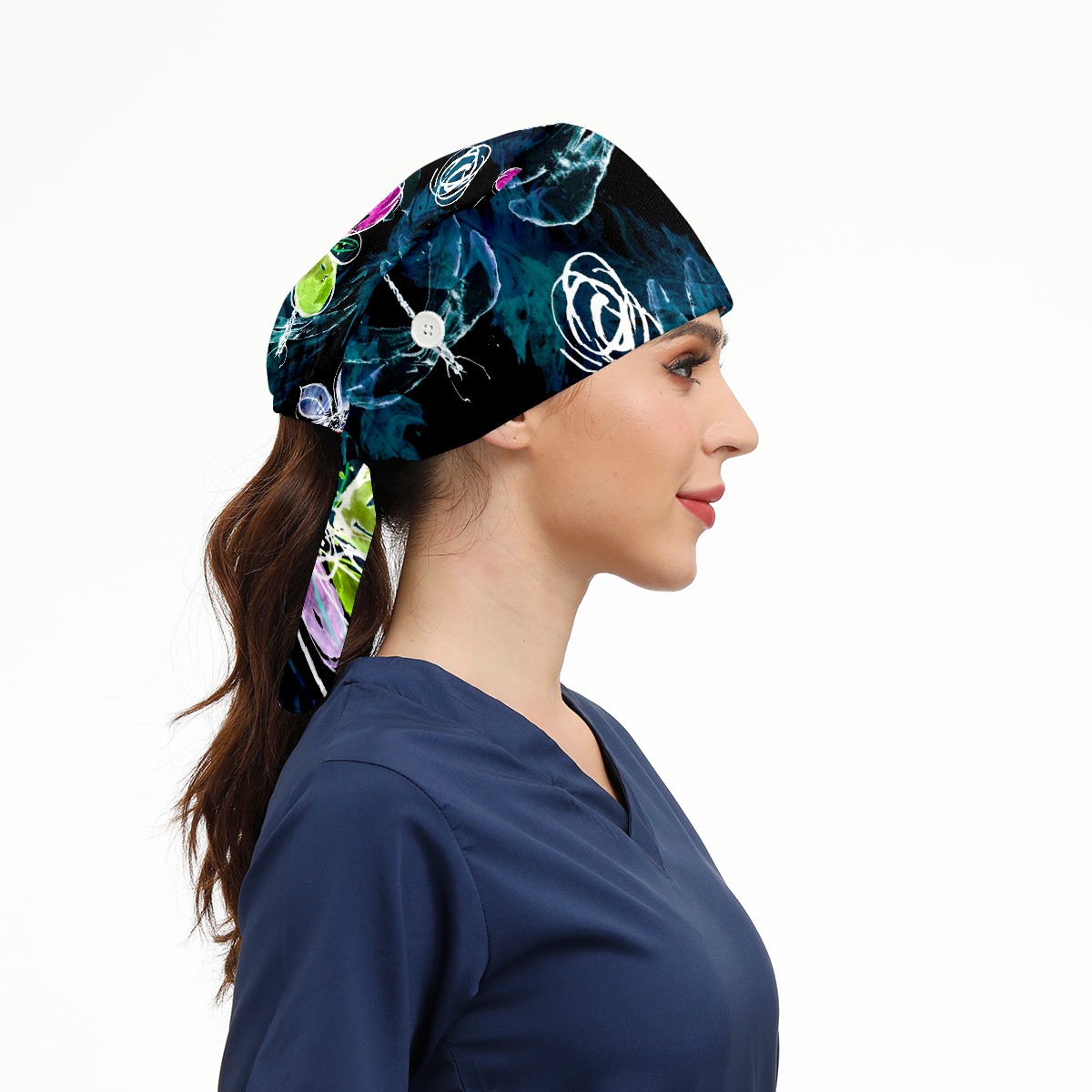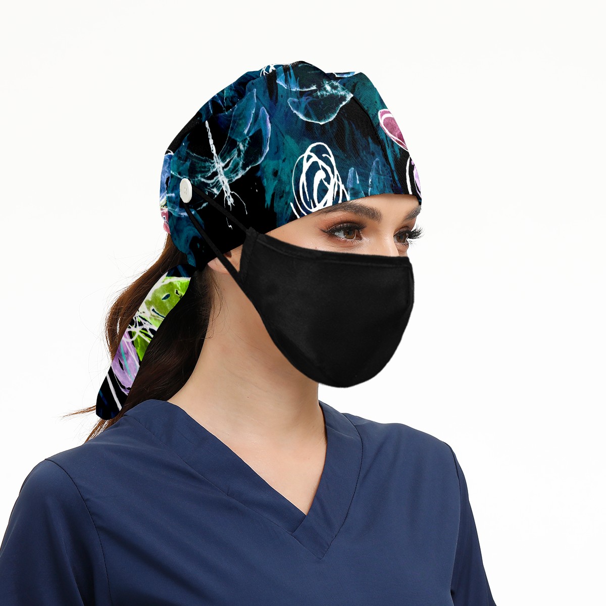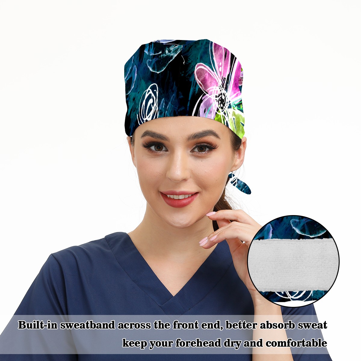 Working Caps with Button & Sweatband Satin Lined Cotton Adjustable Nurse Hats Elastic Band Scrub Cap Surgeon Hat Abstract Art Dragonfly Flower