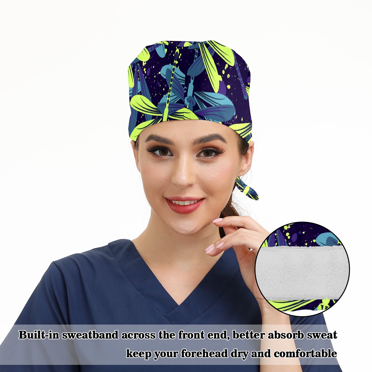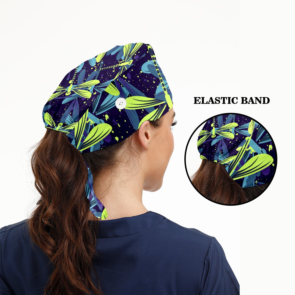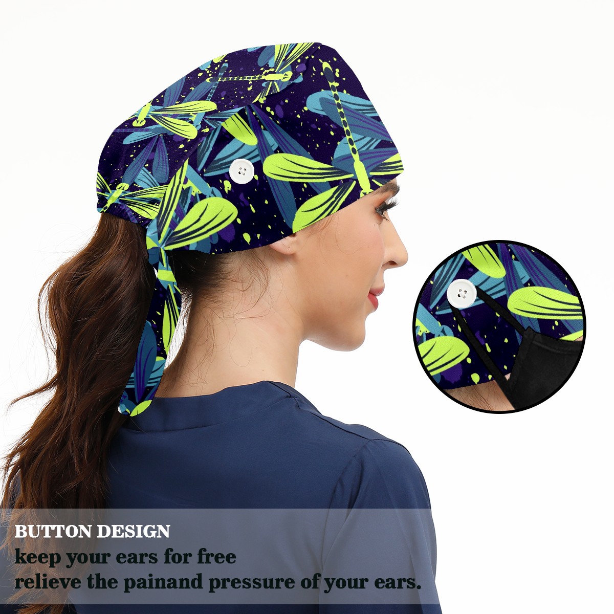 Working Caps with Button & Sweatband Satin Lined Cotton Adjustable Nurse Hats Elastic Band Scrub Cap Surgeon Hat Blue Green Dragonfly
