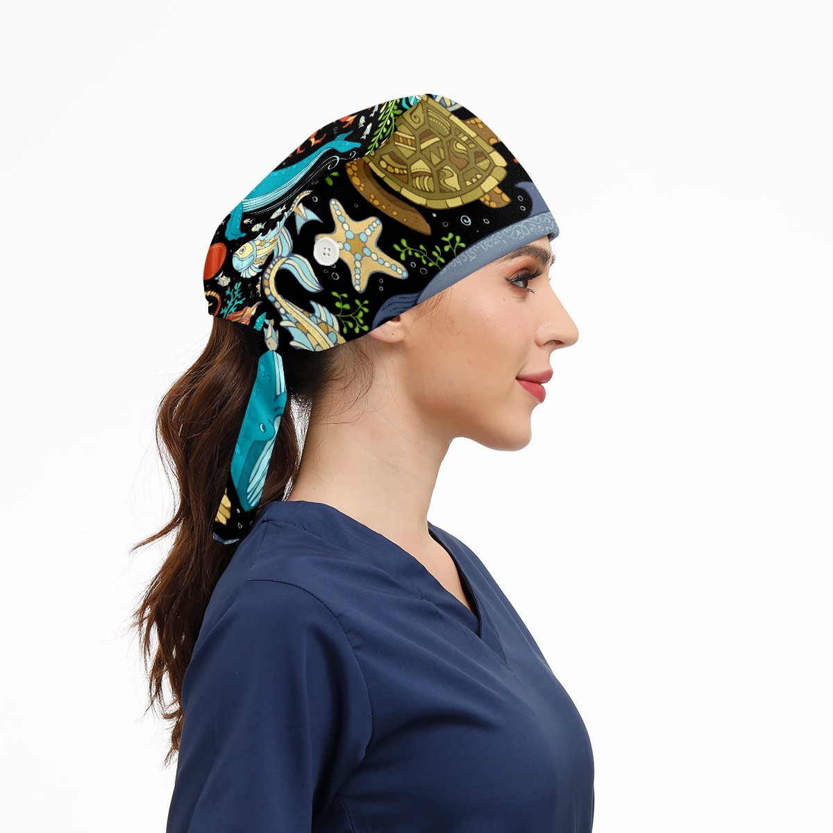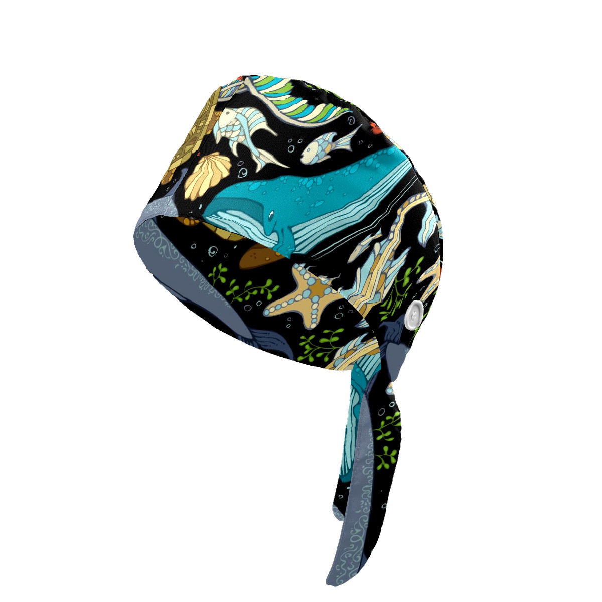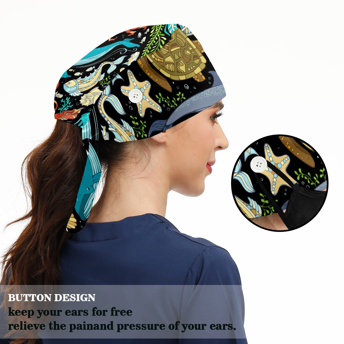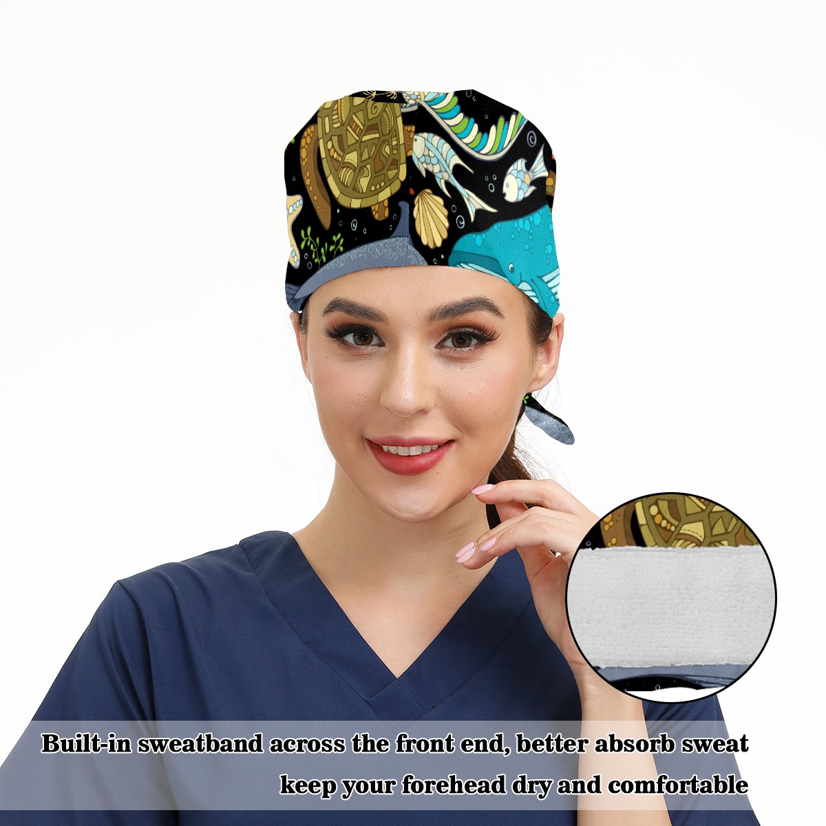 Working Caps with Button & Sweatband Satin Lined Cotton Adjustable Nurse Hats Elastic Band Scrub Cap Surgeon Hat Octopus Whale Dolphin Turtle Crab Seahorse