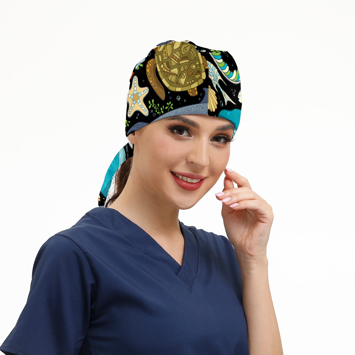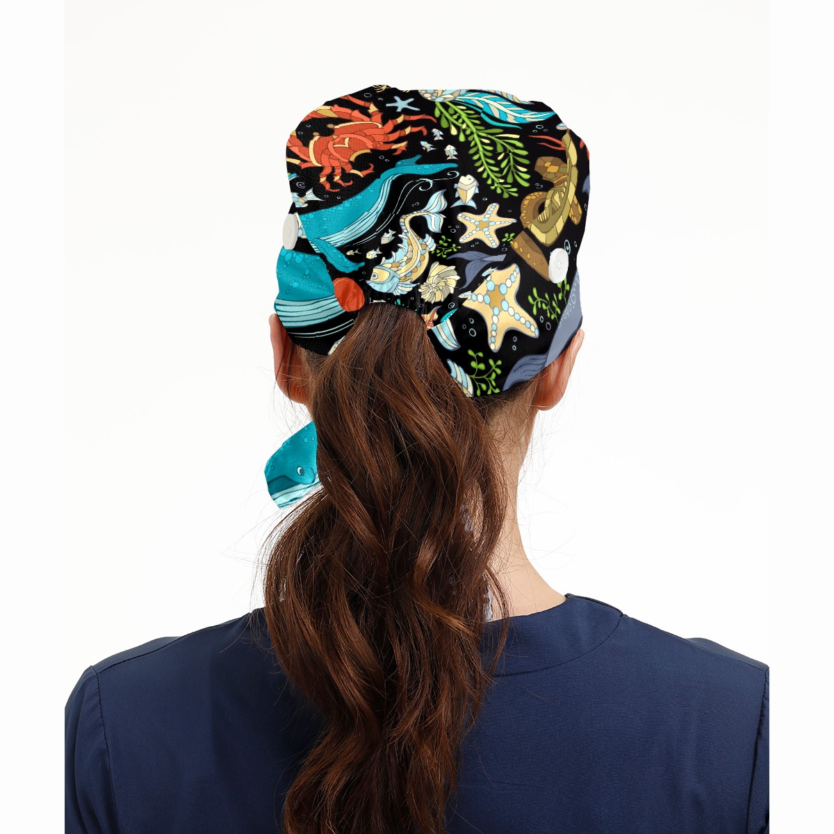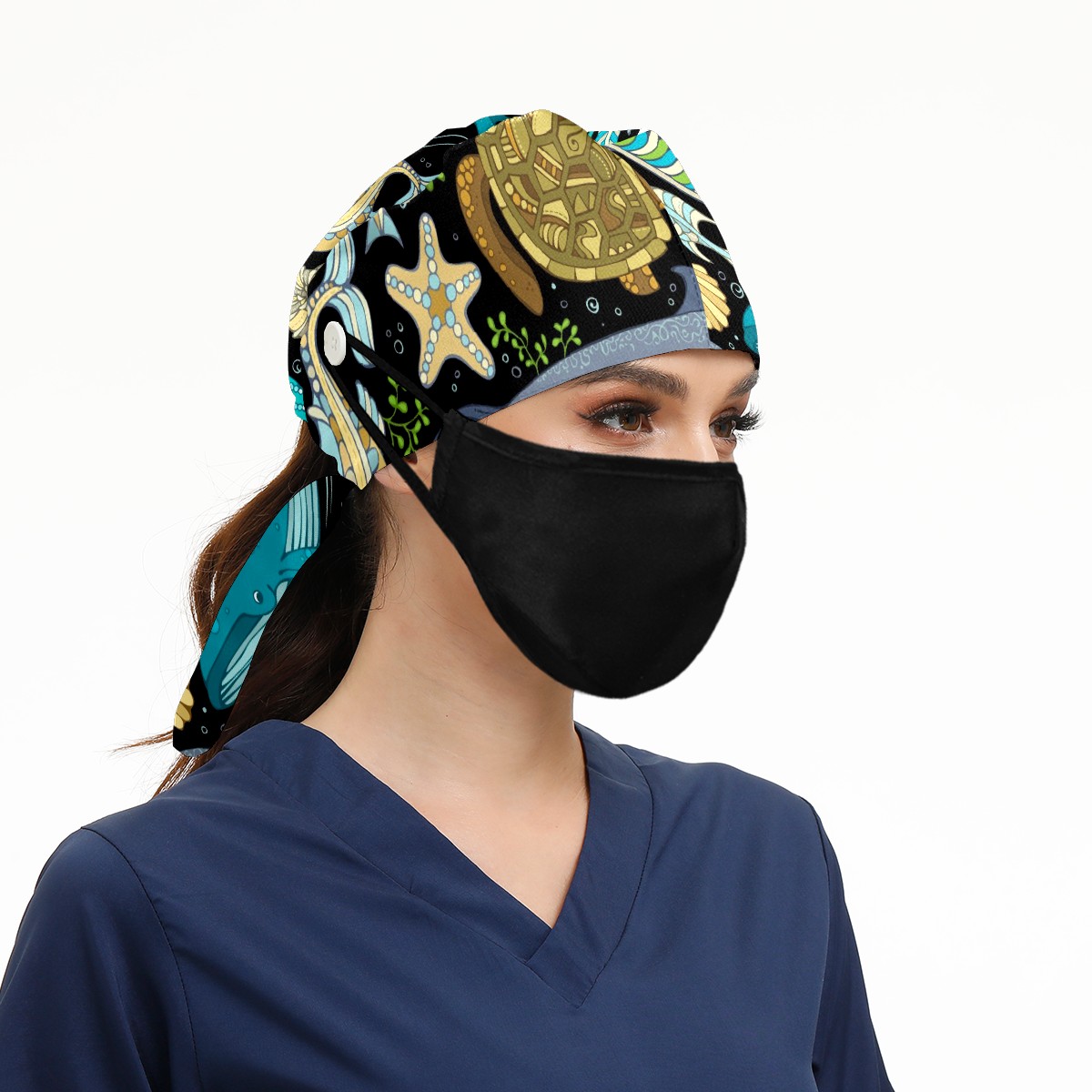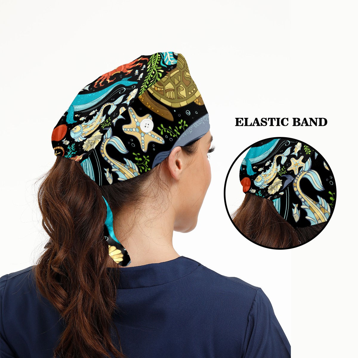 Working Caps with Button & Sweatband Satin Lined Cotton Adjustable Nurse Hats Elastic Band Scrub Cap Surgeon Hat Octopus Whale Dolphin Turtle Crab Seahorse