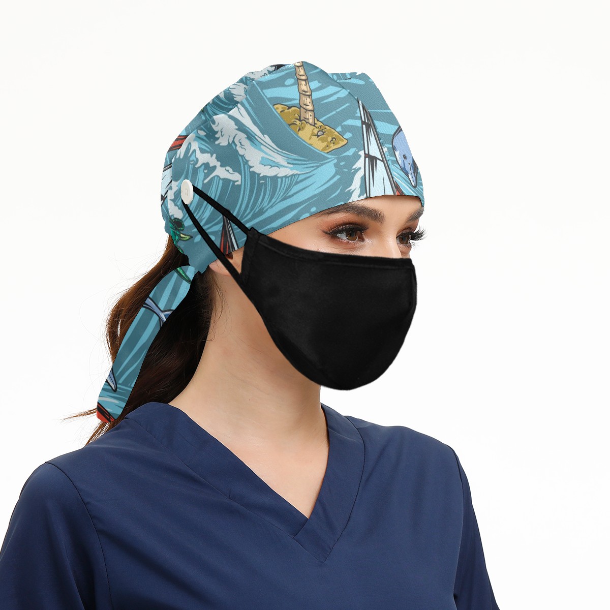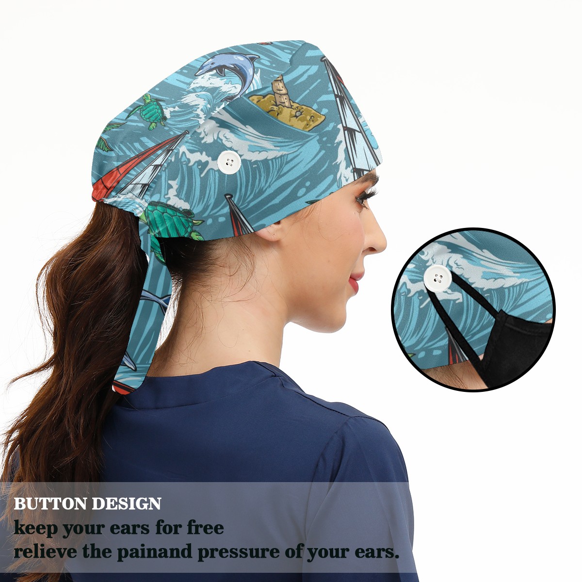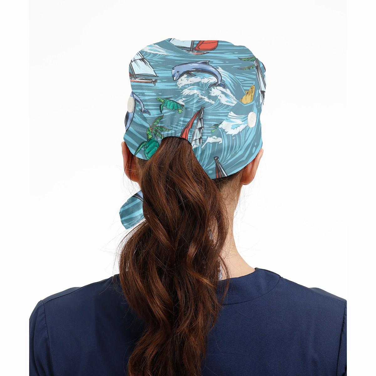 Working Caps with Button & Sweatband Satin Lined Cotton Adjustable Nurse Hats Elastic Band Scrub Cap Surgeon Hat Dolphin Turtle Sailing Yacht Palm Tree