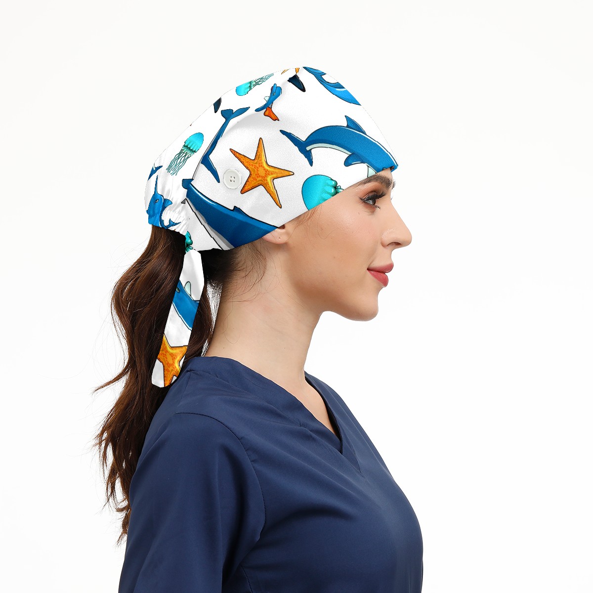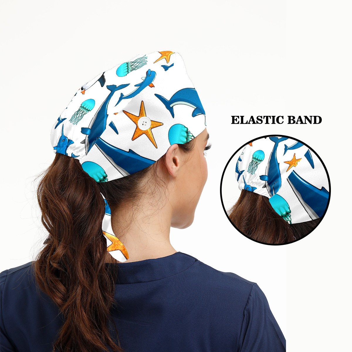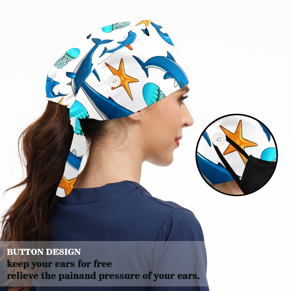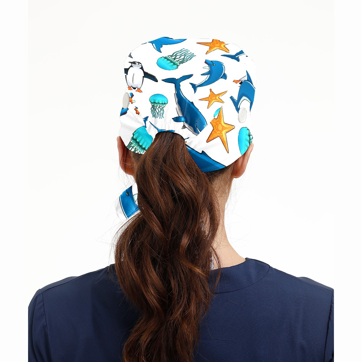 Working Caps with Button & Sweatband Satin Lined Cotton Adjustable Nurse Hats Elastic Band Scrub Cap Surgeon Hat Dolphin Penguin Shark Whale Starfish
