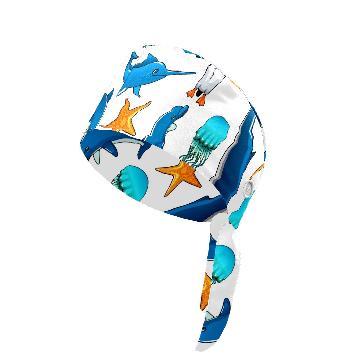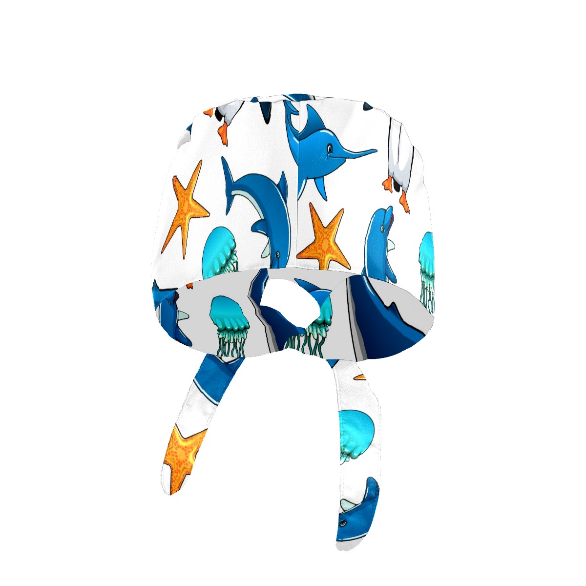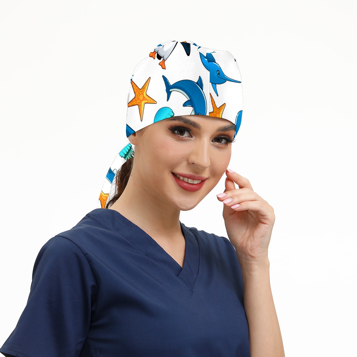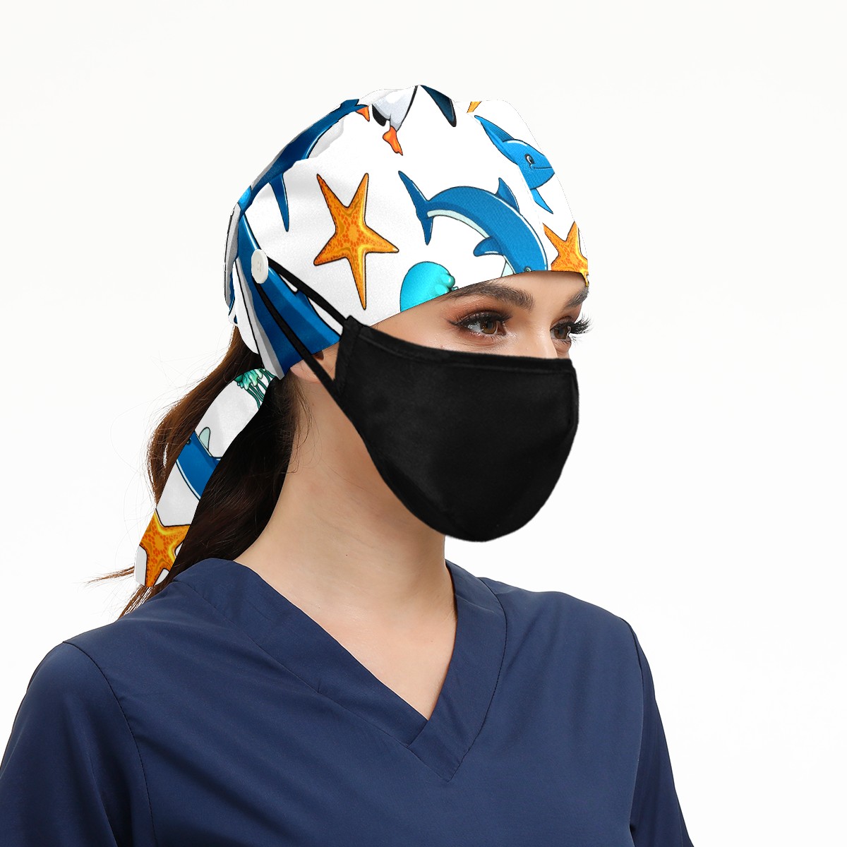 Working Caps with Button & Sweatband Satin Lined Cotton Adjustable Nurse Hats Elastic Band Scrub Cap Surgeon Hat Dolphin Penguin Shark Whale Starfish