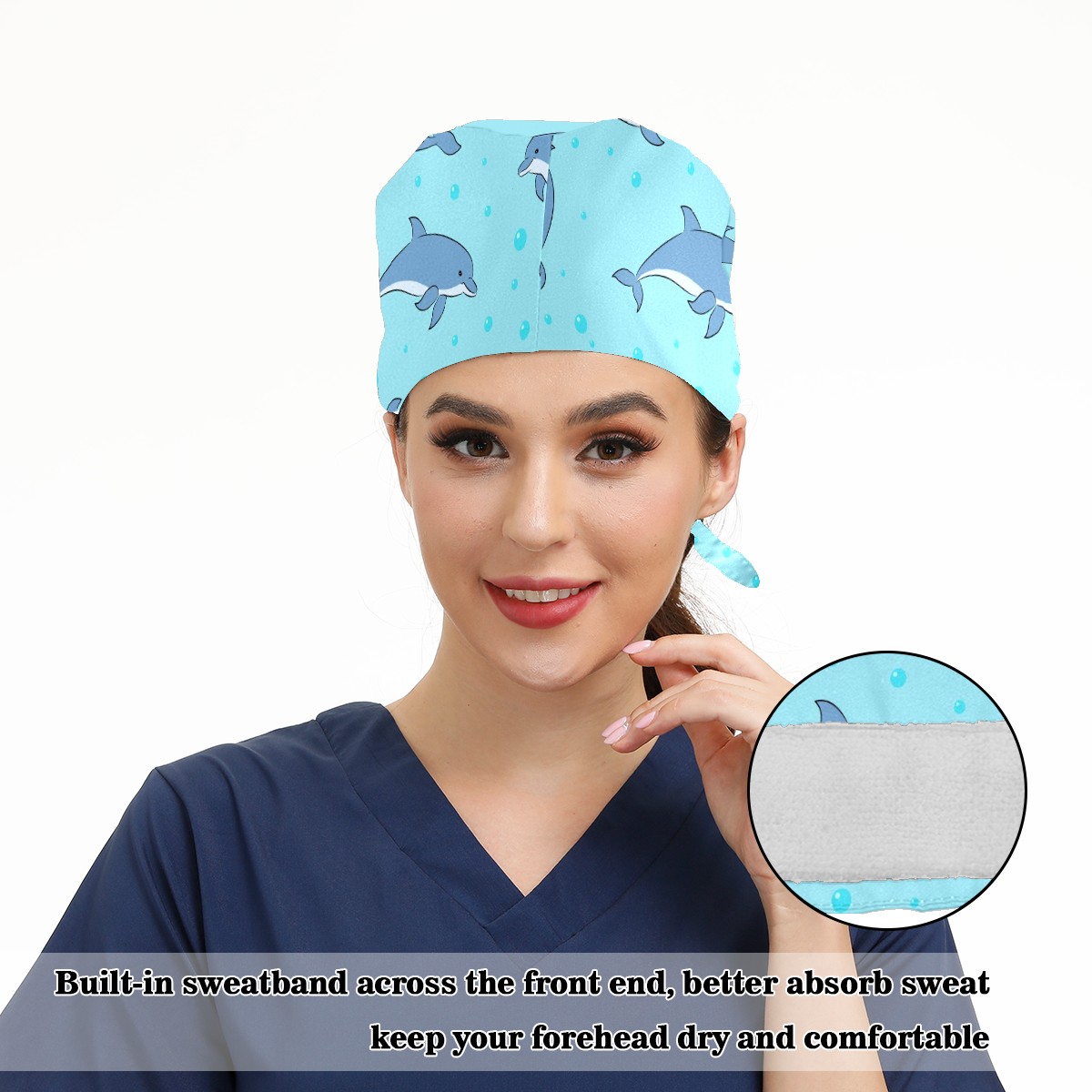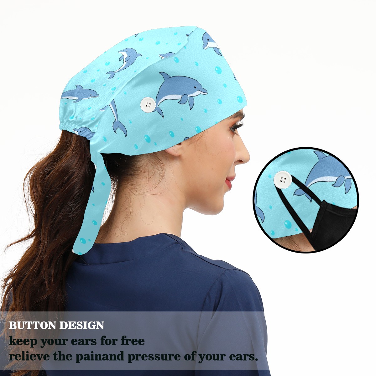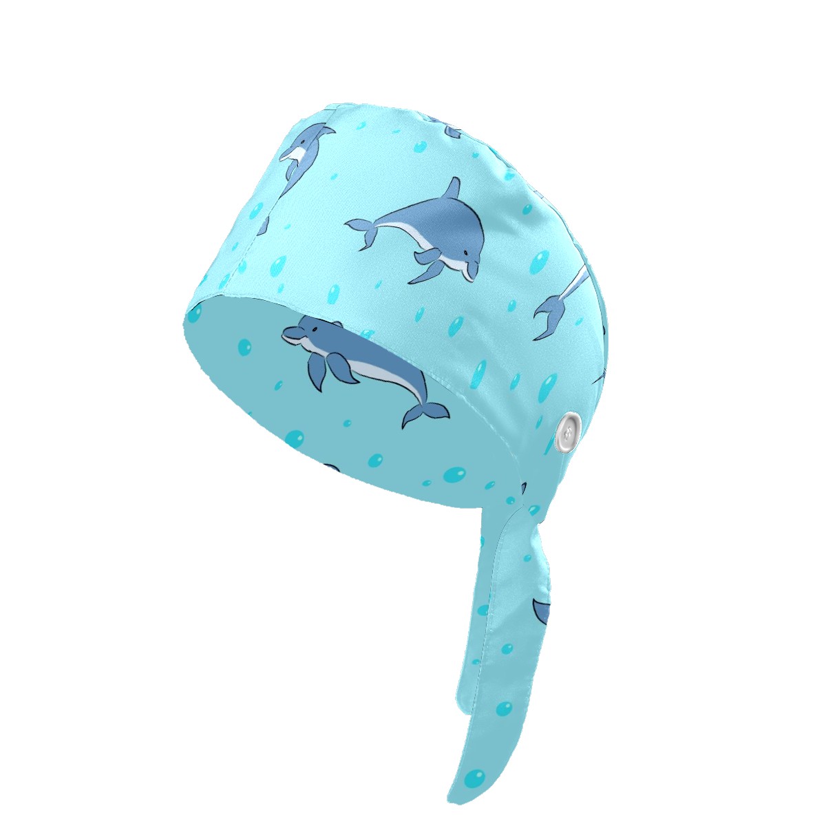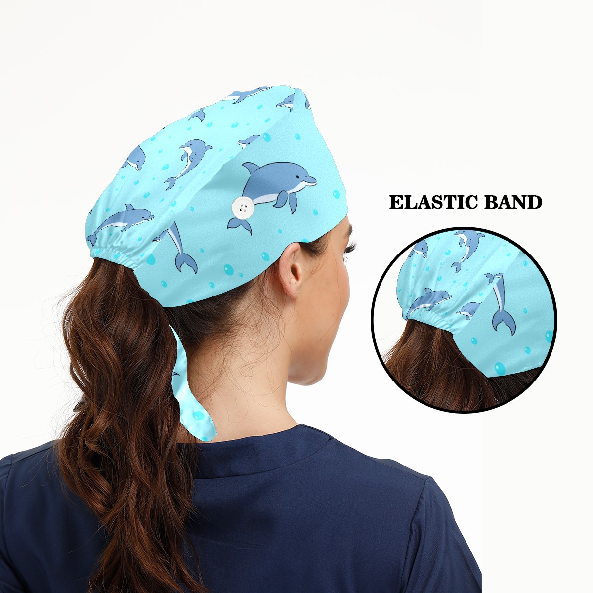 Working Caps with Button & Sweatband Satin Lined Cotton Adjustable Nurse Hats Elastic Band Scrub Cap Surgeon Hat Dolphin Bubbles