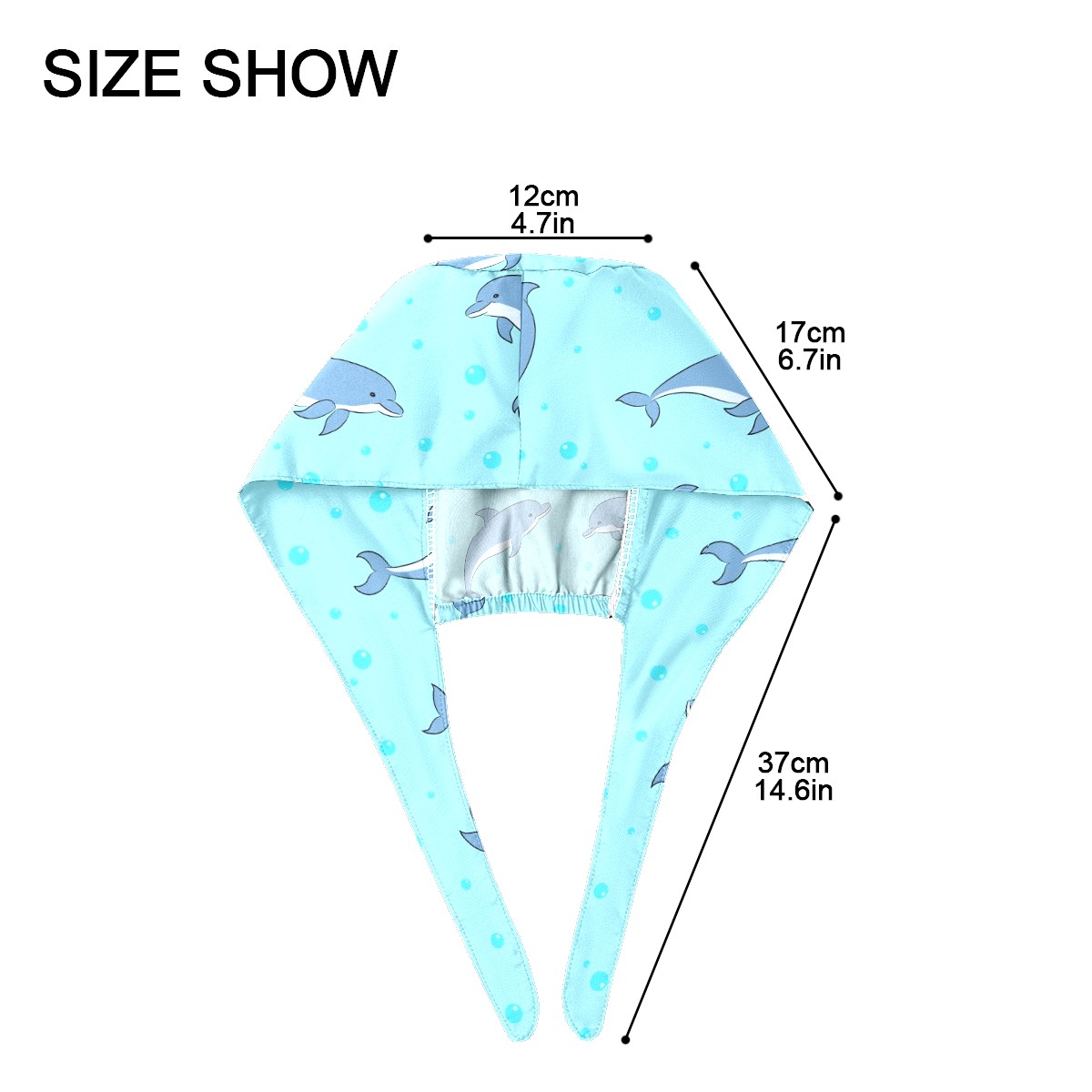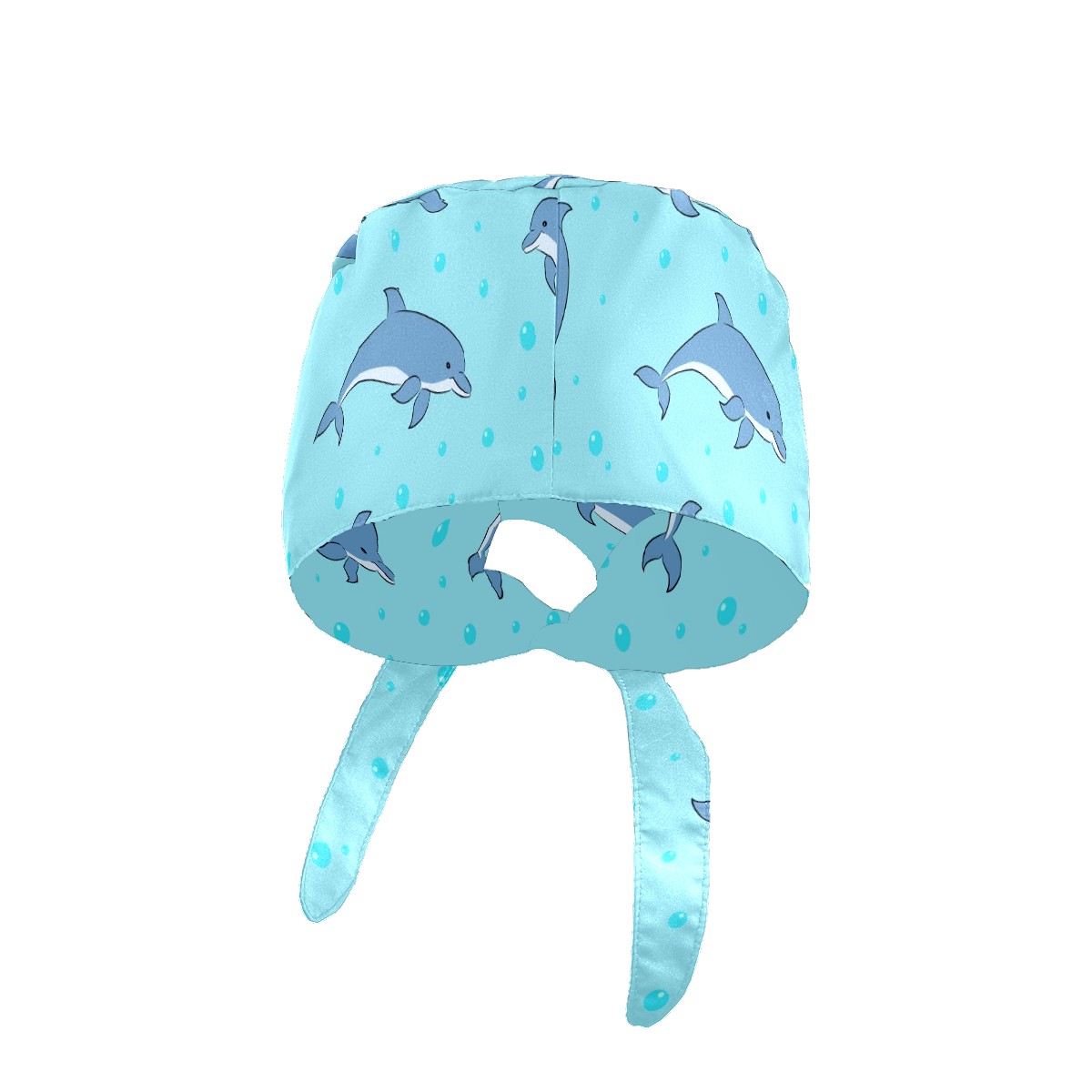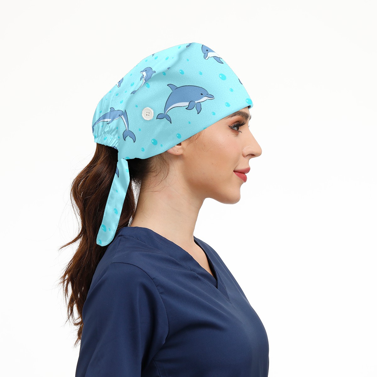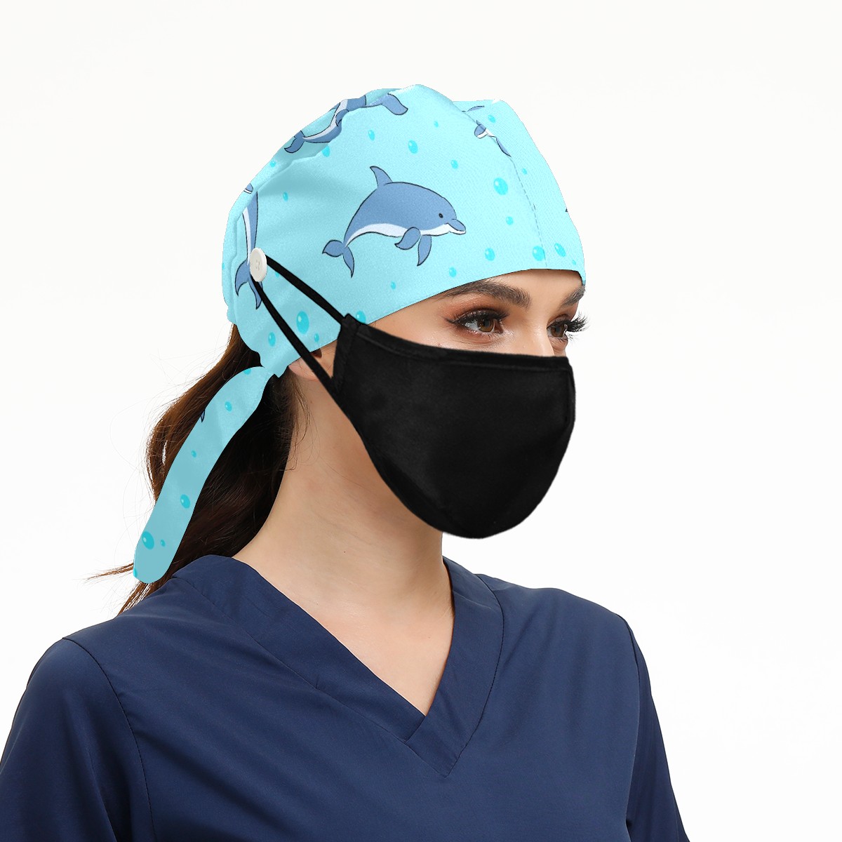 Working Caps with Button & Sweatband Satin Lined Cotton Adjustable Nurse Hats Elastic Band Scrub Cap Surgeon Hat Dolphin Bubbles