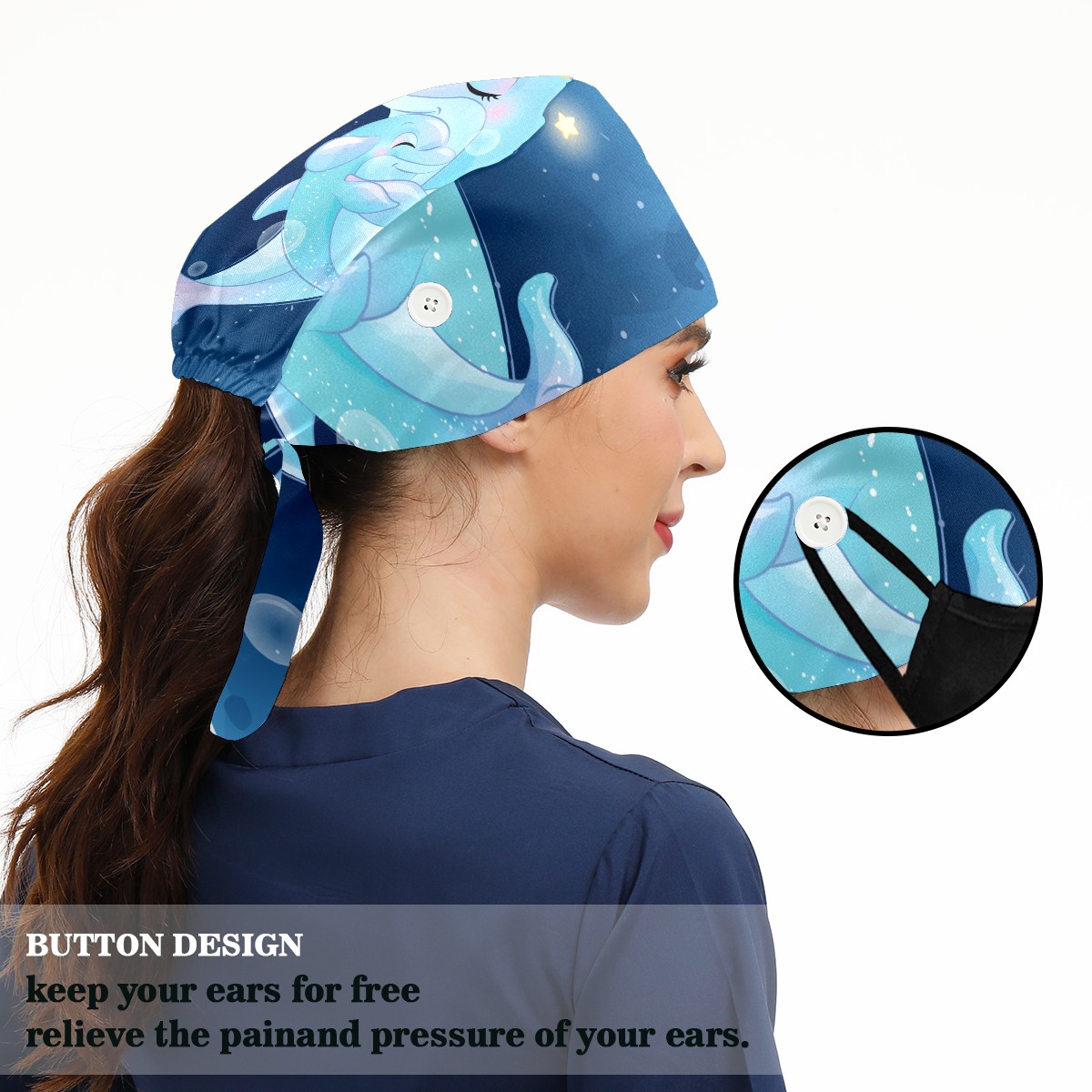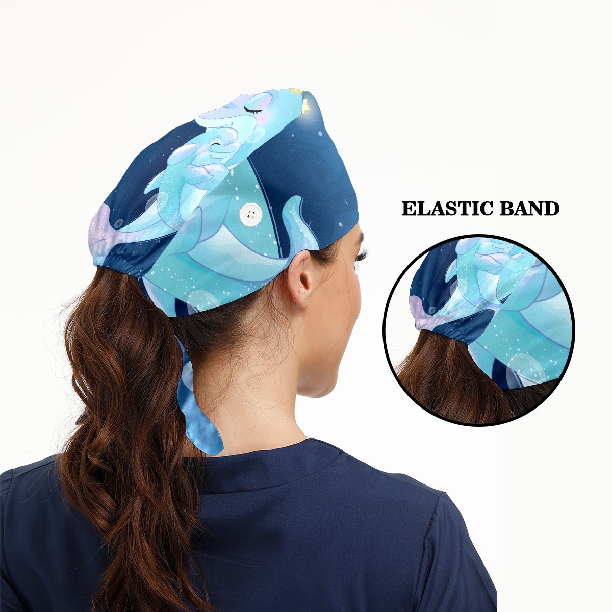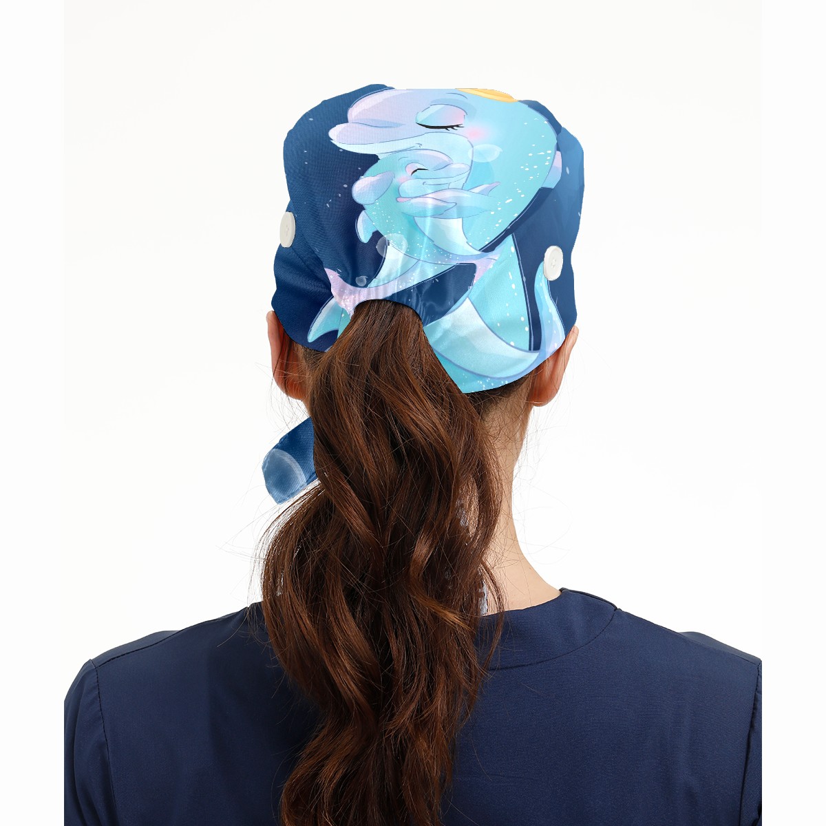 Working Caps with Button & Sweatband Satin Lined Cotton Adjustable Nurse Hats Elastic Band Scrub Cap Surgeon Hat Cute Dolphin Mother And Baby