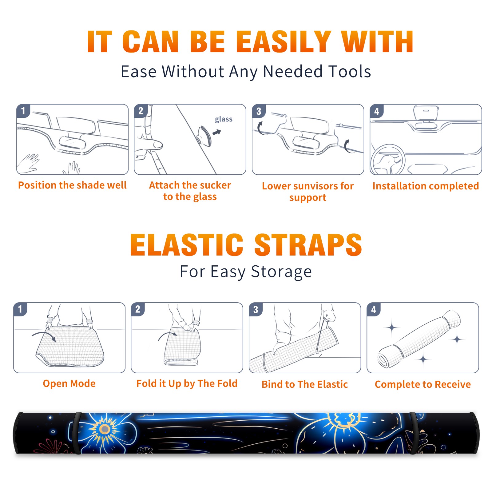 • Diameter /Size 63"L x 33.5"W</b><br> Made from excellent materials which makes it sturdy and protects the car from the sun. Easy to use and pack. Makes the interior of the car cooler.You can easily stash the sunshade in the storage bag or store long term.It open and closes easy. Also the leather storage bag is durable and easy to put the umbrella back into.This windshield sunshade provides complete coverage and keeps your car interior cool under direct sun. It is easy to open and position under the windshield and around the rear-view mirror. Makes Your Car Easy To Identify, Perfect For Finding Your Car In Crowded Parking Lots And Garages.Great Choice: It Is A Great Gift For Dad, Boyfriend, Brother, Brother And Uncle, Friends, Classmates, Family And So On.<br> Notice:</b><br> Due To Difference Computer Monitors, The Color Maybe Slightly Different From Picture. As Different Measurement Methods, Measurement Data Will Float Within 2%.I Hope You Understand.<br> If You Have Any Question About The Item Please Do Not Hesitate To Contact Us Immediately And We Will Give You A Satisfactory Reply Within 24 Hours.