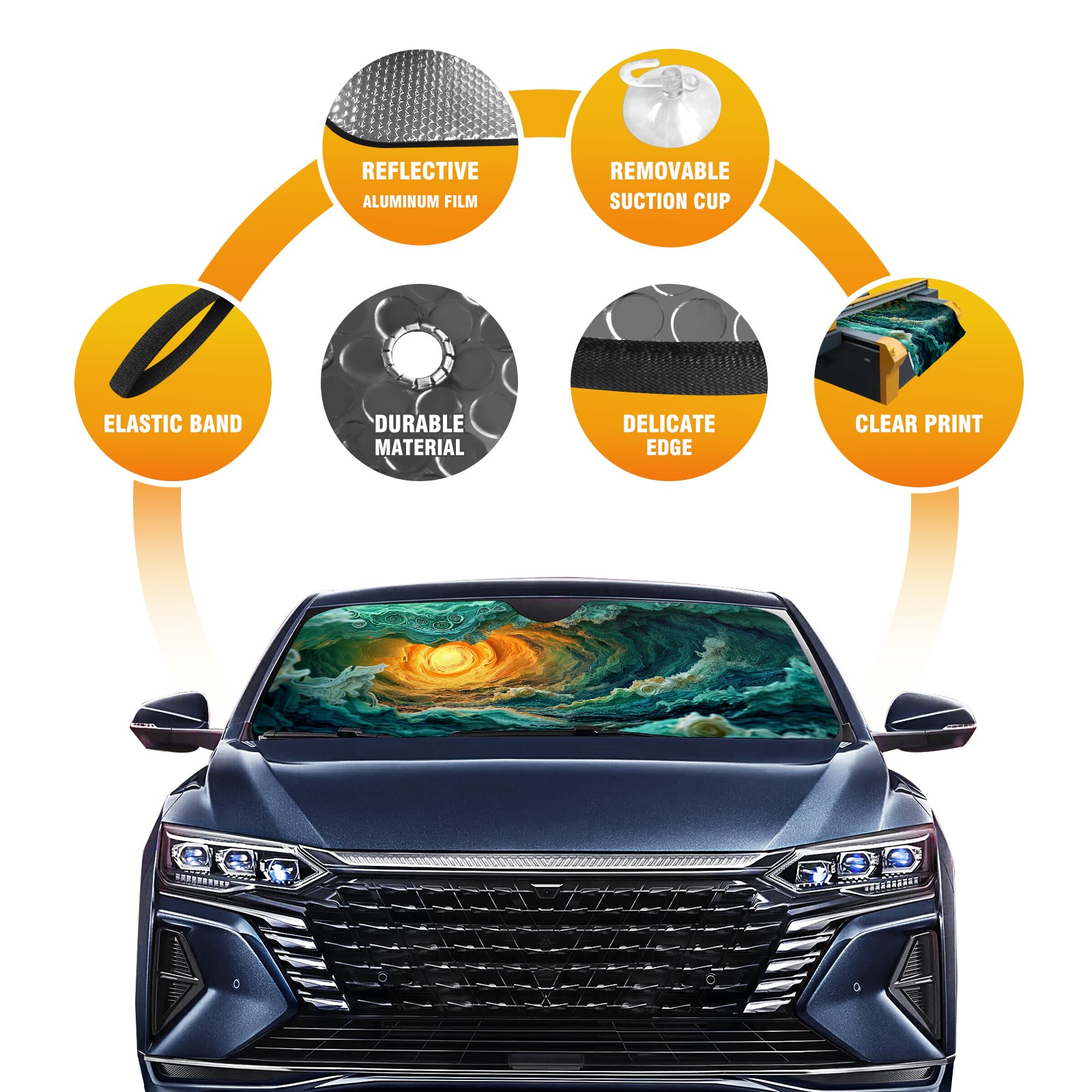 Diameter /Size 63"L x 33.5"W</b><br> Made from excellent materials which makes it sturdy and protects the car from the sun. Easy to use and pack. Makes the interior of the car cooler.You can easily stash the sunshade in the storage bag or store long term.It open and closes easy. Also the leather storage bag is durable and easy to put the umbrella back into.This windshield sunshade provides complete coverage and keeps your car interior cool under direct sun. It is easy to open and position under the windshield and around the rear-view mirror. Makes Your Car Easy To Identify, Perfect For Finding Your Car In Crowded Parking Lots And Garages.Great Choice: It Is A Great Gift For Dad, Boyfriend, Brother, Brother And Uncle, Friends, Classmates, Family And So On.<br> Notice:</b><br> Due To Difference Computer Monitors, The Color Maybe Slightly Different From Picture. As Different Measurement Methods, Measurement Data Will Float Within 2%.I Hope You Understand.<br> If You Have Any Question About The Item Please Do Not Hesitate To Contact Us Immediately And We Will Give You A Satisfactory Reply Within 24 Hours.