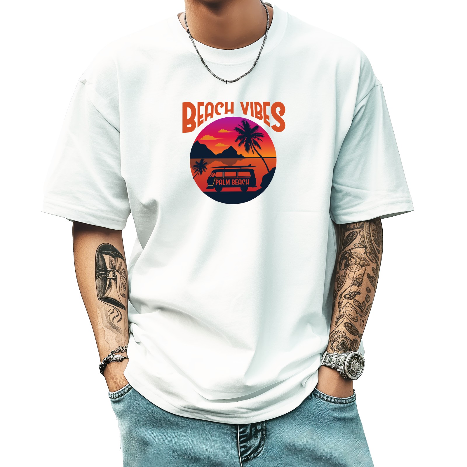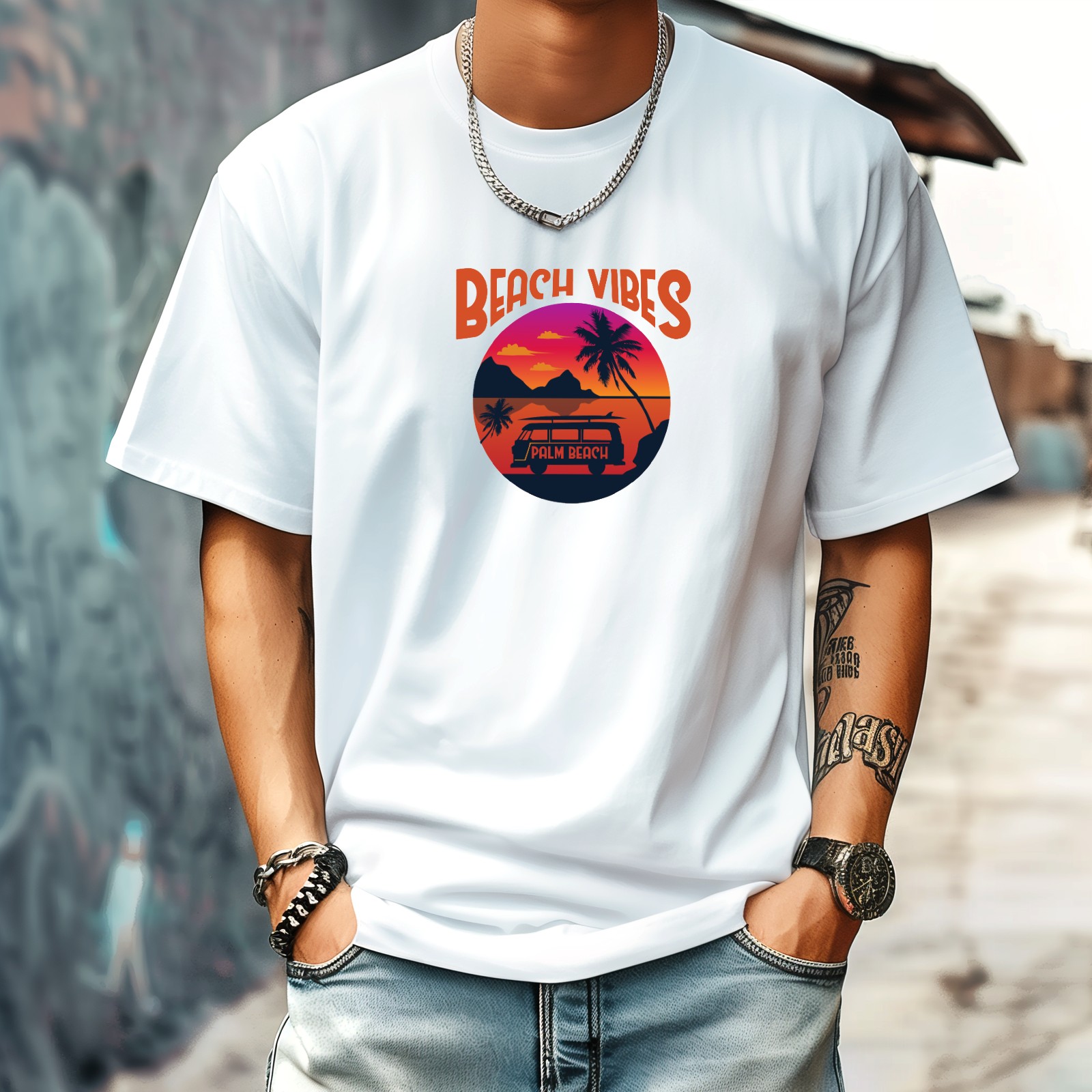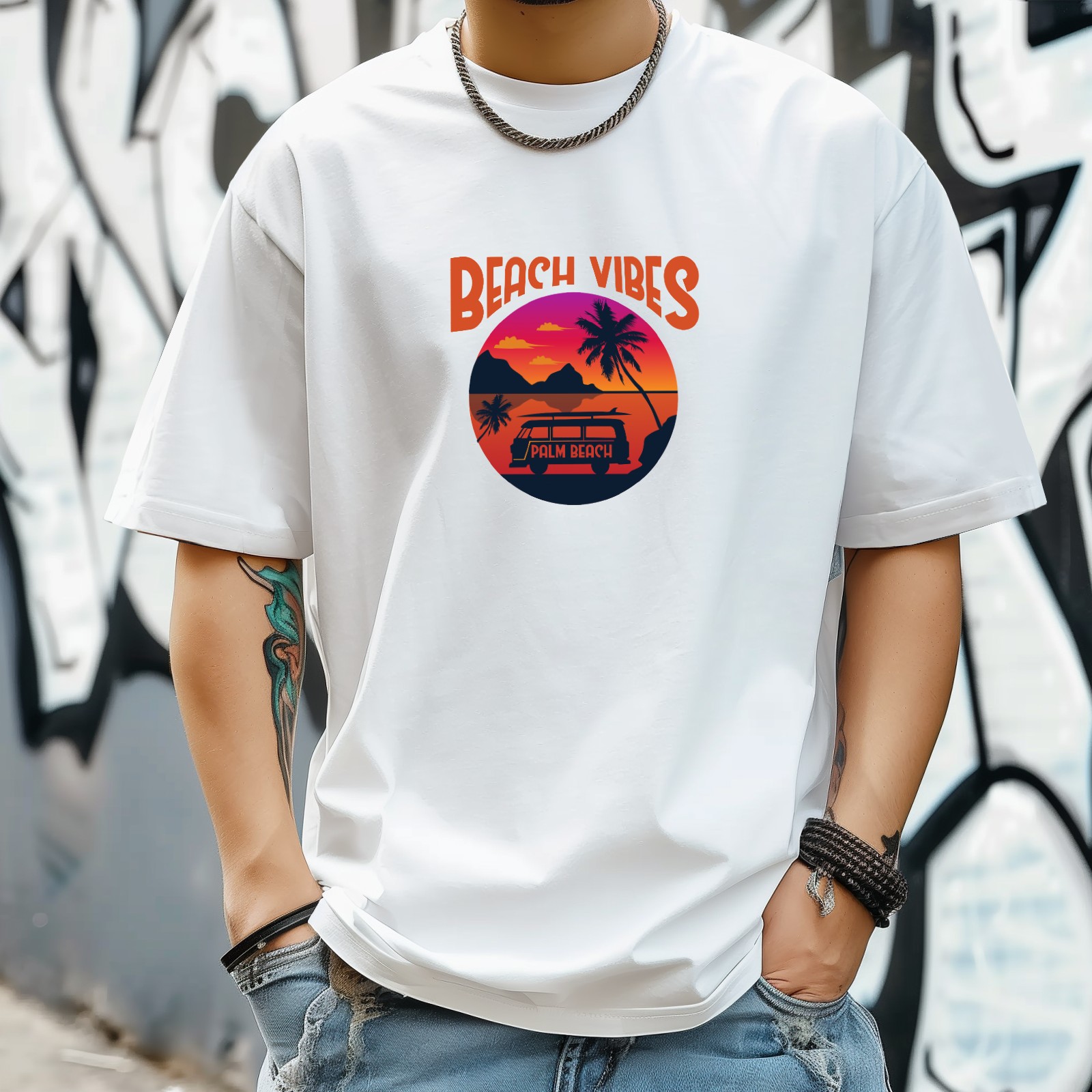 Beach Vibes T-Shirt for Man Tops Short Sleeves Shirt Crew Neck Shirt XS