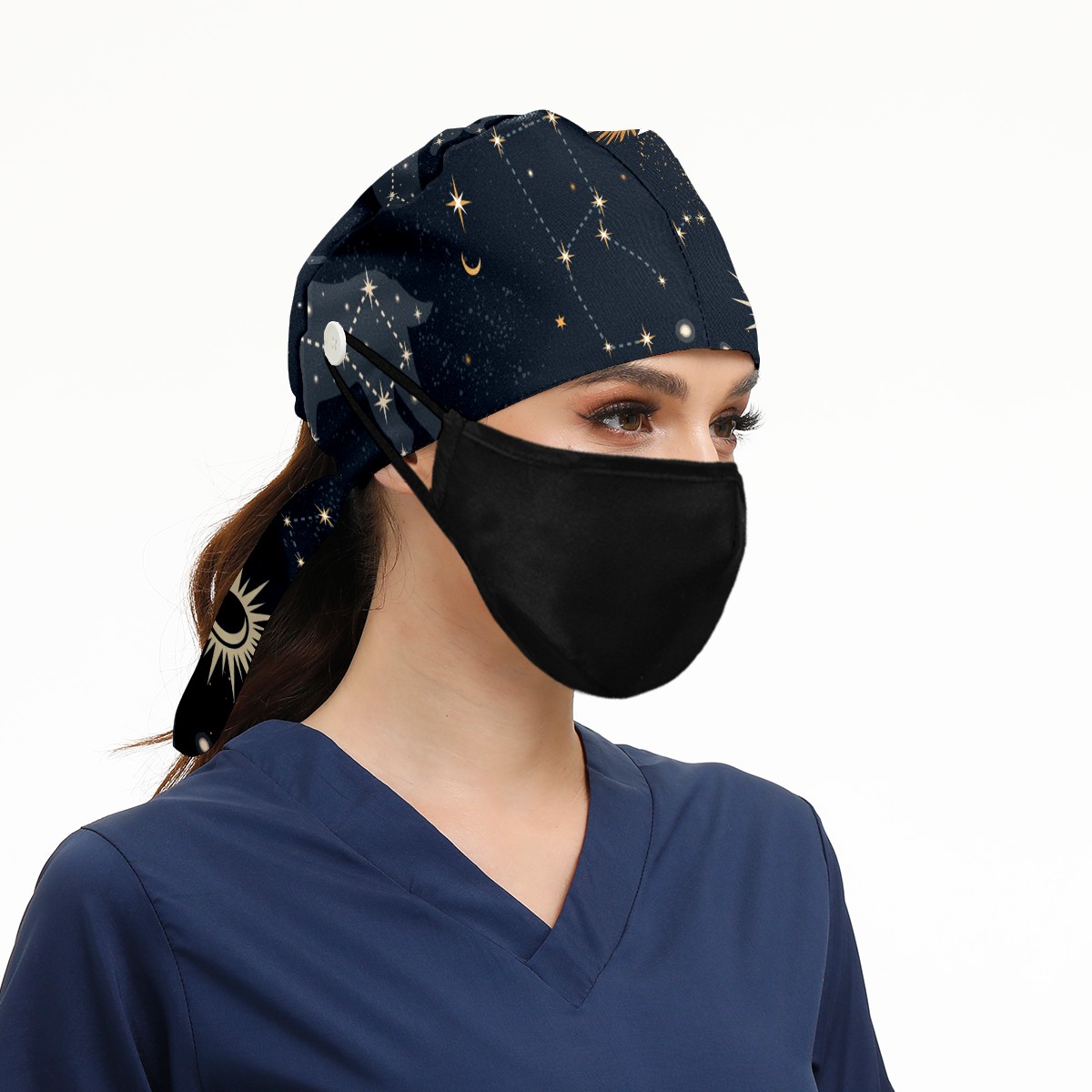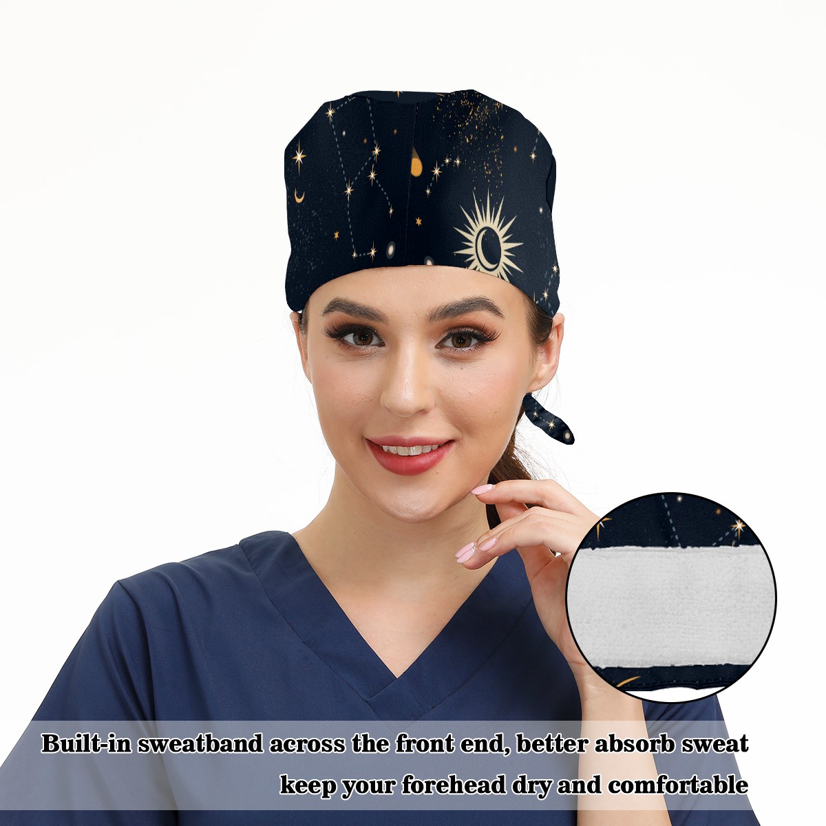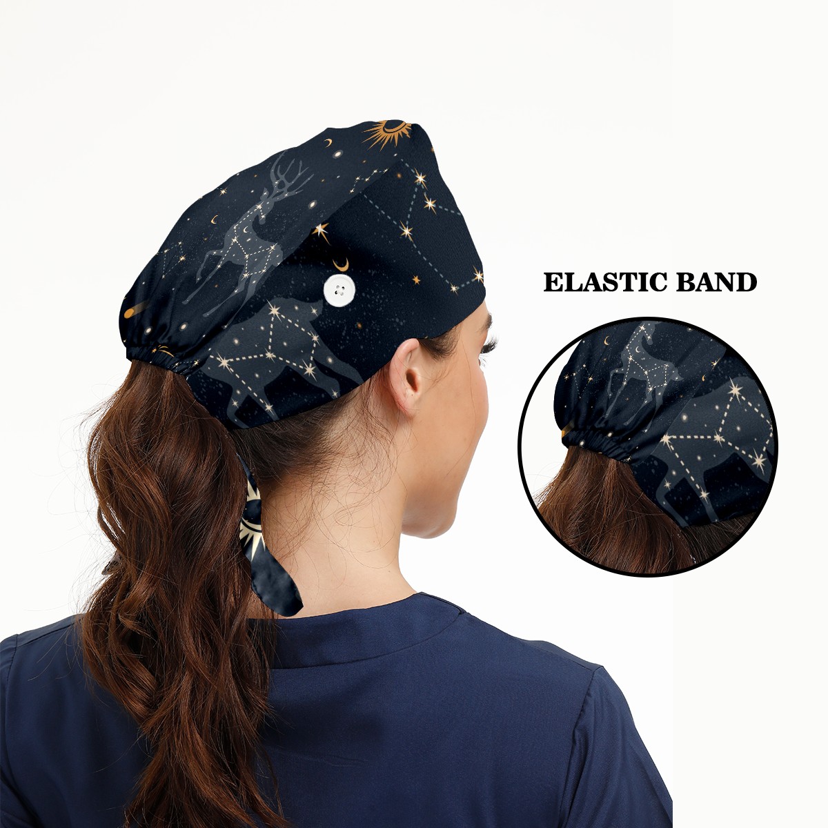 Working Caps with Button & Sweatband Satin Lined Cotton Adjustable Nurse Hats Elastic Band Scrub Cap Surgeon Hat Cosmic Deer Moon Star