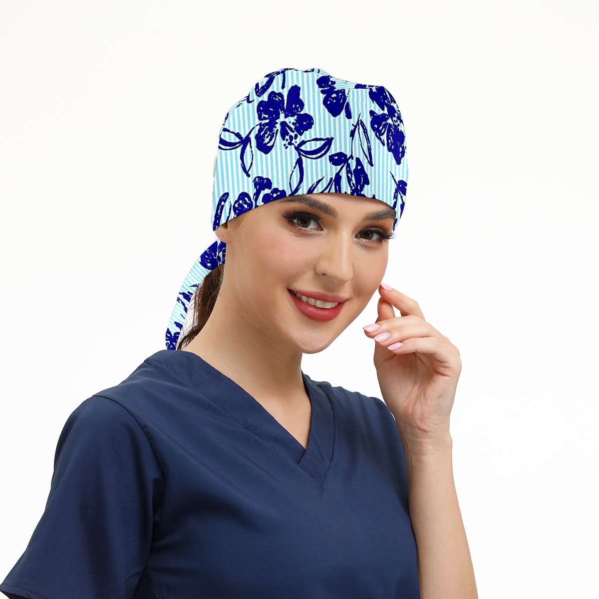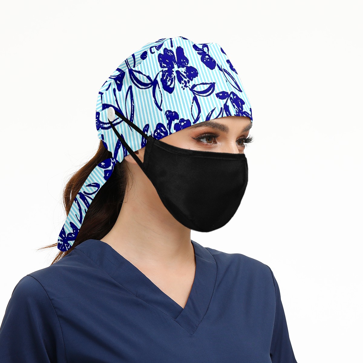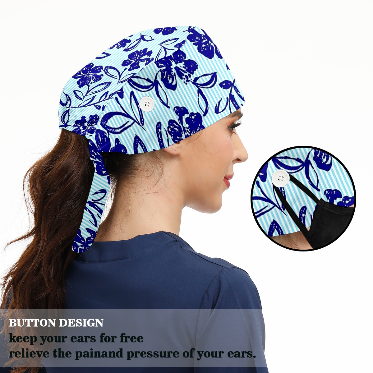 Working Caps with Button & Sweatband Satin Lined Cotton Adjustable Nurse Hats Elastic Band Scrub Cap Surgeon Hat Flower Print
