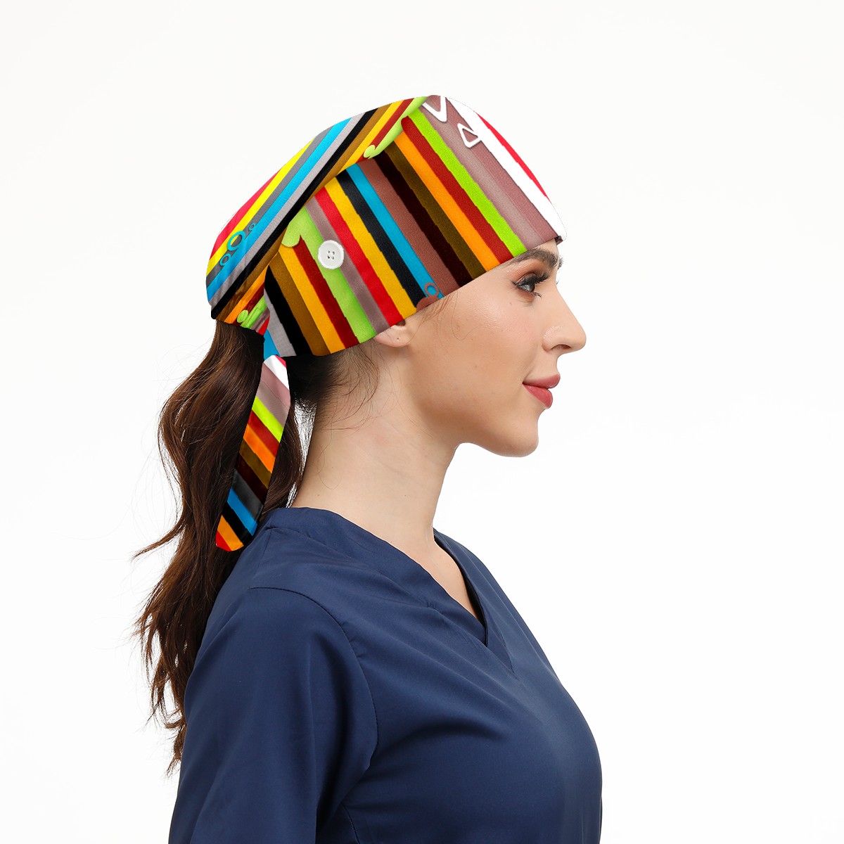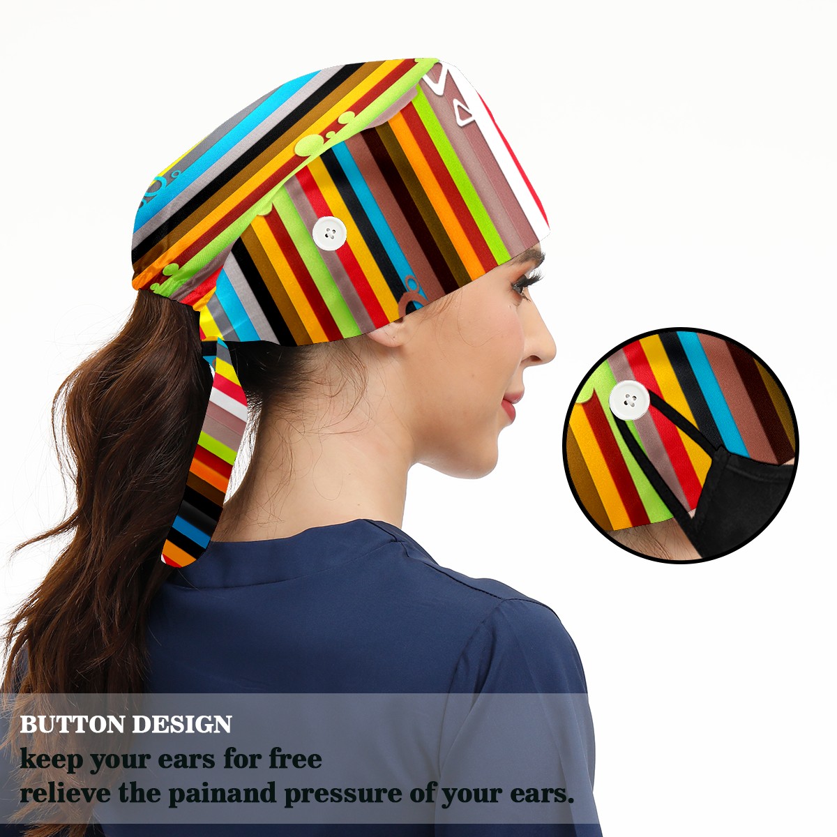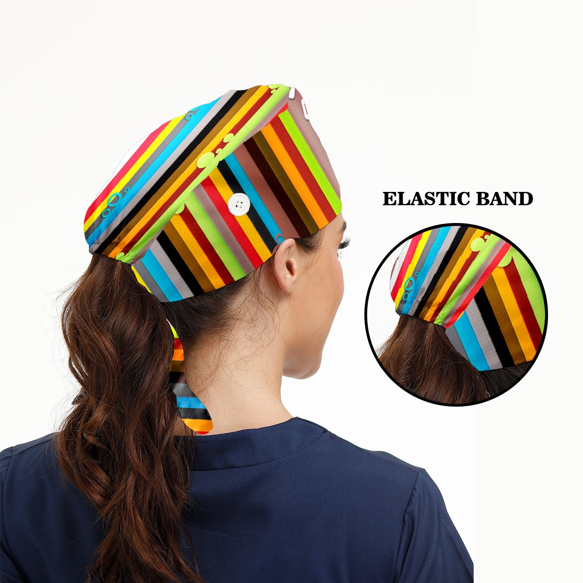 Working Caps with Button & Sweatband Satin Lined Cotton Adjustable Nurse Hats Elastic Band Scrub Cap Surgeon Hat Rainbow Stripes