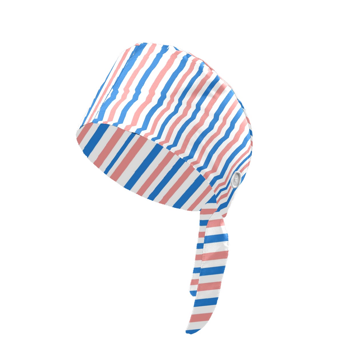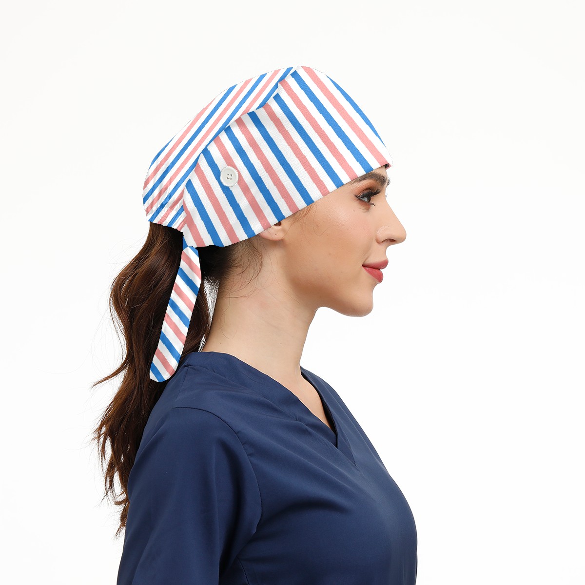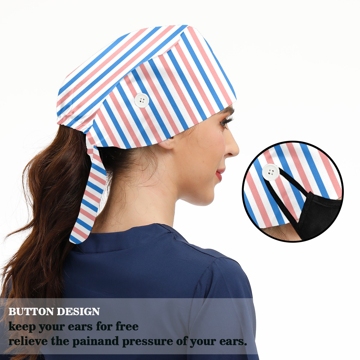 Working Caps with Button & Sweatband Satin Lined Cotton Adjustable Nurse Hats Elastic Band Scrub Cap Surgeon Hat Stripe