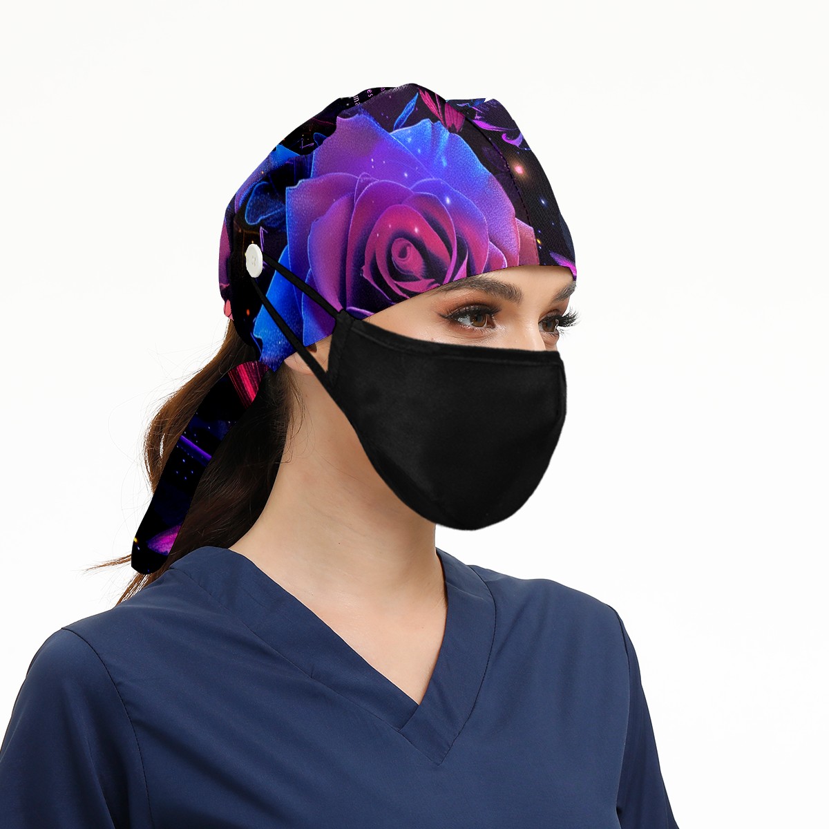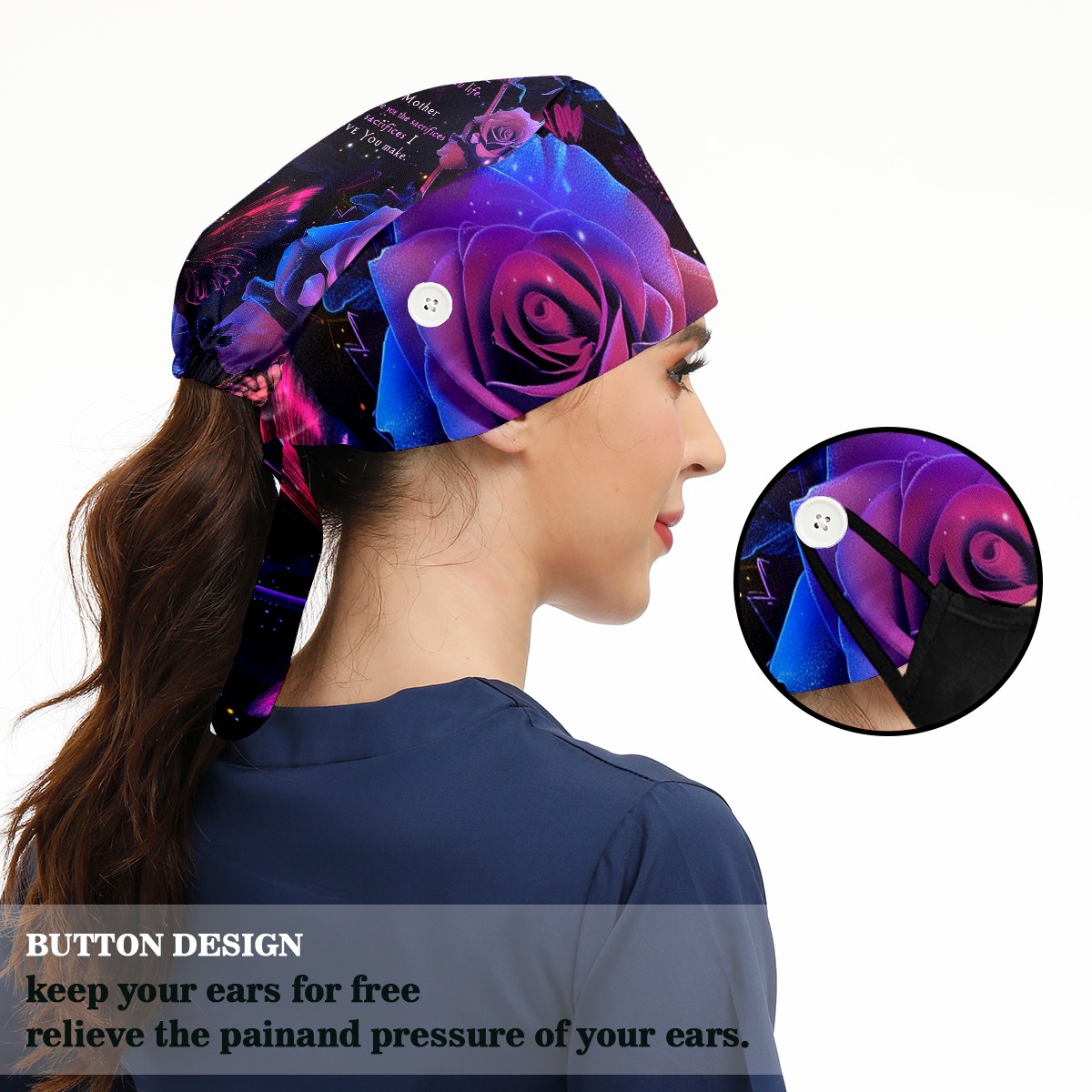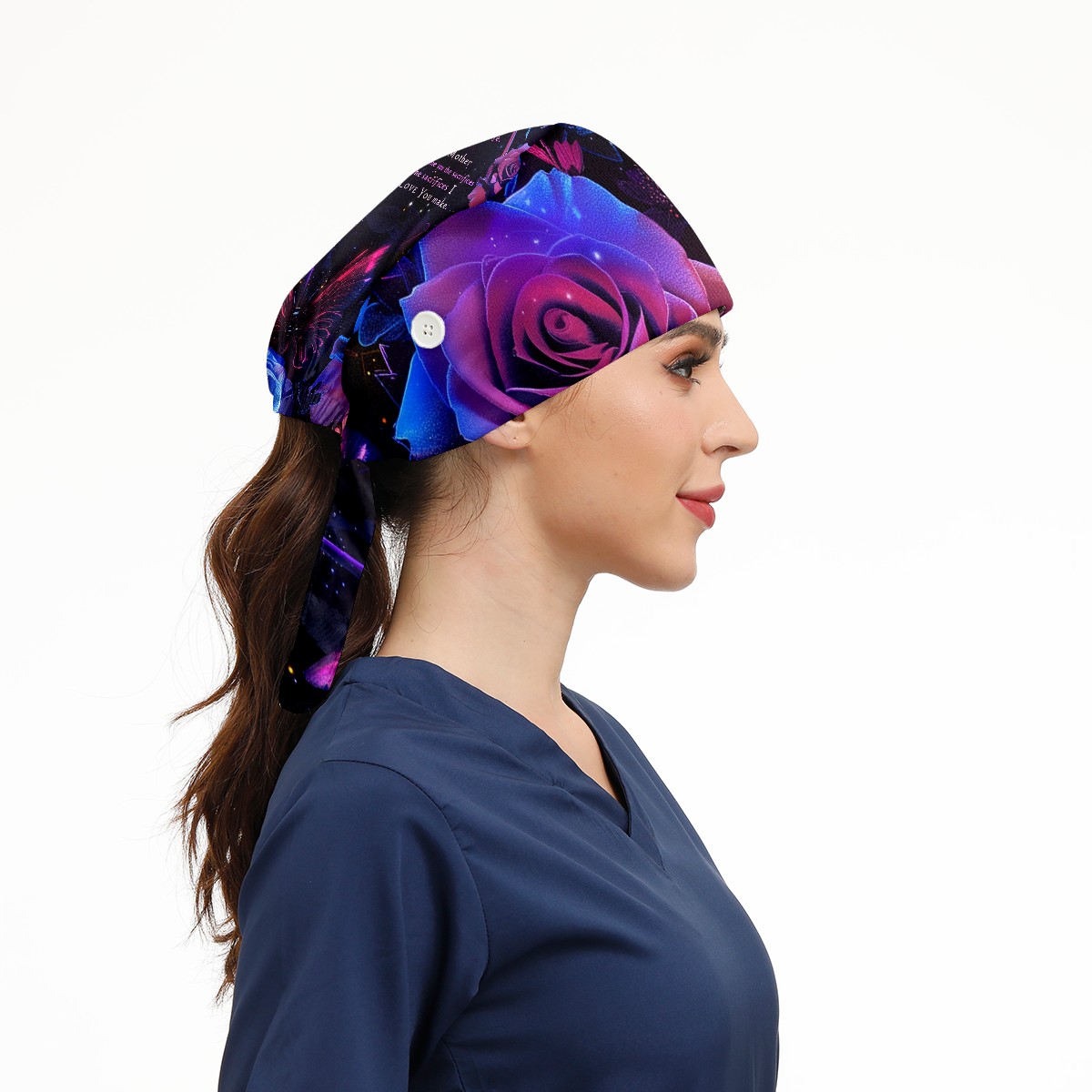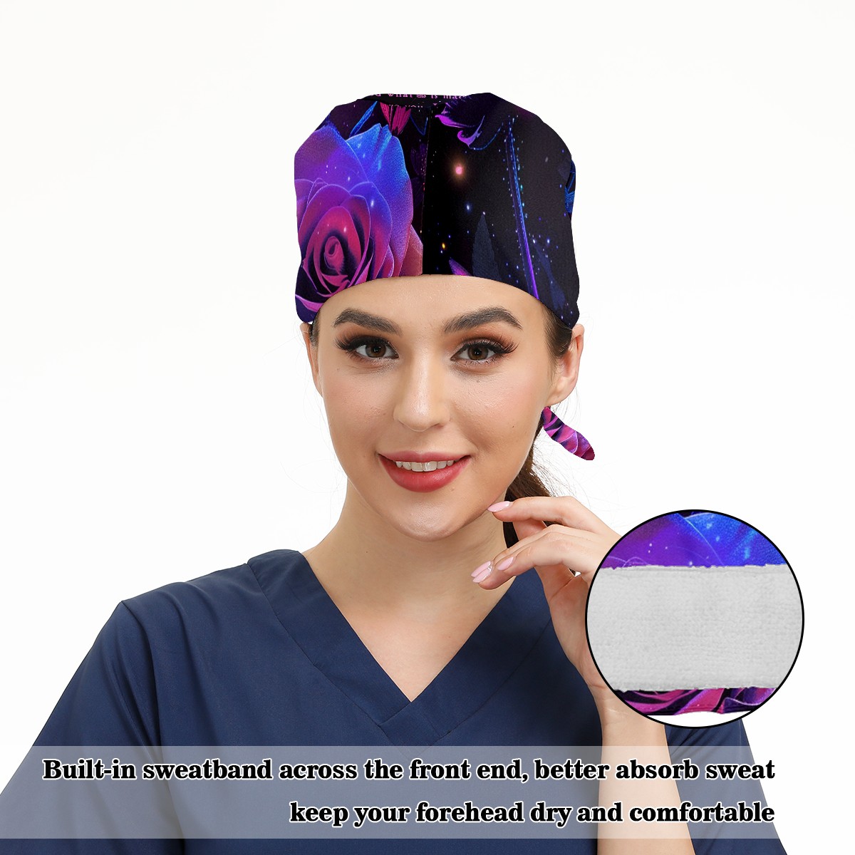 Working Caps with Button & Sweatband Satin Lined Cotton Adjustable Nurse Hats Elastic Band Scrub Cap Surgeon Hat Flower