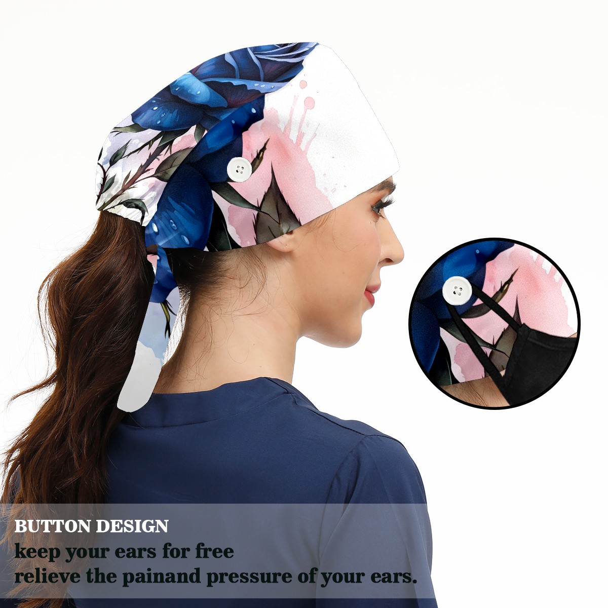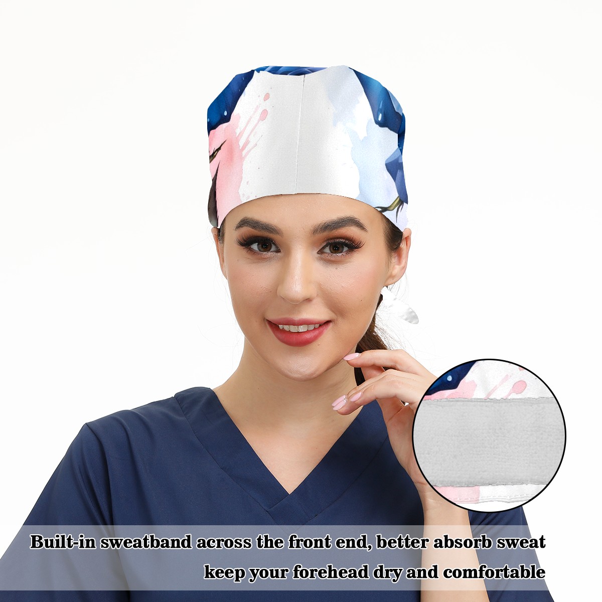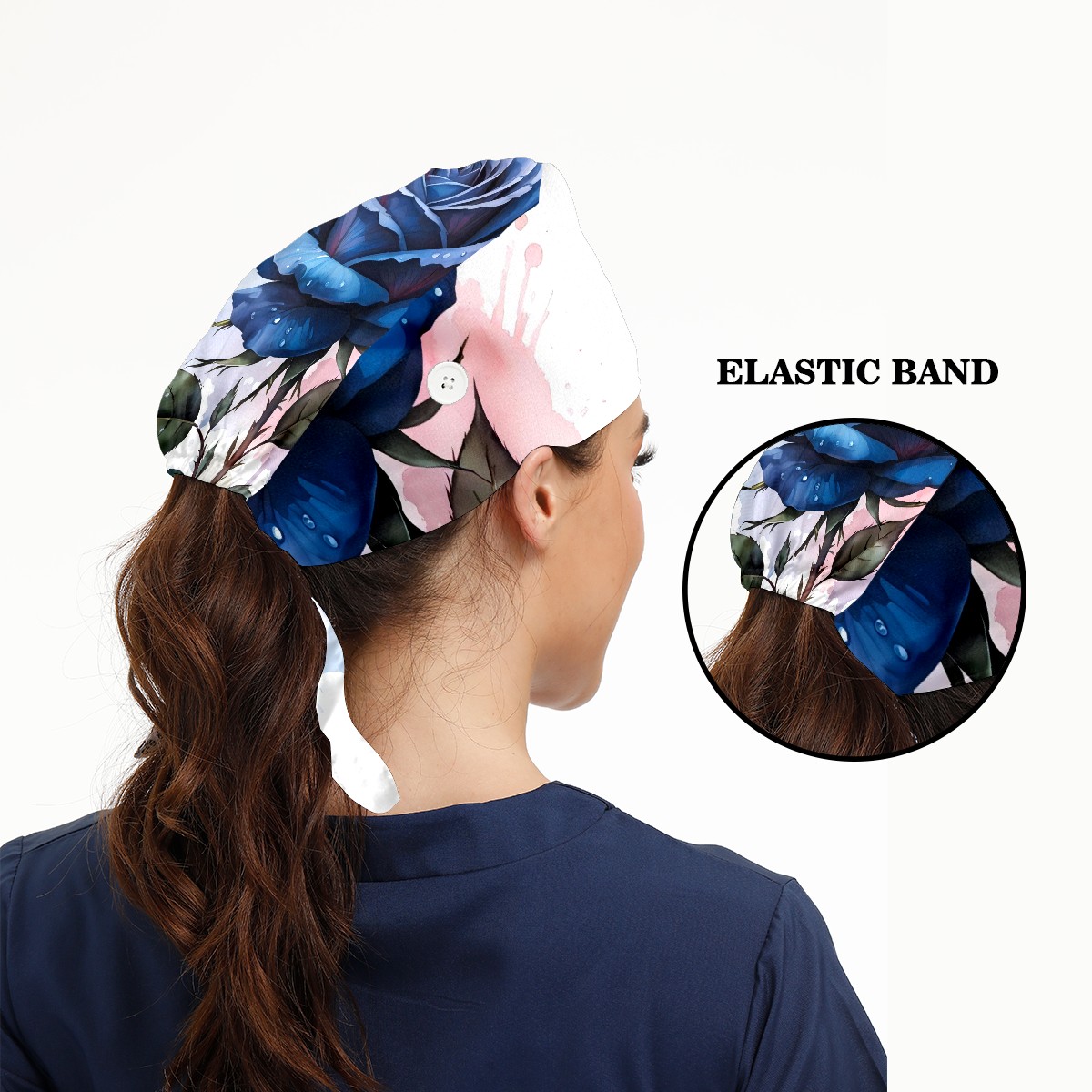 Working Caps with Button & Sweatband Satin Lined Cotton Adjustable Nurse Hats Elastic Band Scrub Cap Surgeon Hat Rose