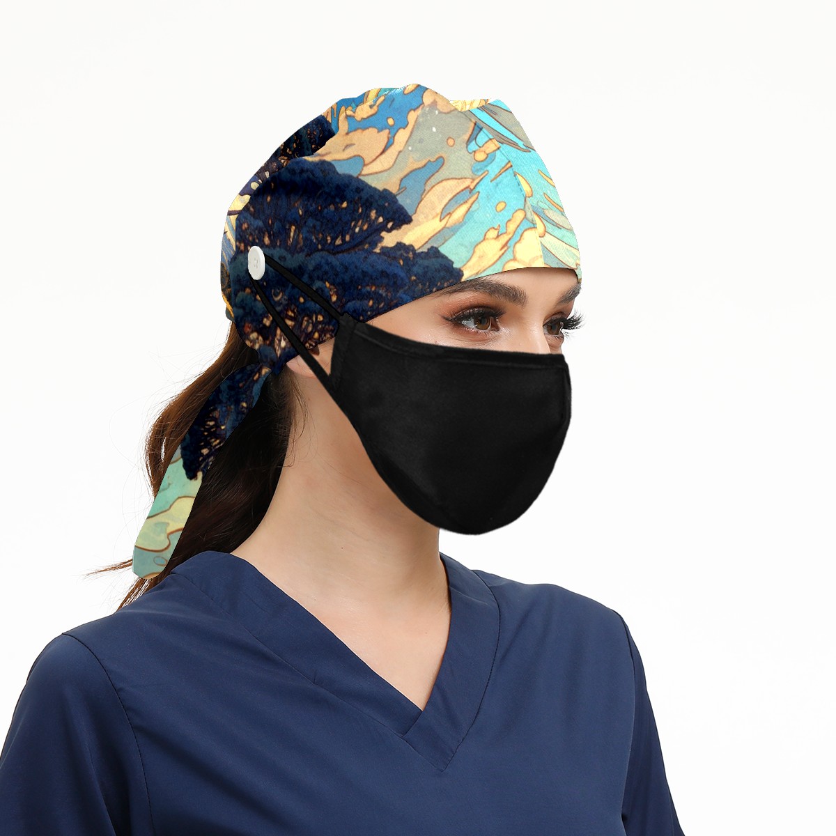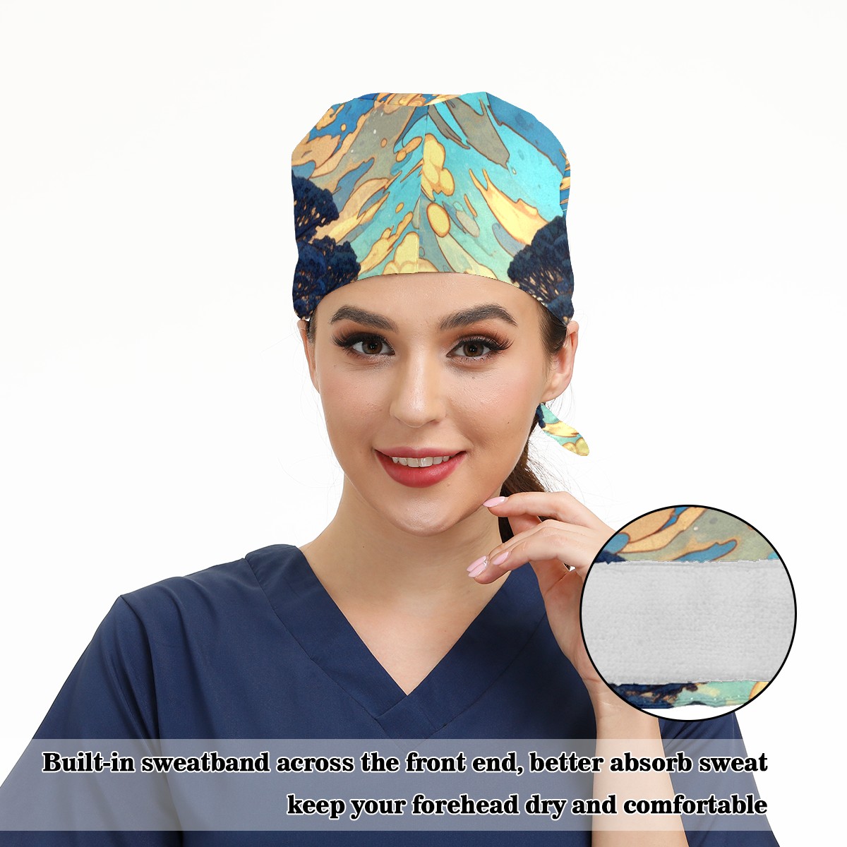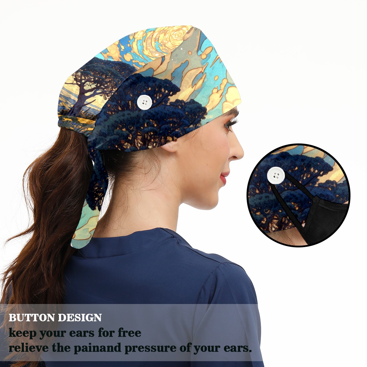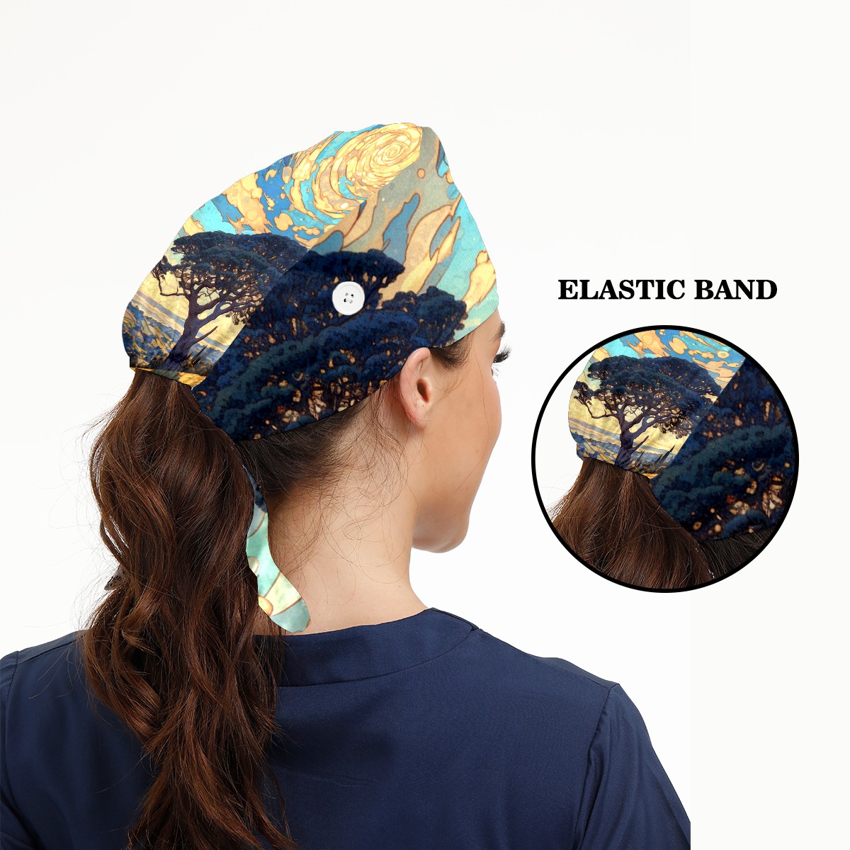 Working Caps with Button & Sweatband Satin Lined Cotton Adjustable Nurse Hats Elastic Band Scrub Cap Surgeon Hat Tree
