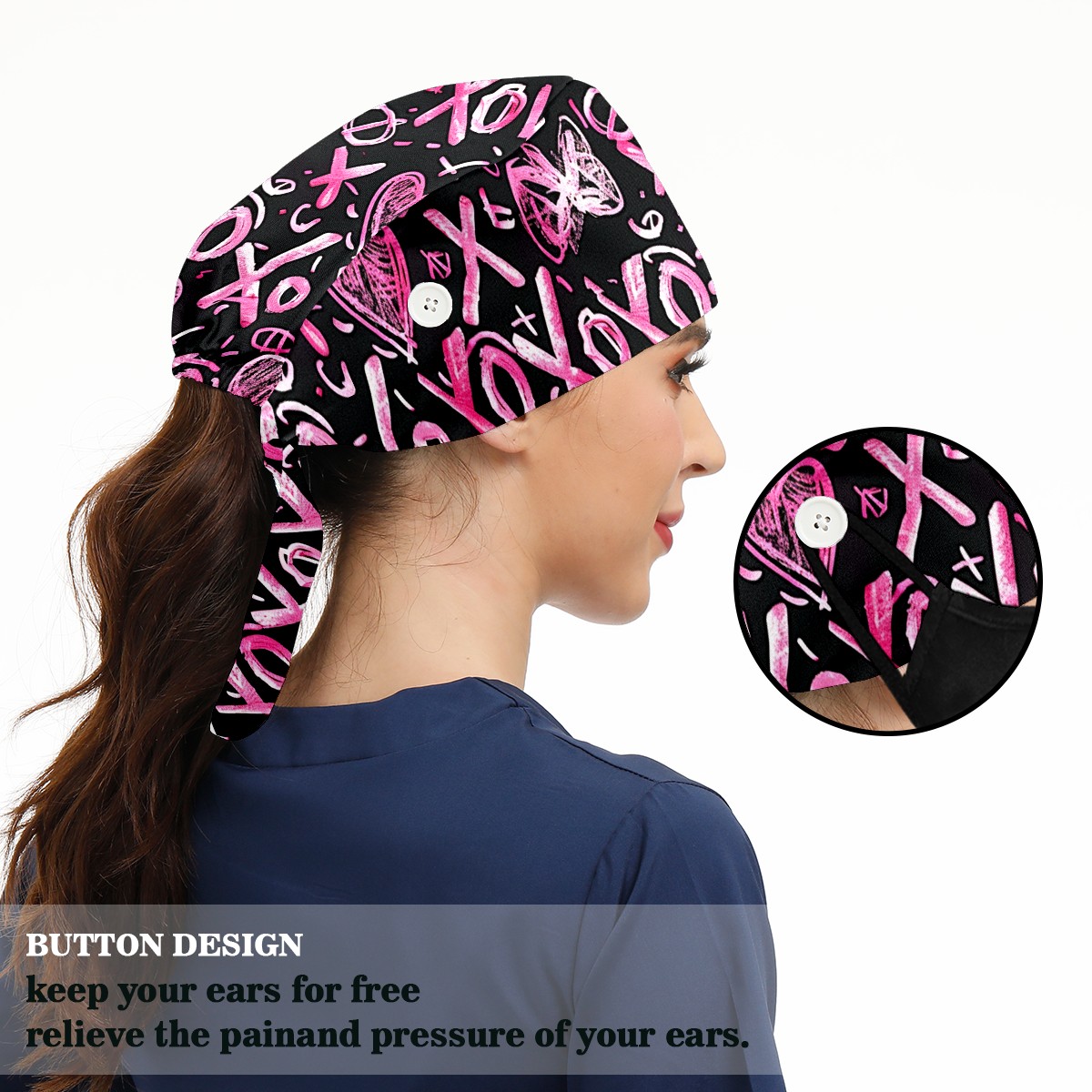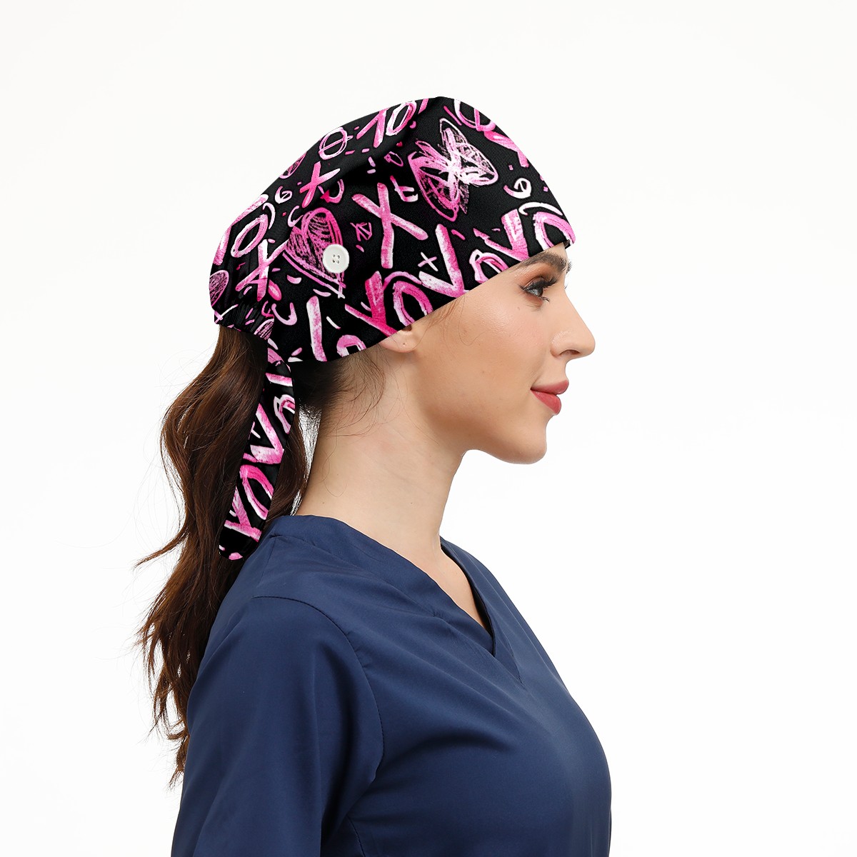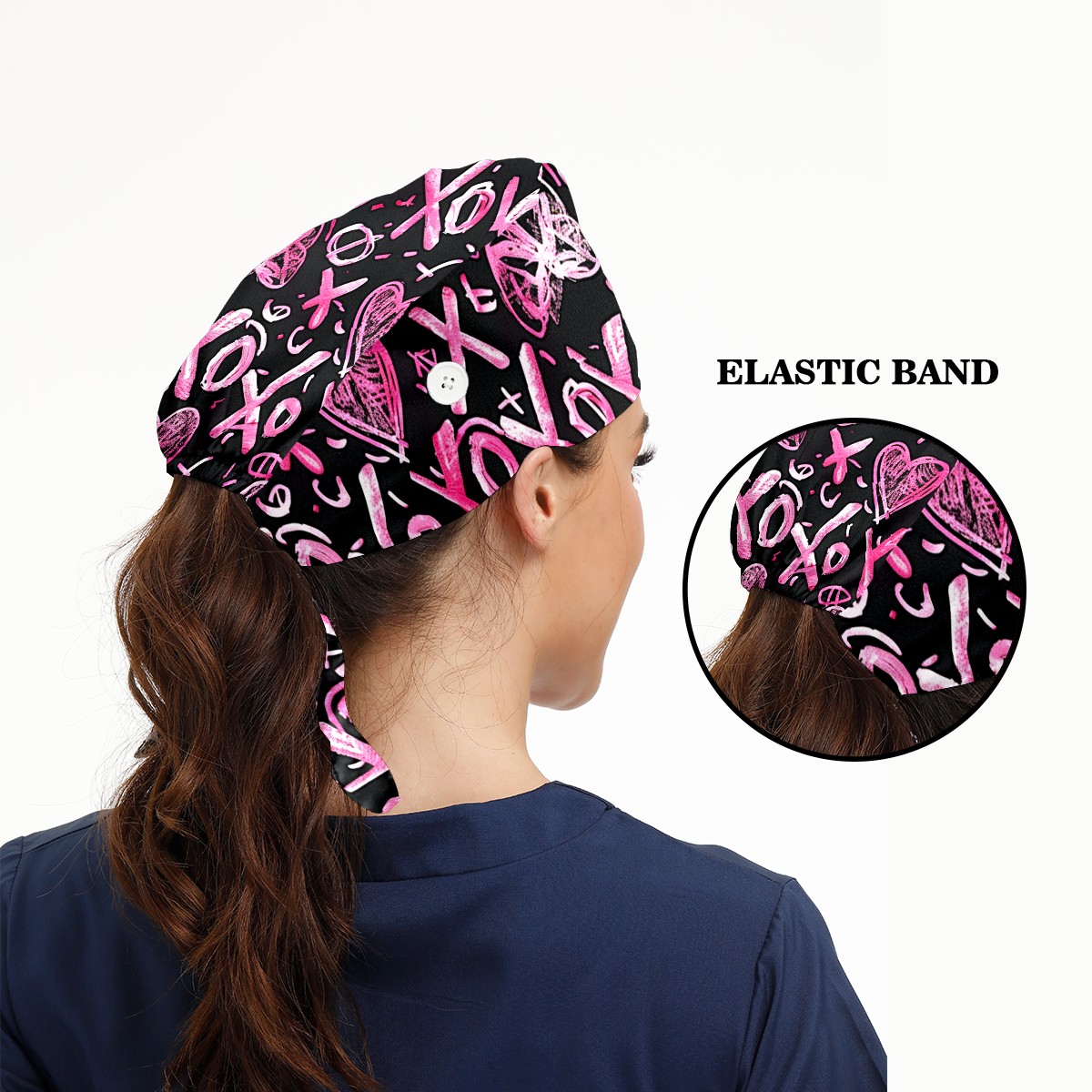 Working Caps with Button & Sweatband Satin Lined Cotton Adjustable Nurse Hats Elastic Band Scrub Cap Surgeon Hat Love