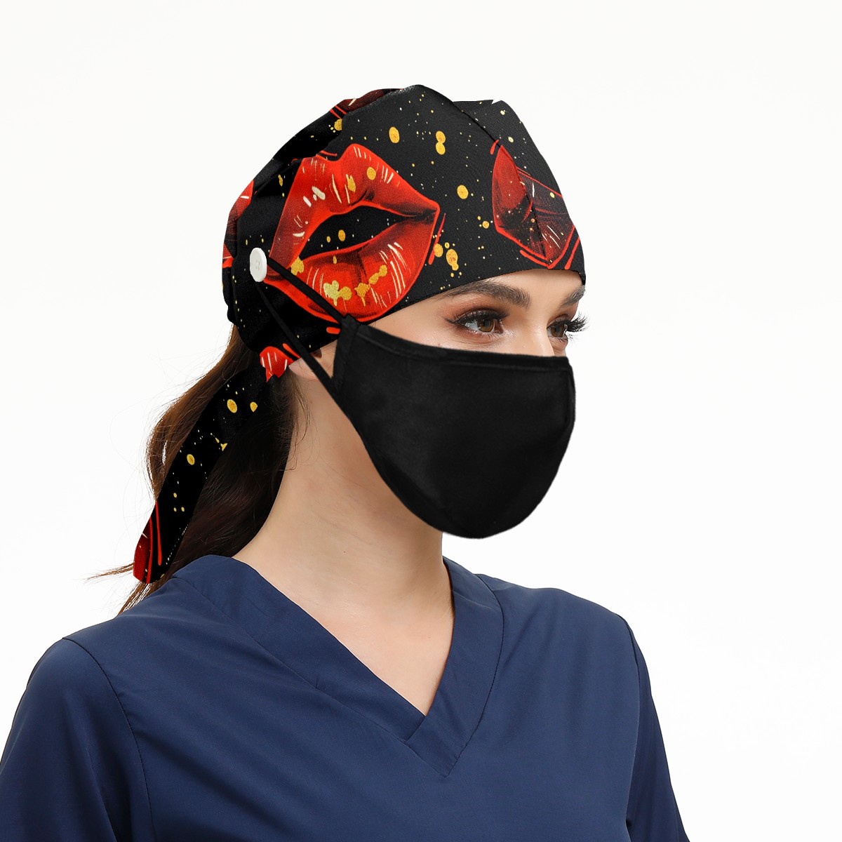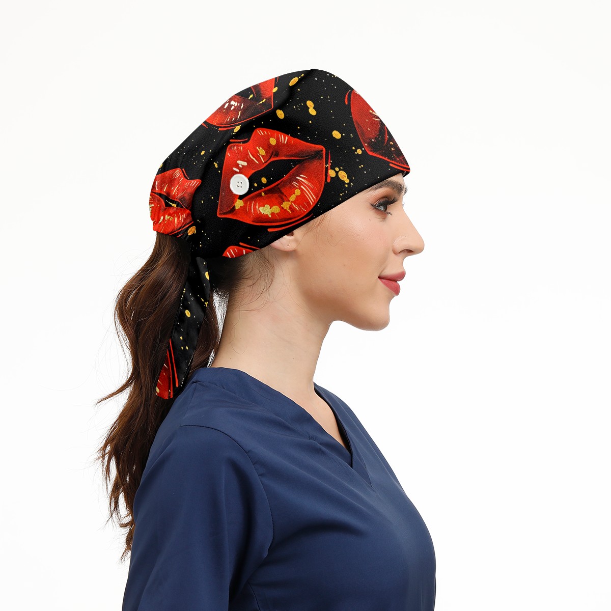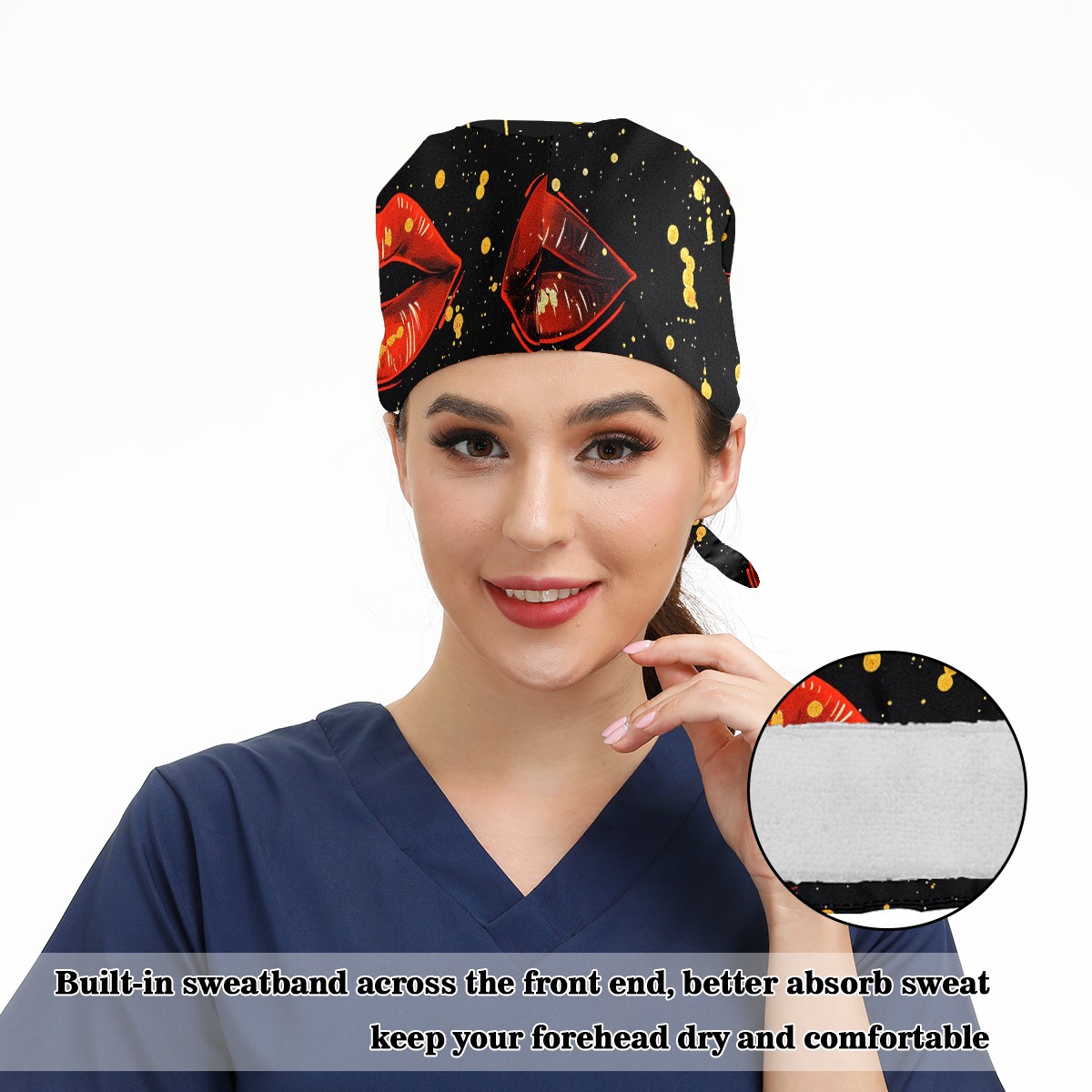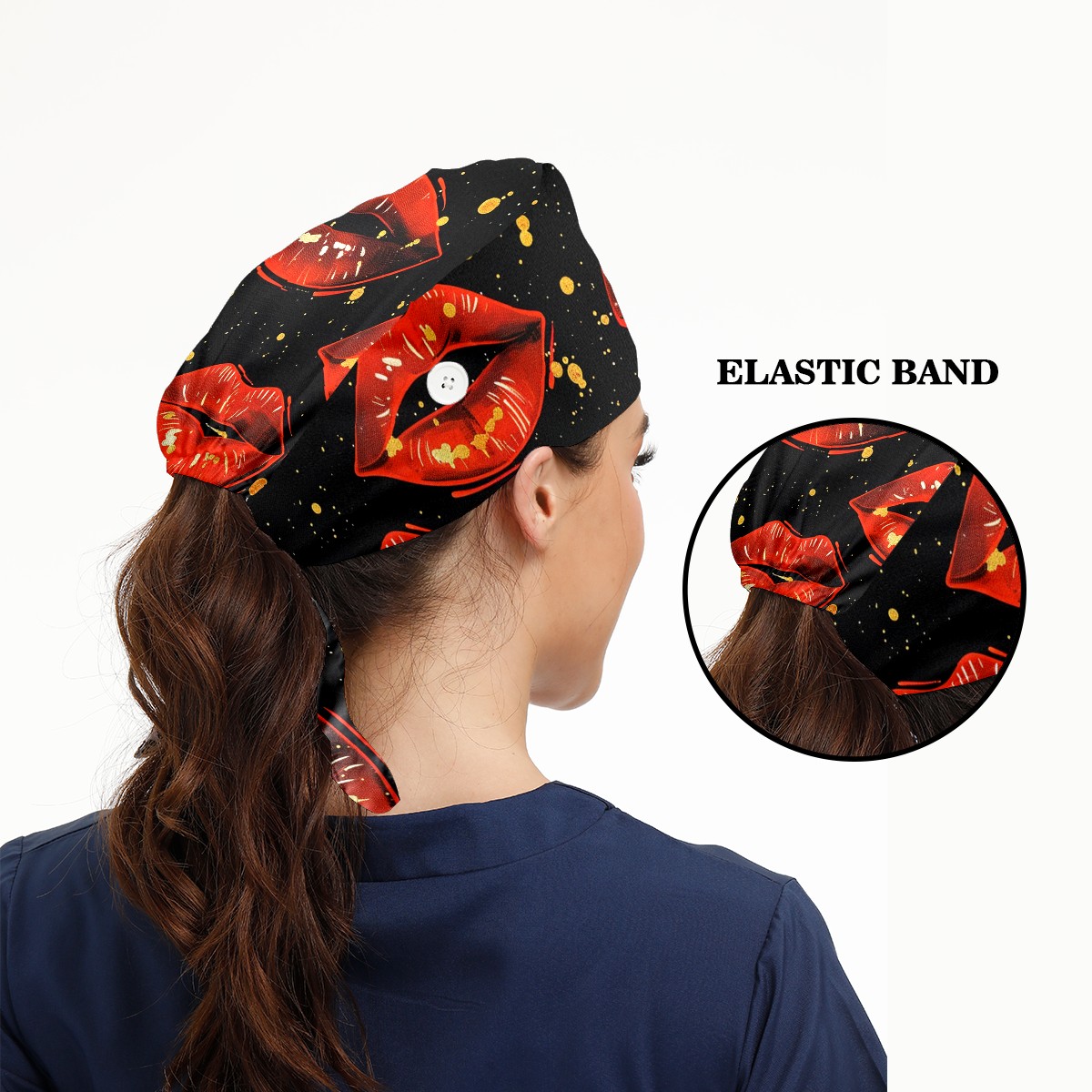 Working Caps with Button & Sweatband Satin Lined Cotton Adjustable Nurse Hats Elastic Band Scrub Cap Surgeon Hat Red Lips