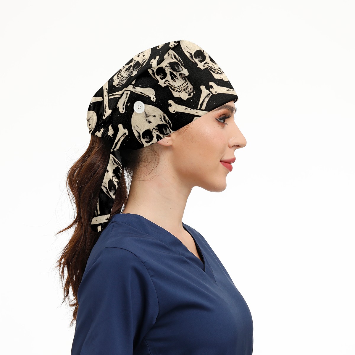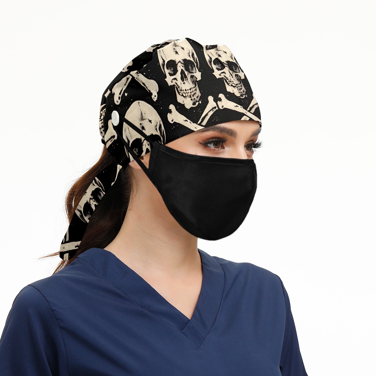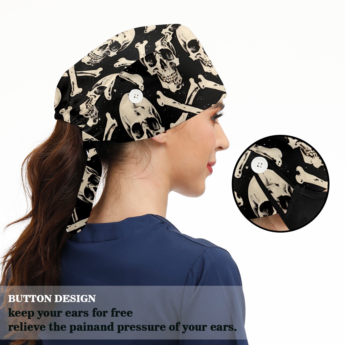 Working Caps with Button & Sweatband Satin Lined Cotton Adjustable Nurse Hats Elastic Band Scrub Cap Surgeon Hat Skull Head