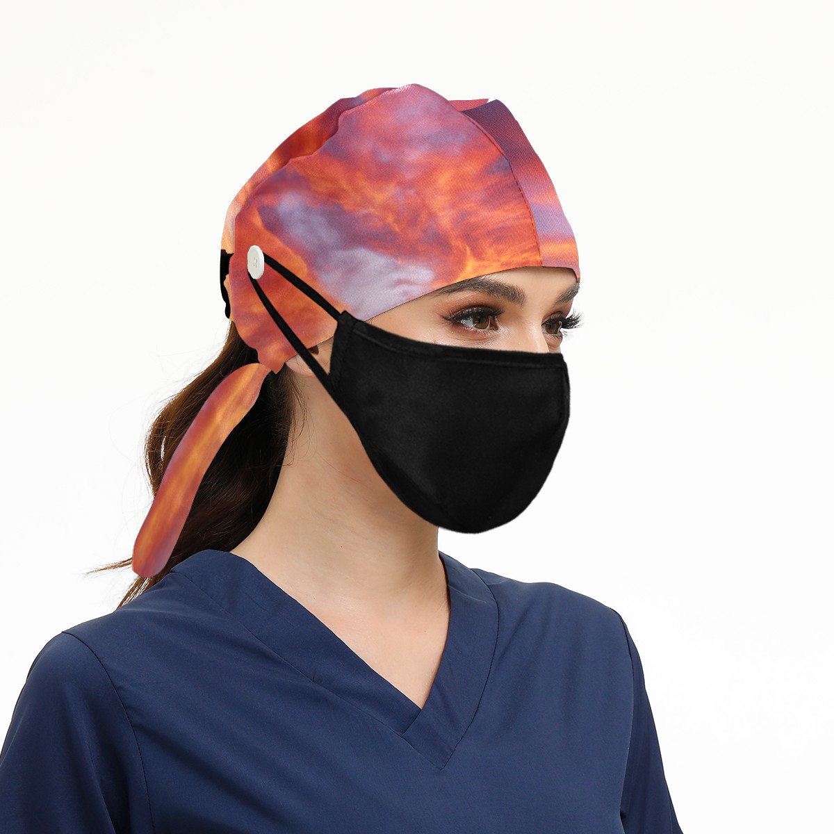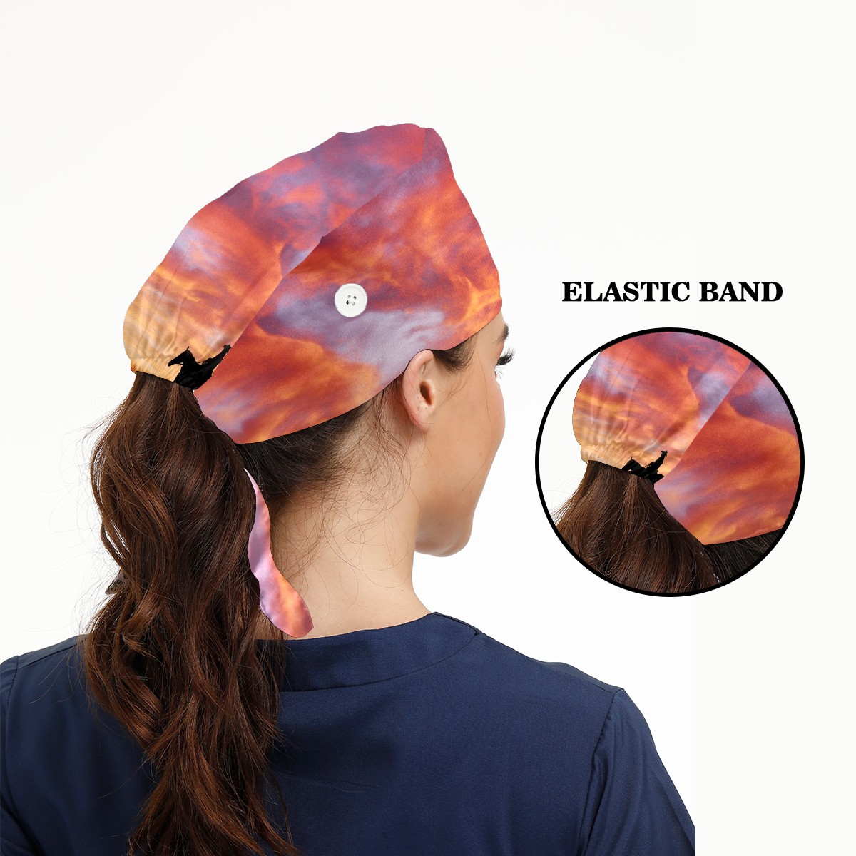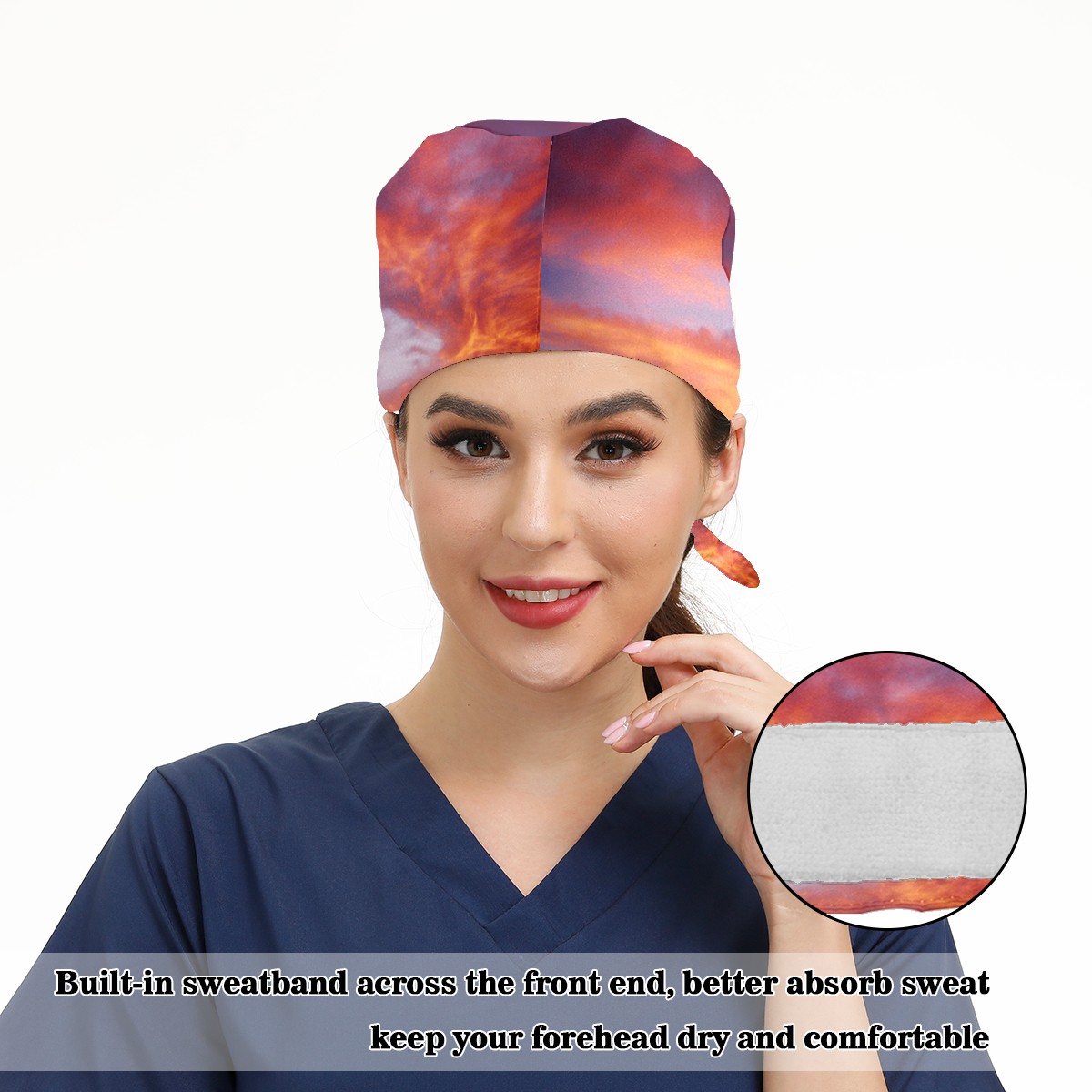 Working Caps with Button & Sweatband Satin Lined Cotton Adjustable Nurse Hats Elastic Band Scrub Cap Surgeon Hat Sunset