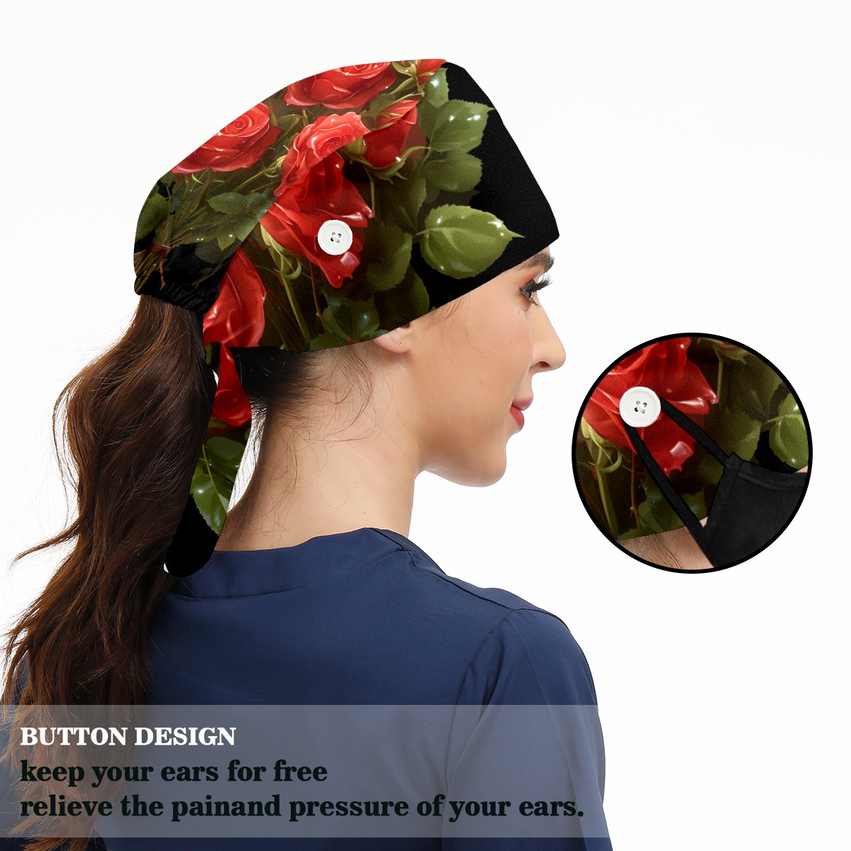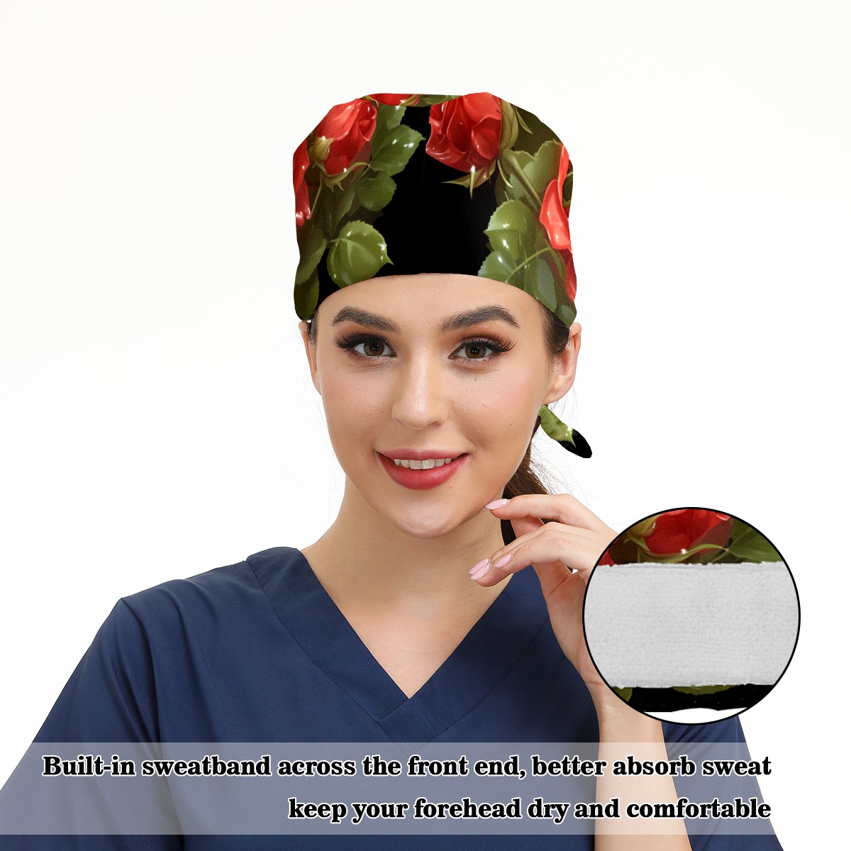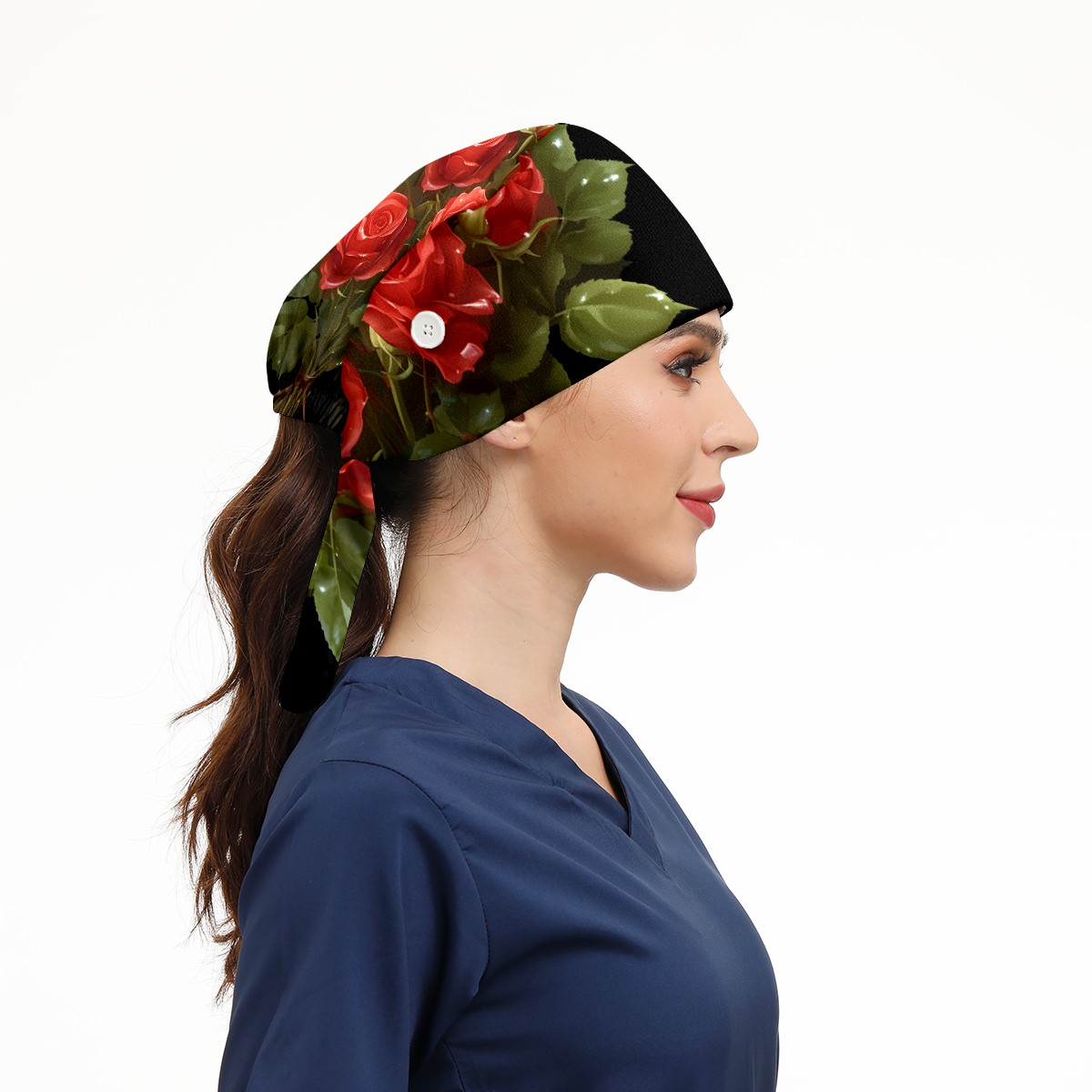 Working Caps with Button & Sweatband Satin Lined Cotton Adjustable Nurse Hats Elastic Band Scrub Cap Surgeon Hat Roses3