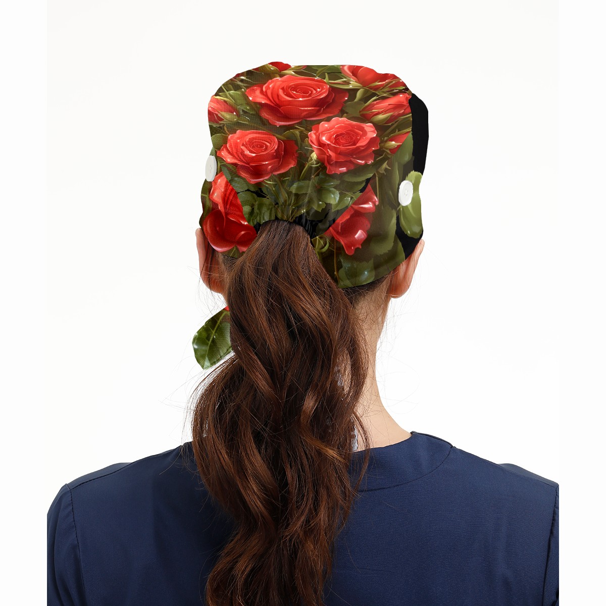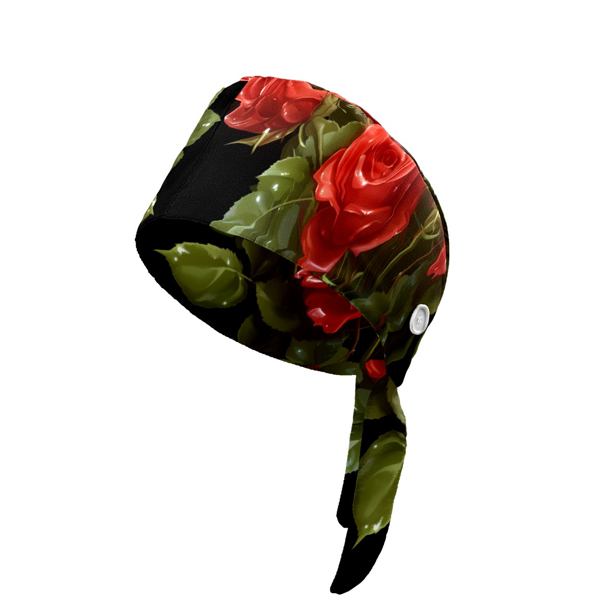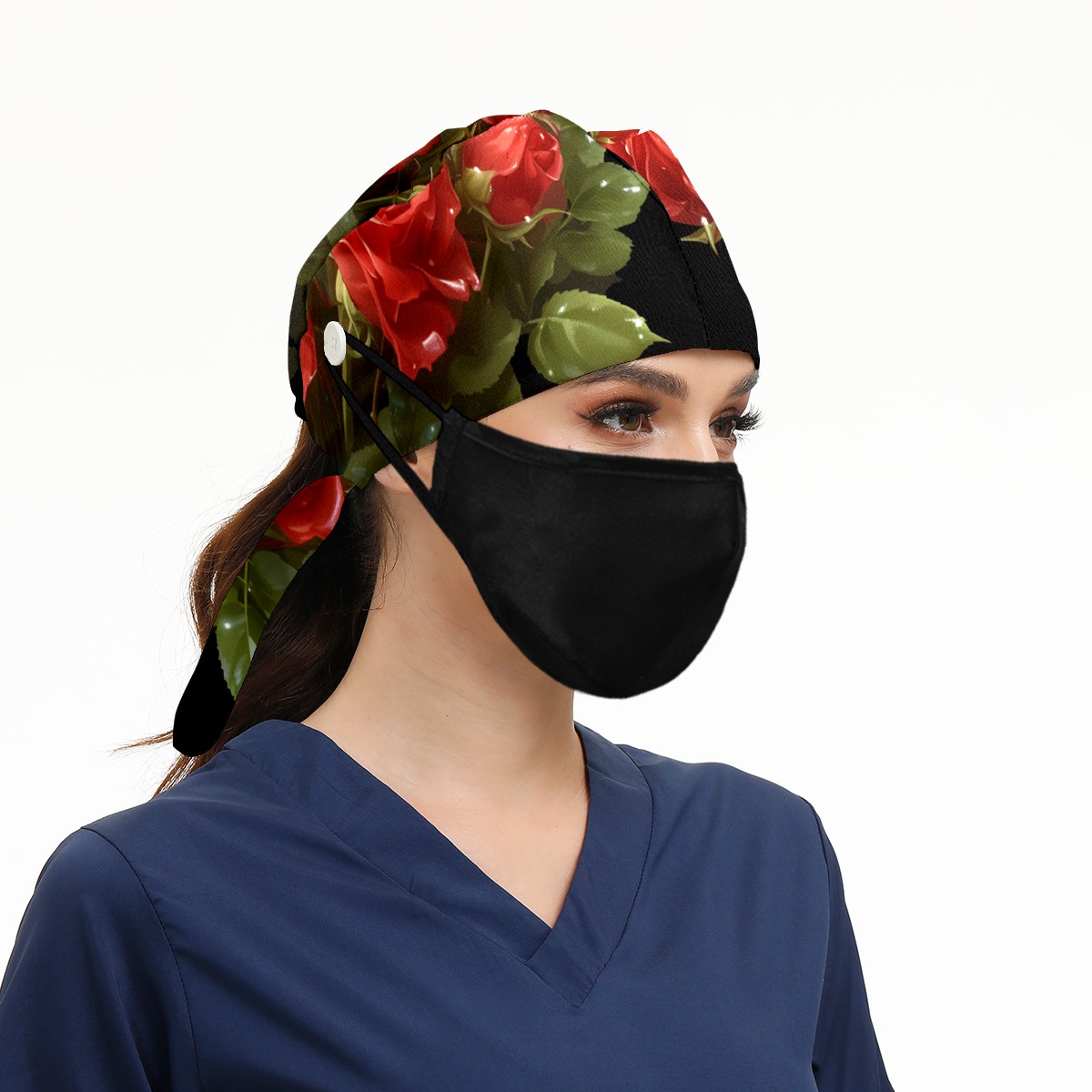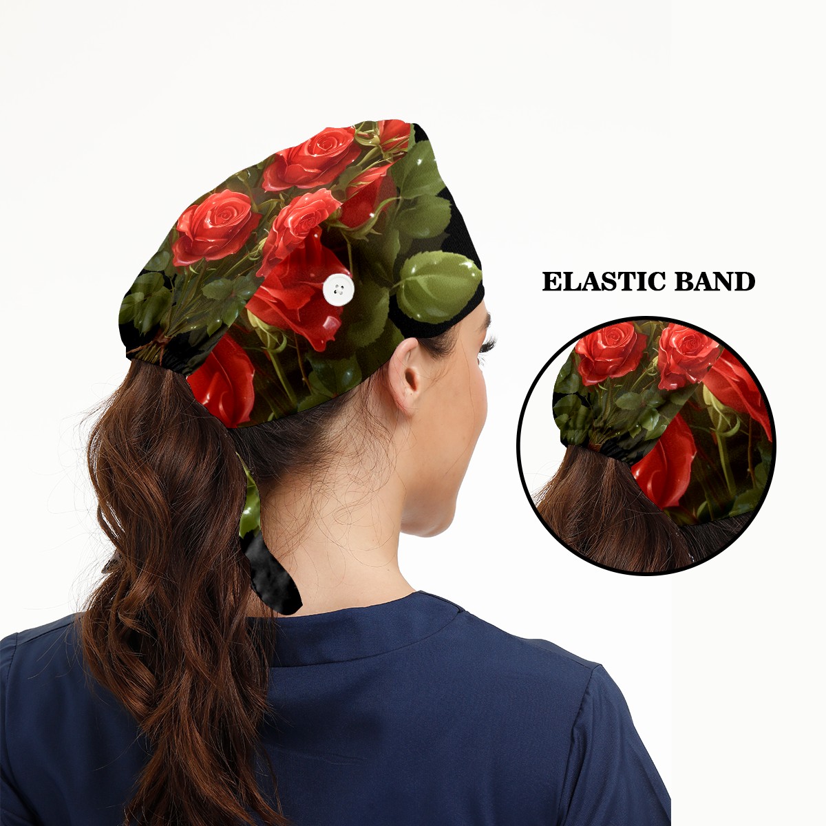 Working Caps with Button & Sweatband Satin Lined Cotton Adjustable Nurse Hats Elastic Band Scrub Cap Surgeon Hat Roses3